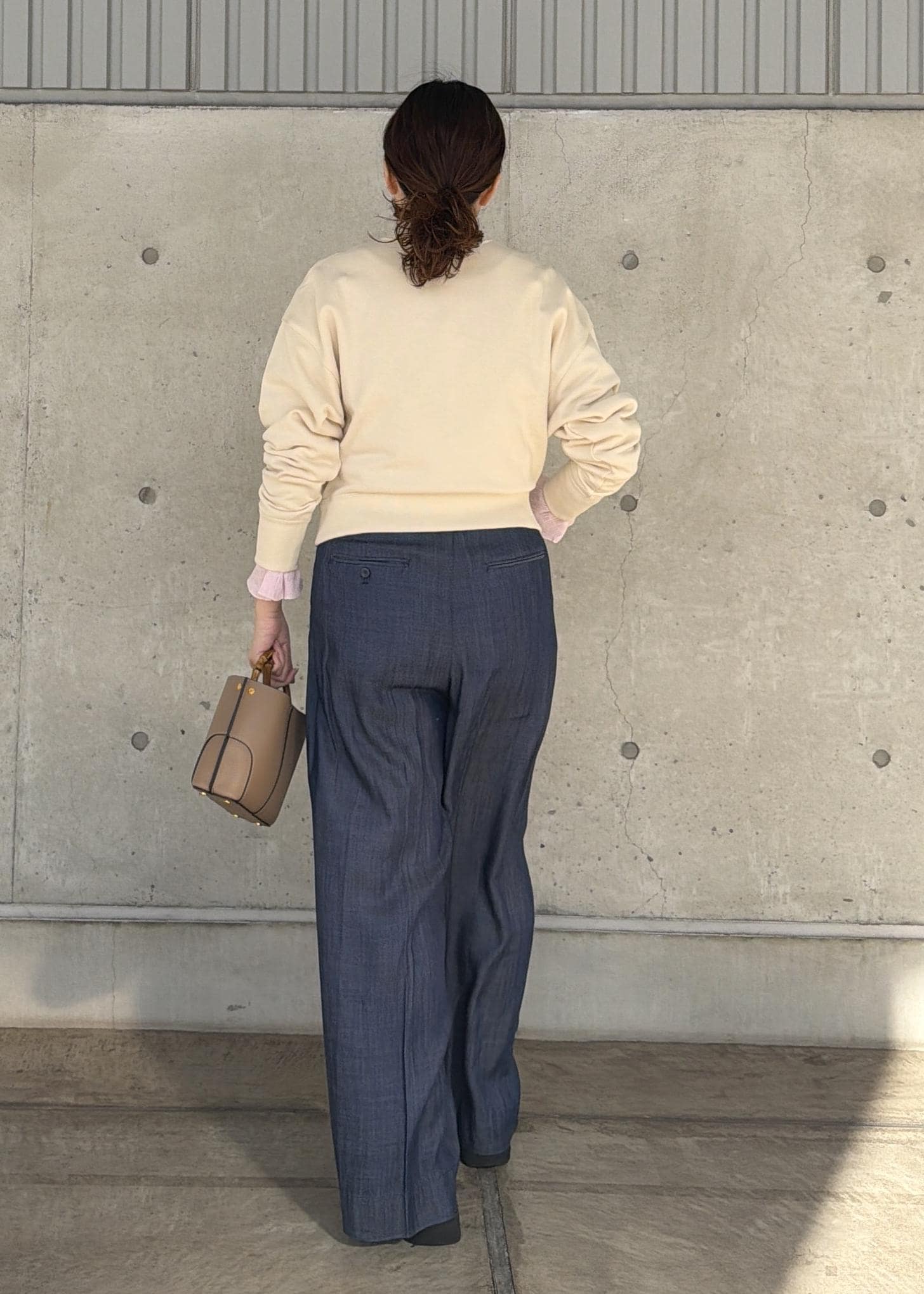 落ち感のあるテンセル100%素材のデニム。軽さと程よいツヤ感があり、カジュアルになりすぎずきれいめにも着用できます。ウエストゴムで楽してきちんと見えするので毎日履きたくなるような、ストレスフリーな1本です。 -