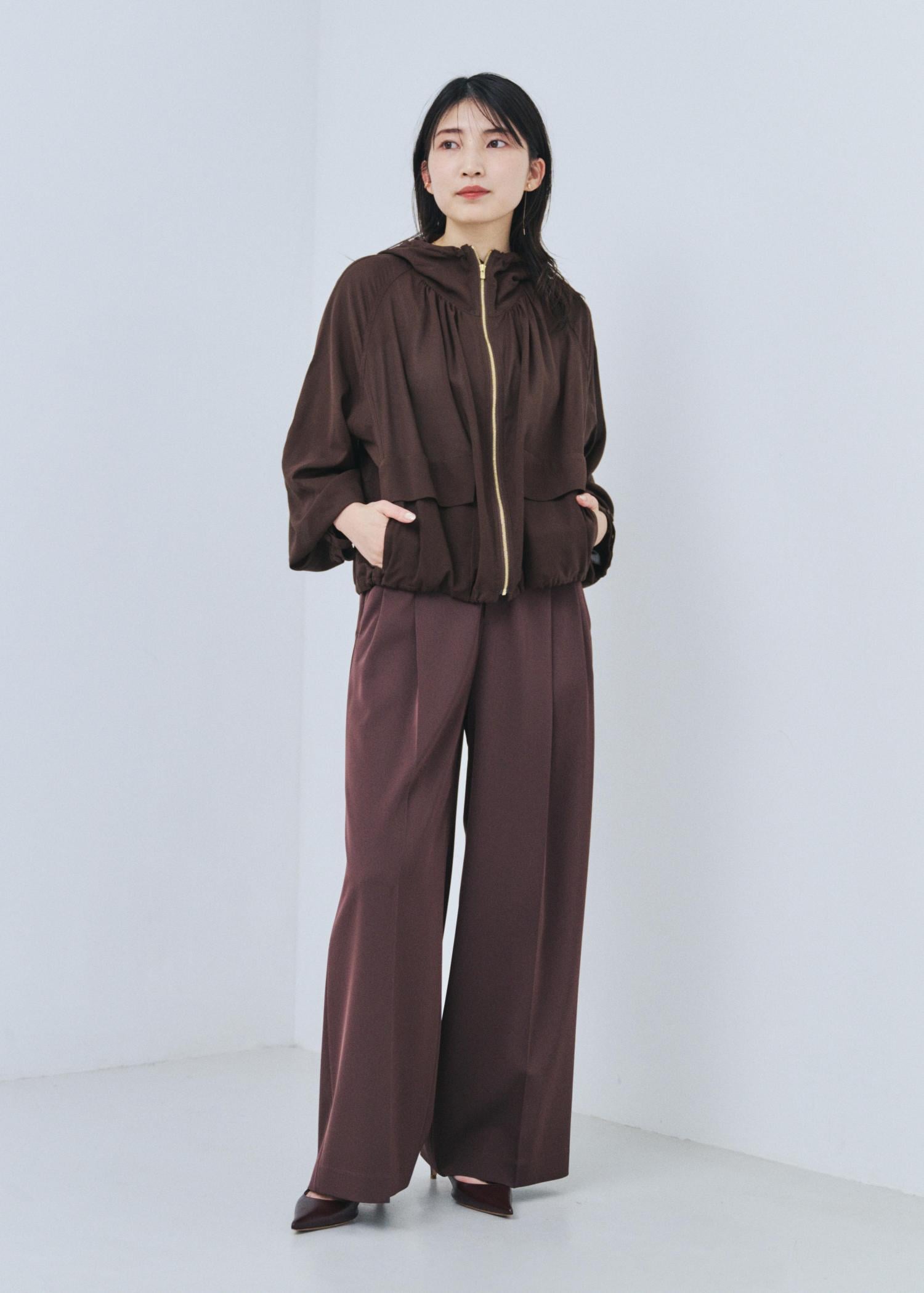 コンパクトな丈のトップスとセンタープレスのパンツで、低身長でもスラッと脚長に見えるスタイルです。