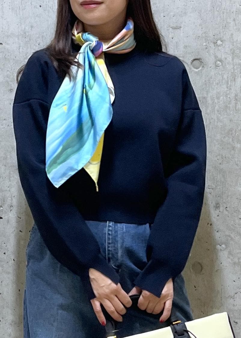 シンプルなのでポイントにスカーフを巻いてカジュアルにならないようにしました。