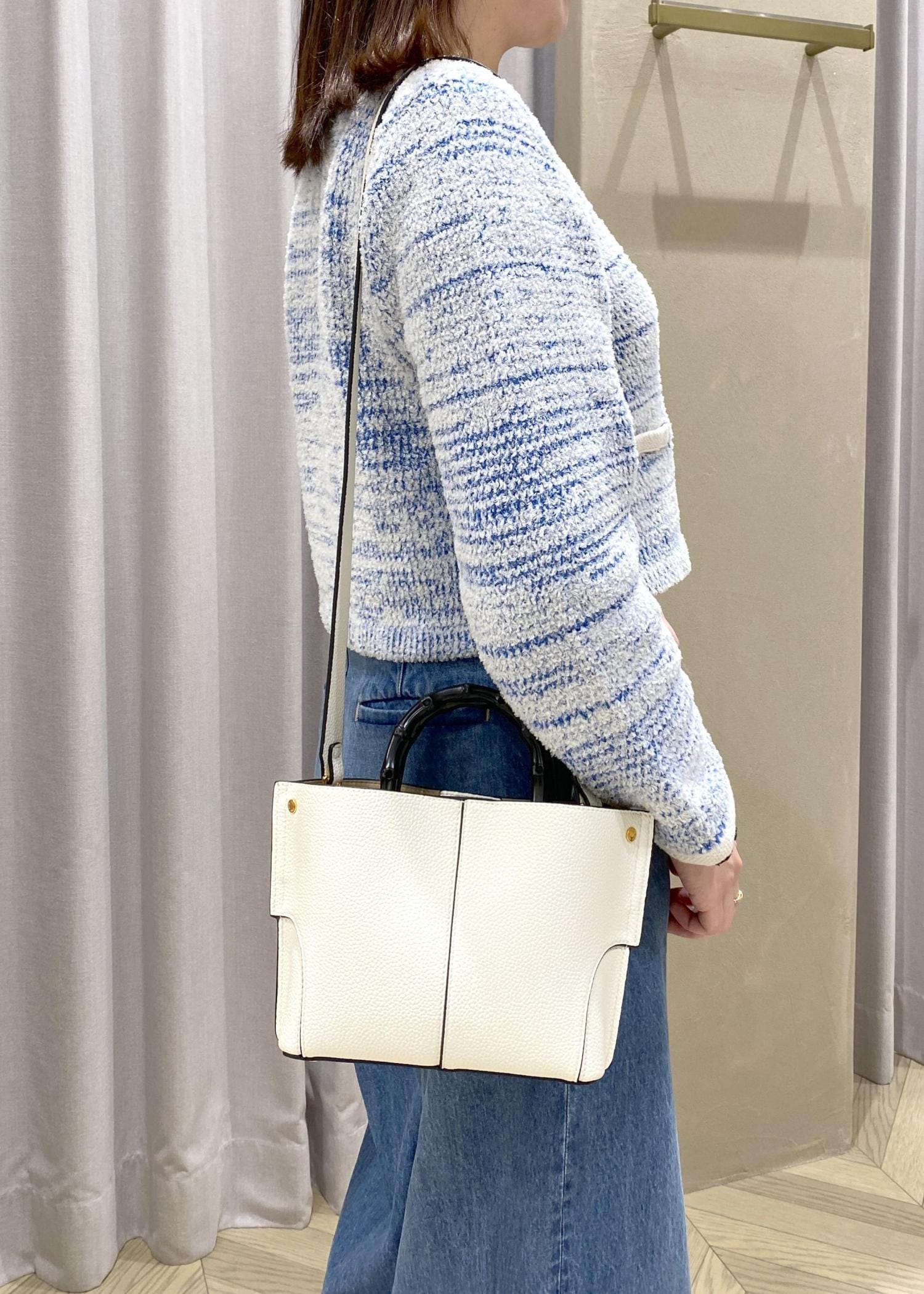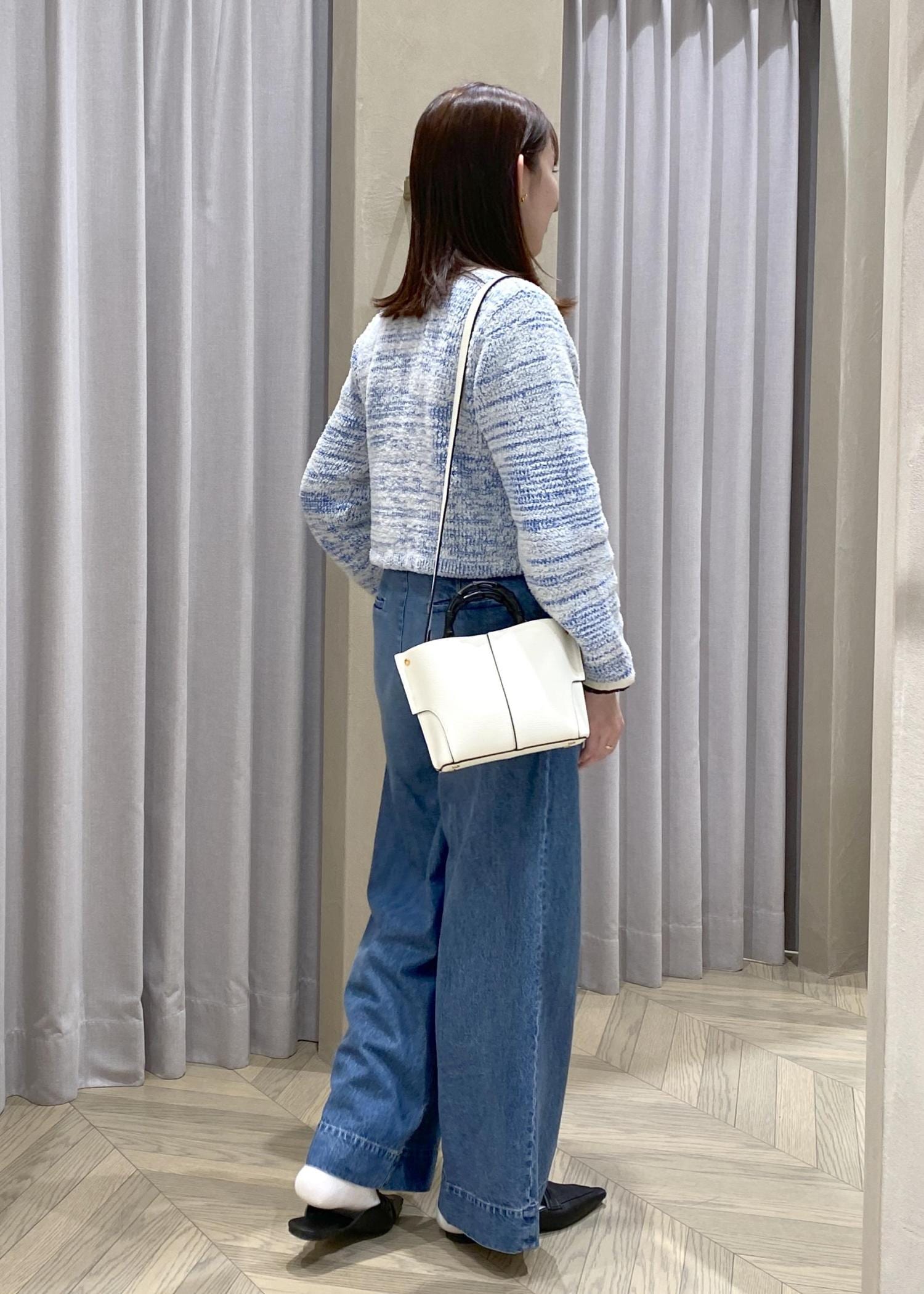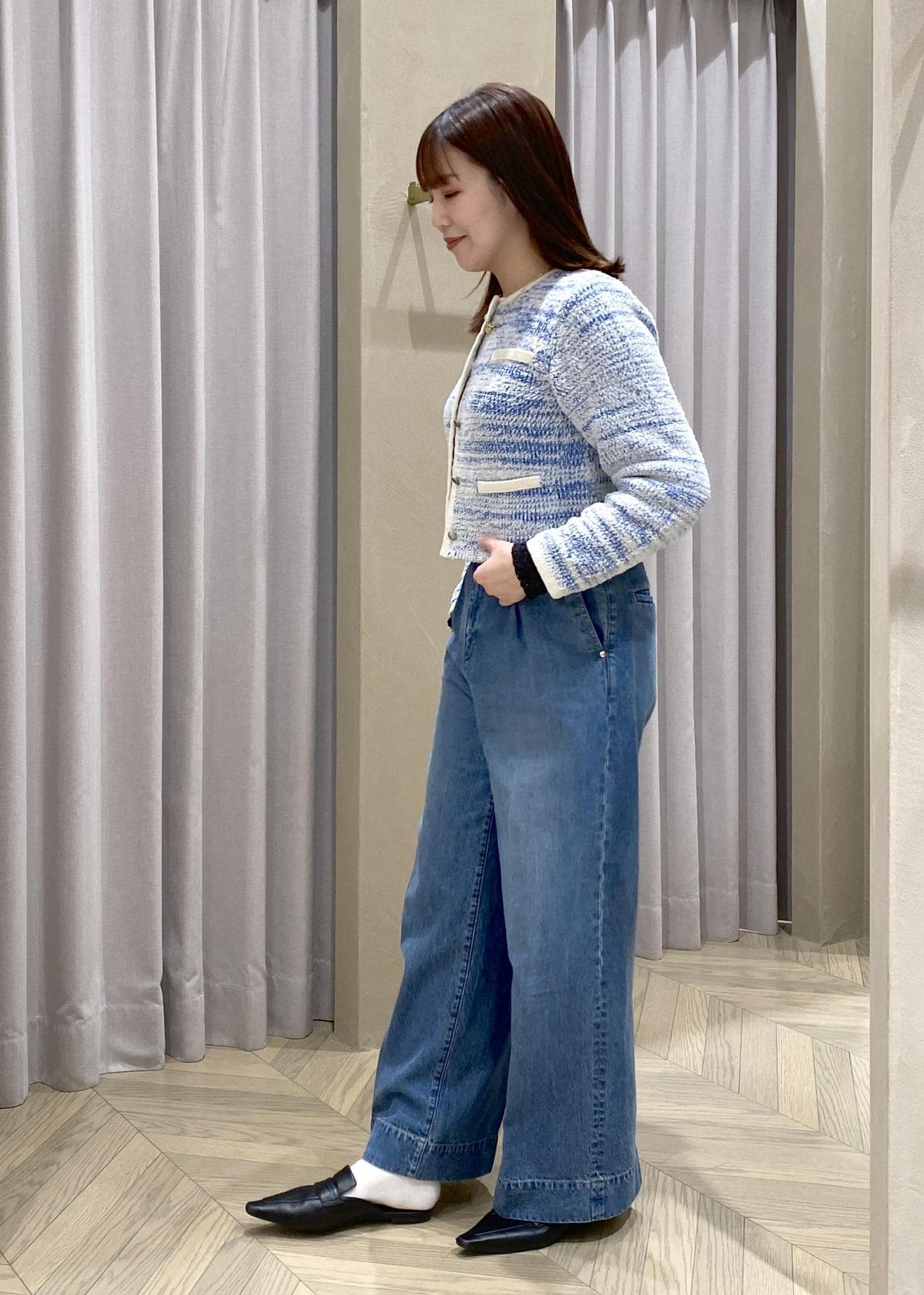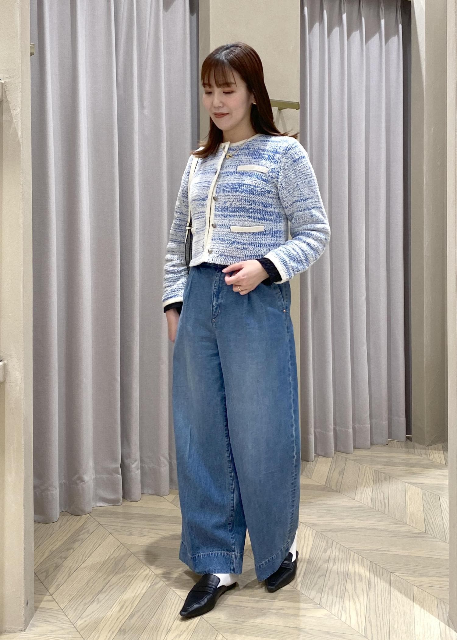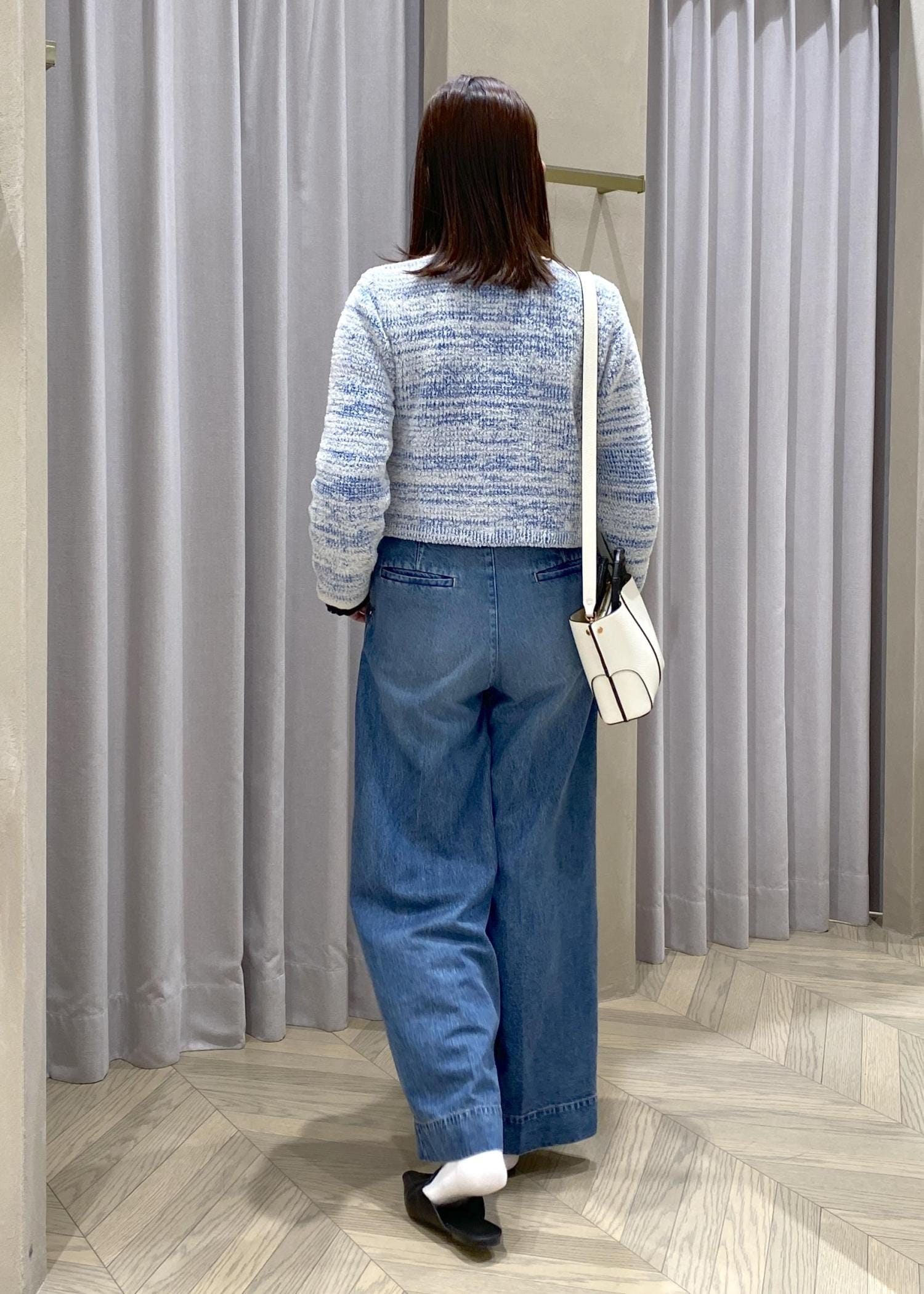 ブルー×白のミックス糸が上品で、短め丈なのでワイドデニムともバランス良く決まります。