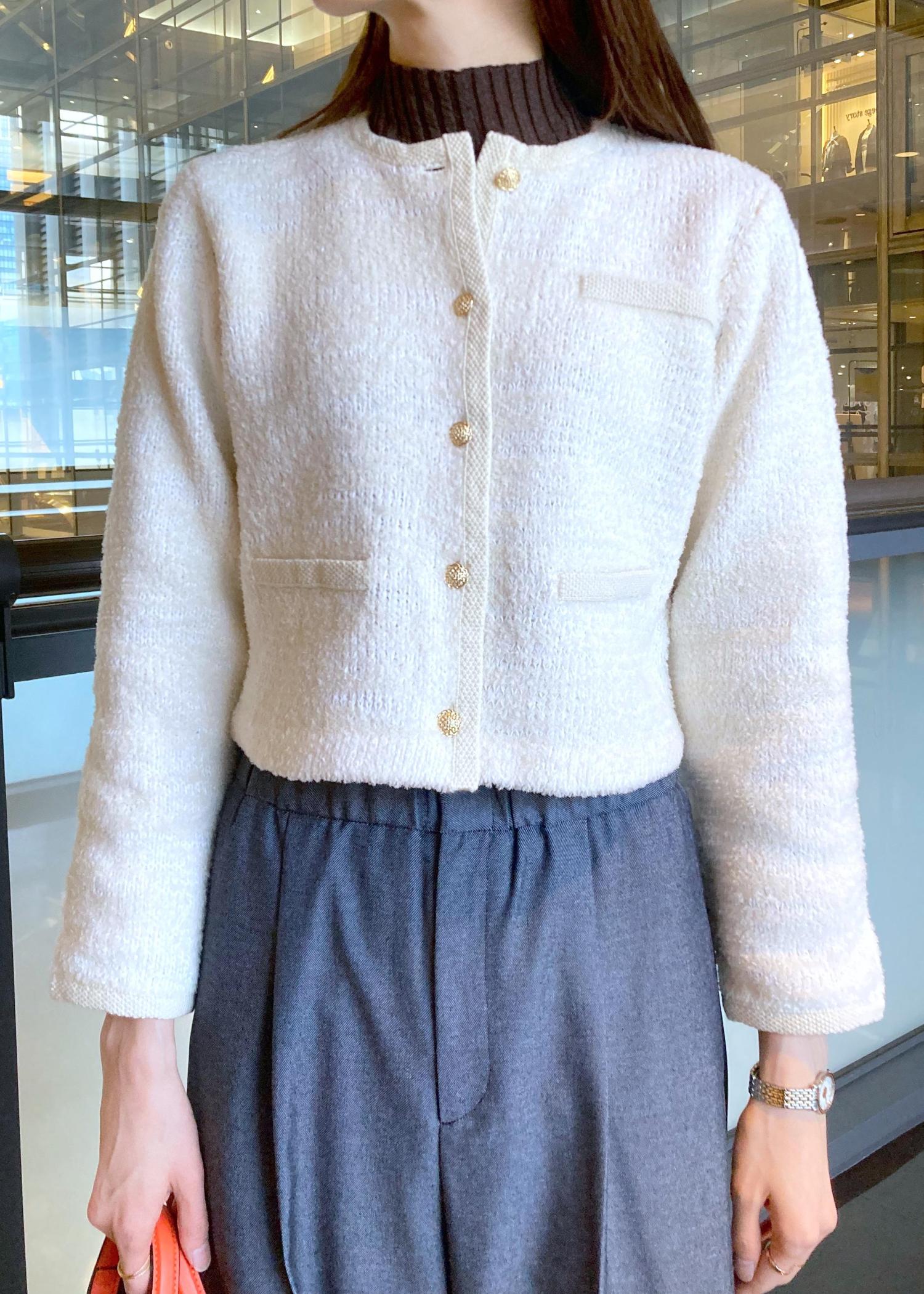 ROPÉツイードニットショート丈カーディガン/イージーケアキナリ / F¥26,180レビューコンパクトなシルエットのためボトムとのバランスも取りやすく、シンプルな形ですがフロントのボタンがアクセントとなりコーデが決まりやすいのも◎