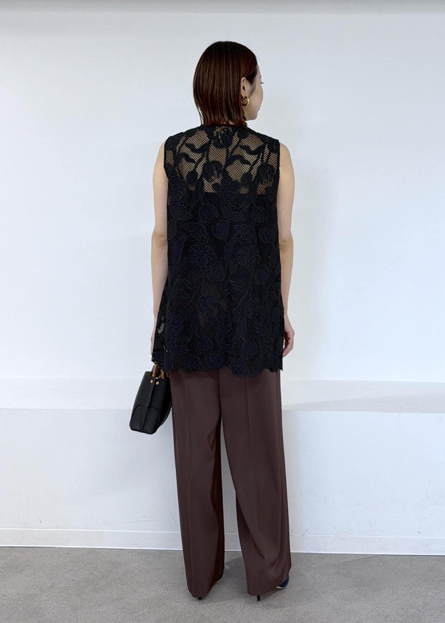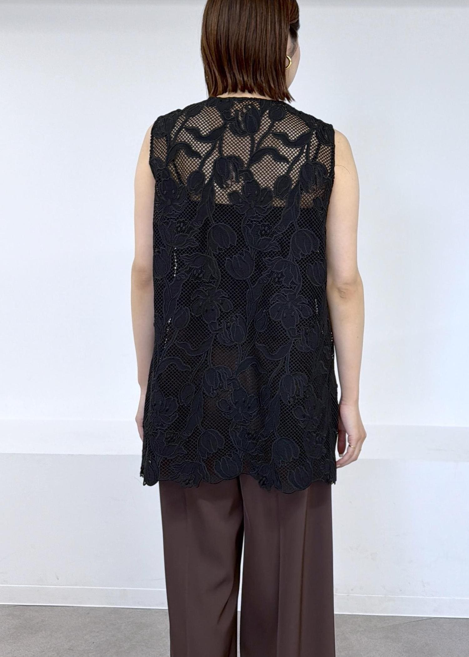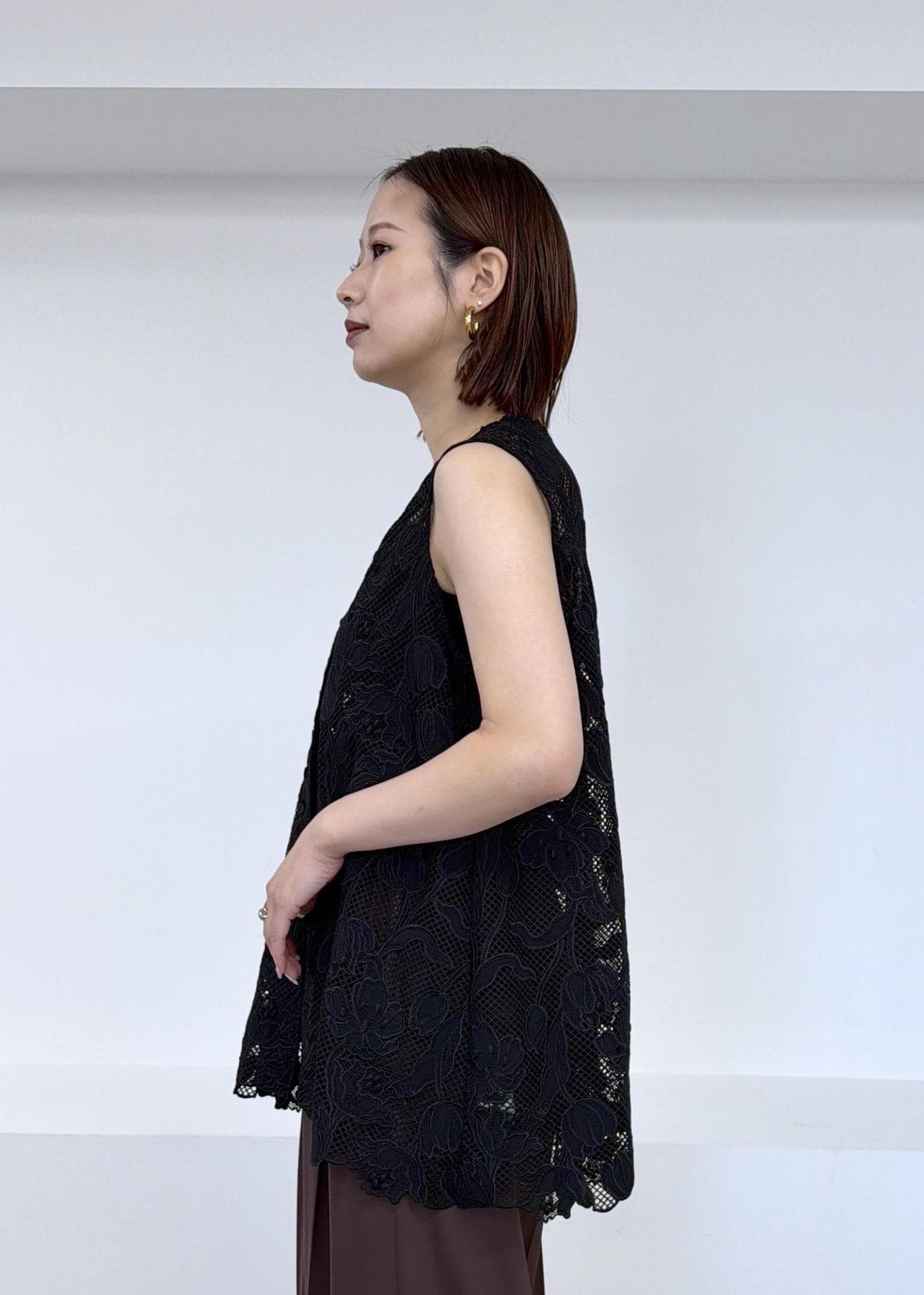 予約ROPÉエンブロイダリーフラワーレースジレブラック / F¥31,900レビュー着丈はヒップが隠れるほどでアームホールは程よいゆとりがあるのでインナーにシャツを着ても窮屈感なく羽織ることができました。
