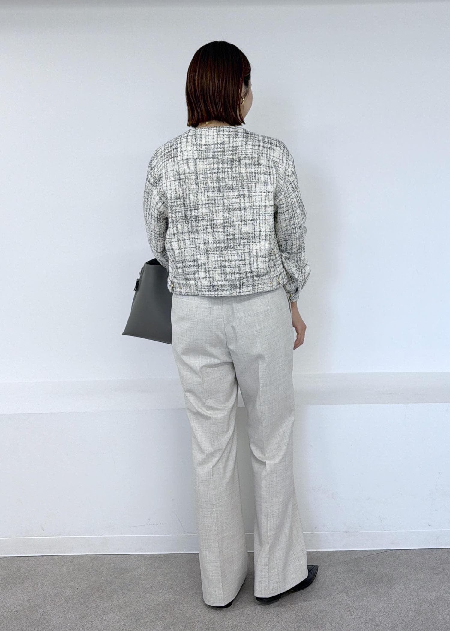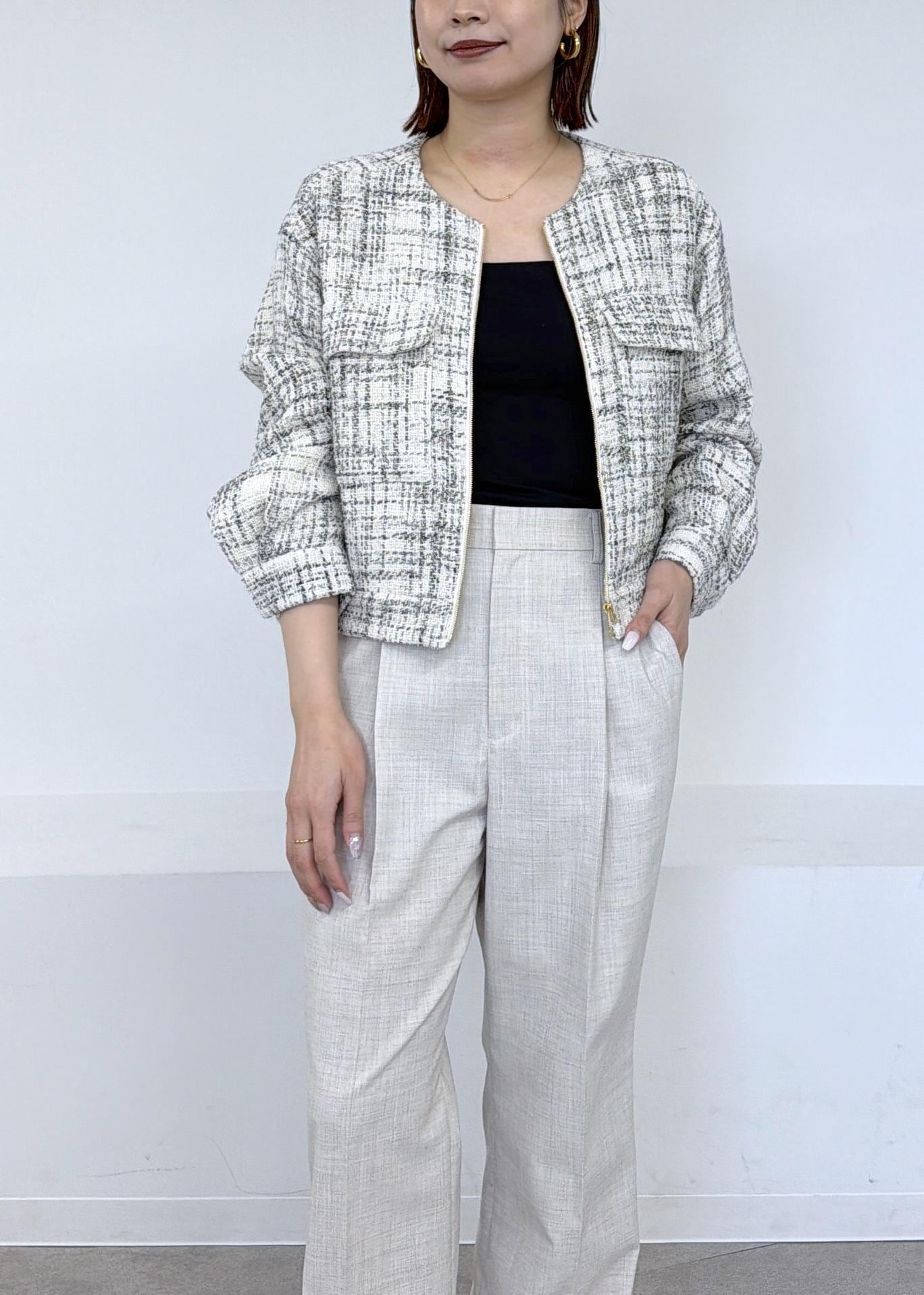 春におすすめなツイードブルゾンを使ったオフィススタイルです。