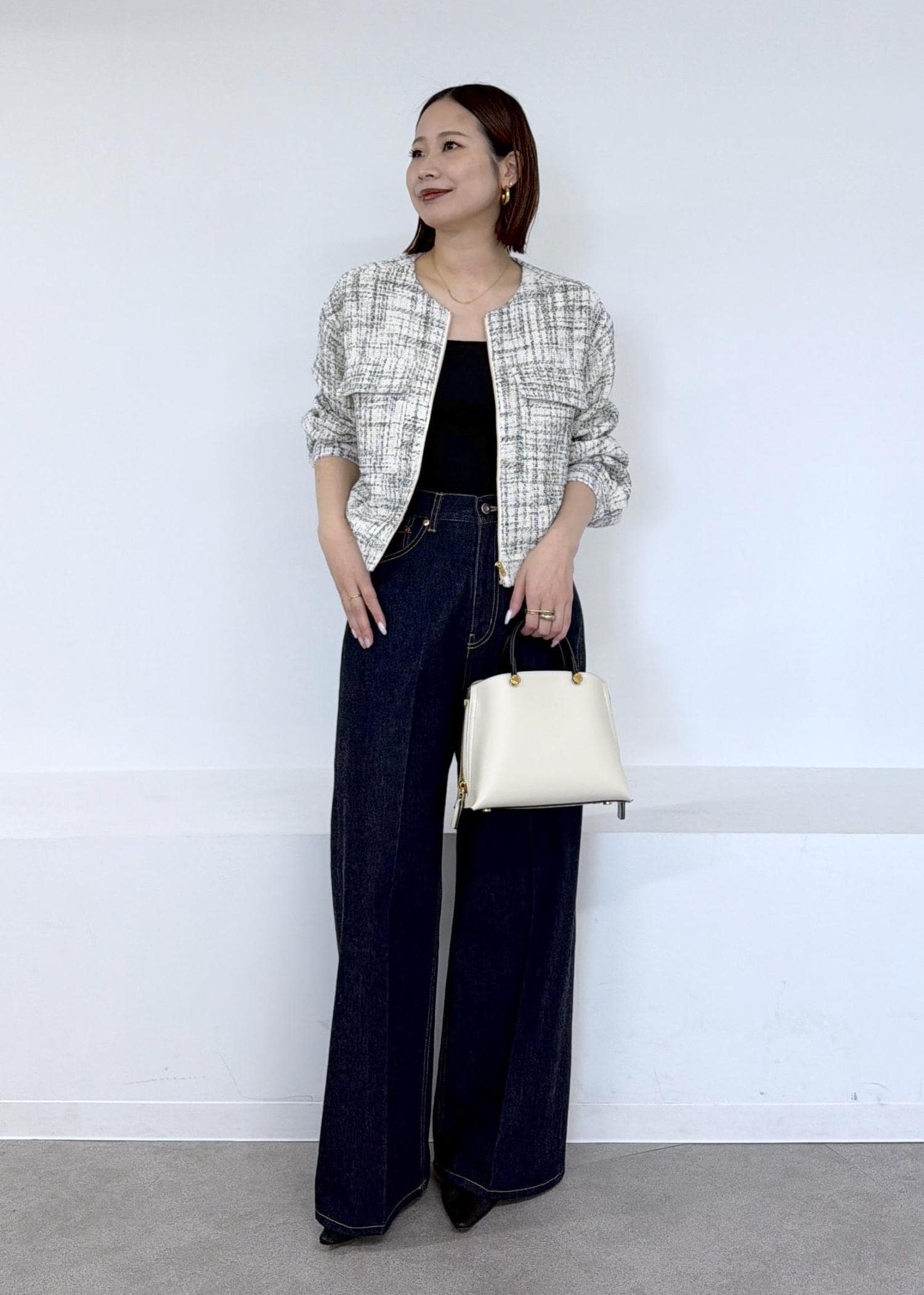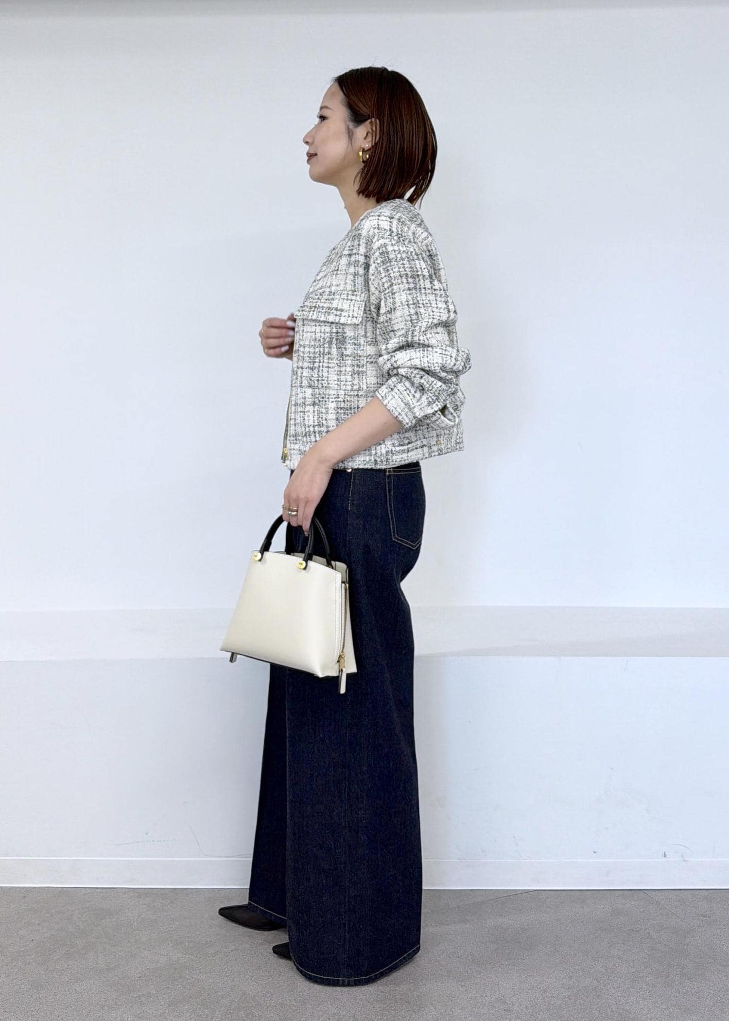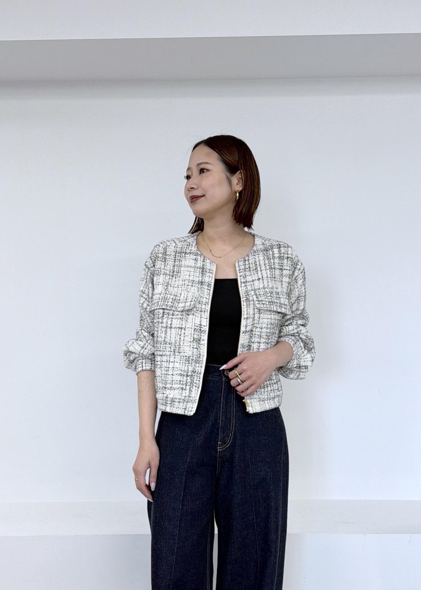 ツイードですがジップブルゾンなので少しカジュアルに着ることができるのでオンオフ兼用としても◎ -