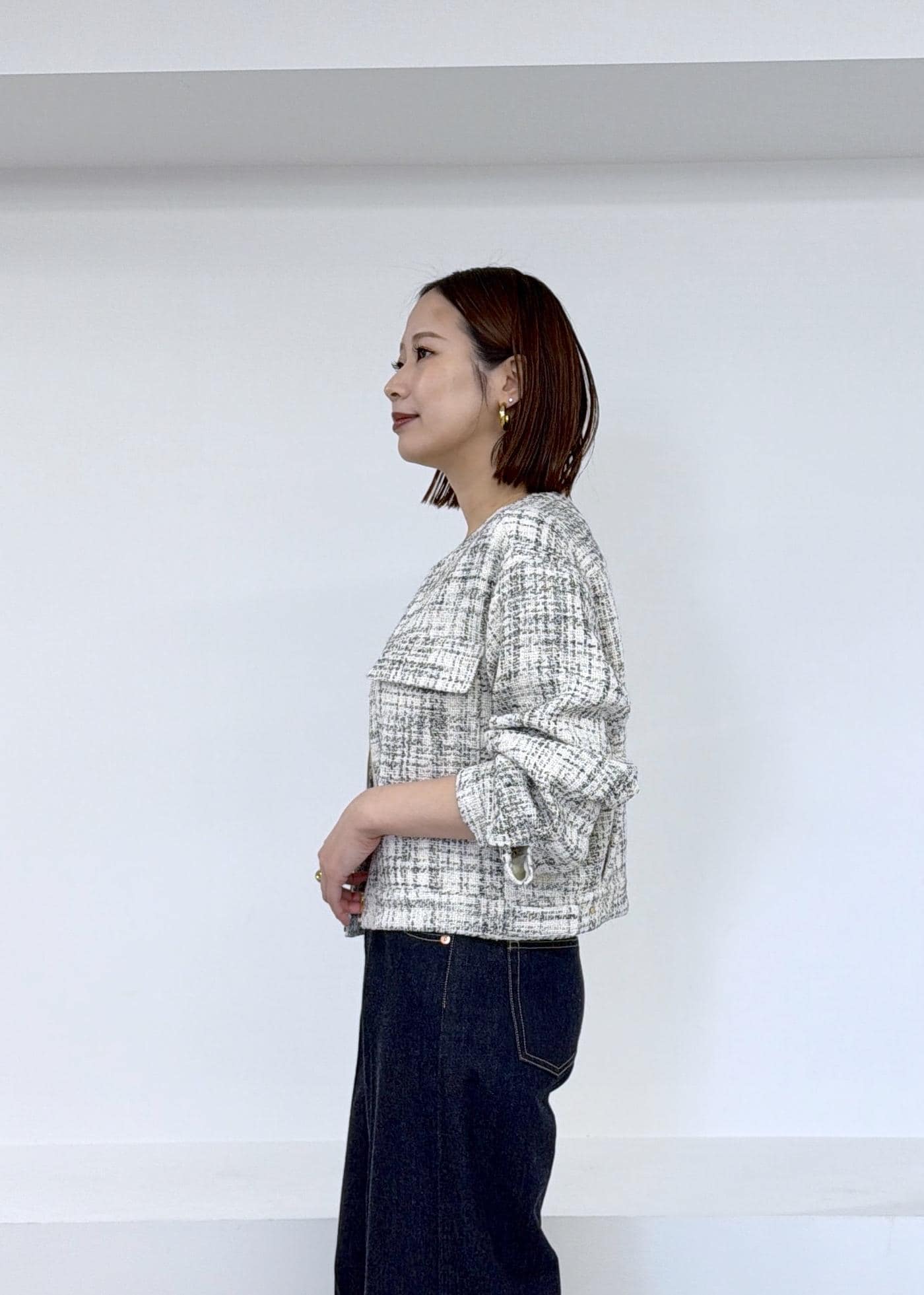 ROPÉツイードノーカラージャケットキナリ系 / F¥52,800レビュー着丈はコンパクトで腰骨にかかるほどです。アームはゆったりとしているのでボリューム袖のアイテムをインナーに着ても◎