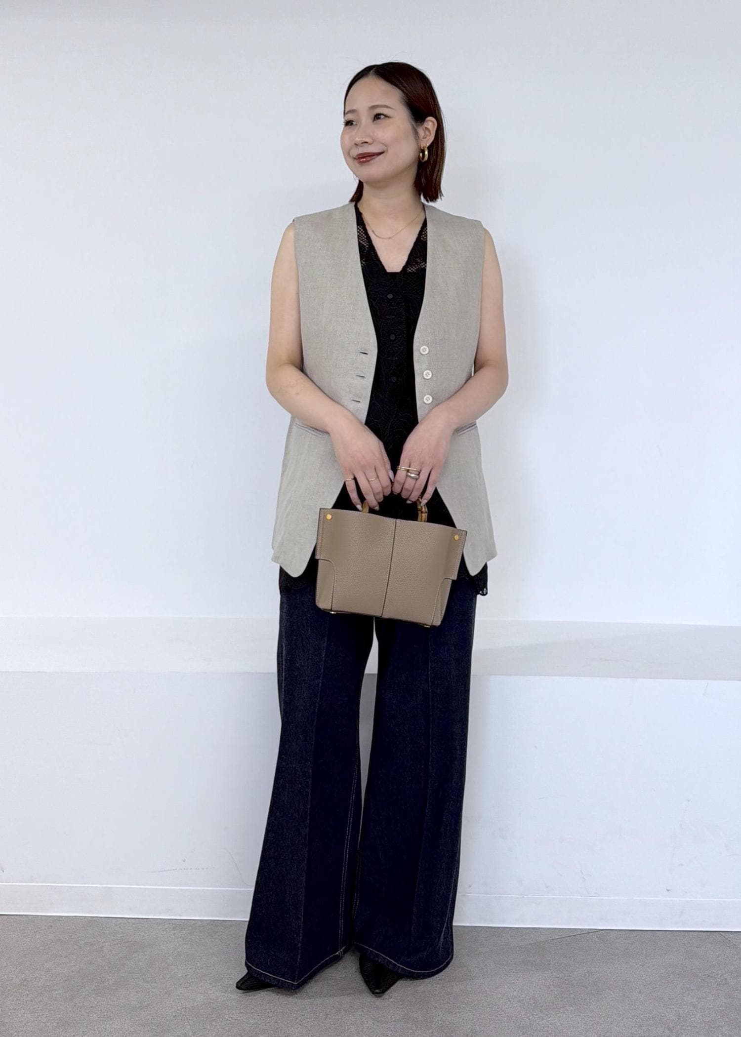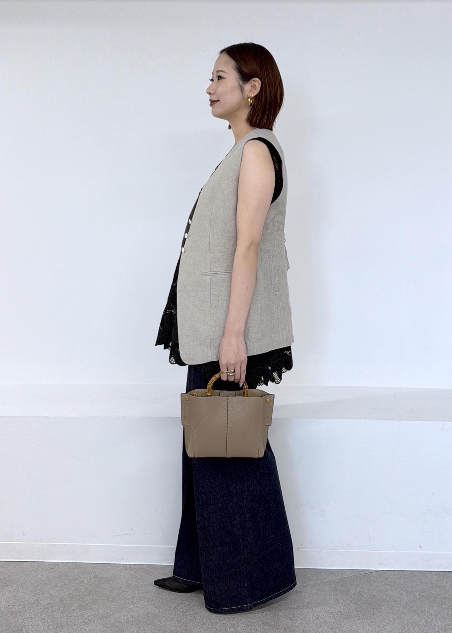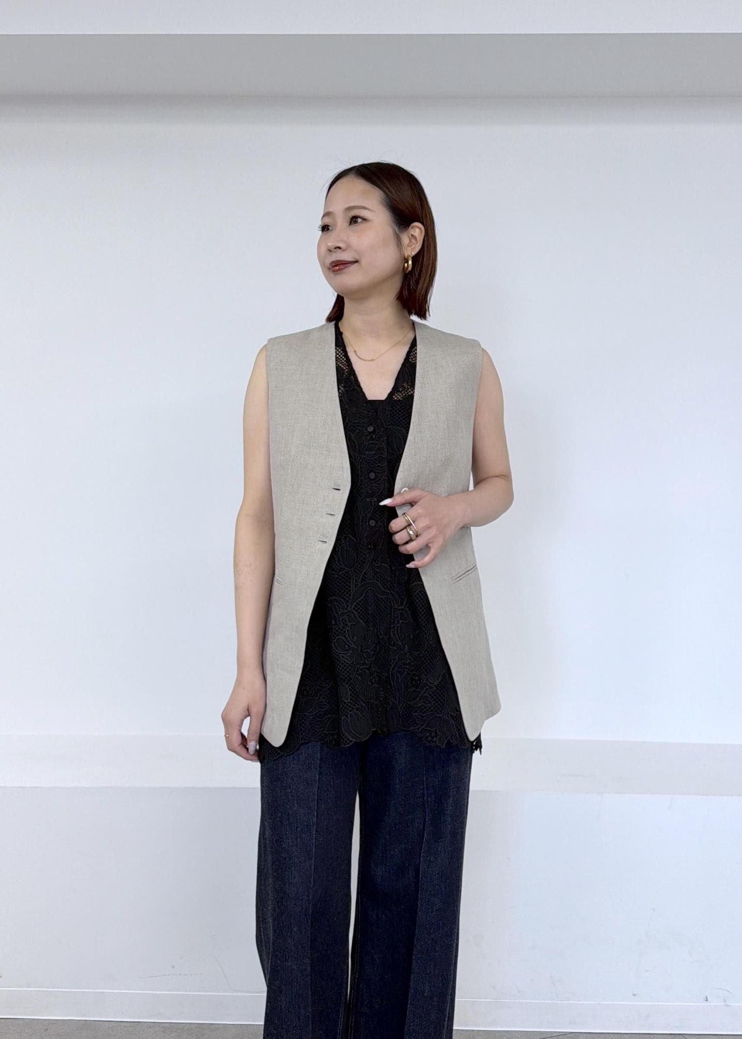 予約ROPÉエンブロイダリーフラワーレースジレブラック / F¥31,900レビュー着丈はヒップが隠れるほどでアームホールは程よいゆとりがあるのでインナーにシャツを着ても窮屈感なく羽織ることができました。