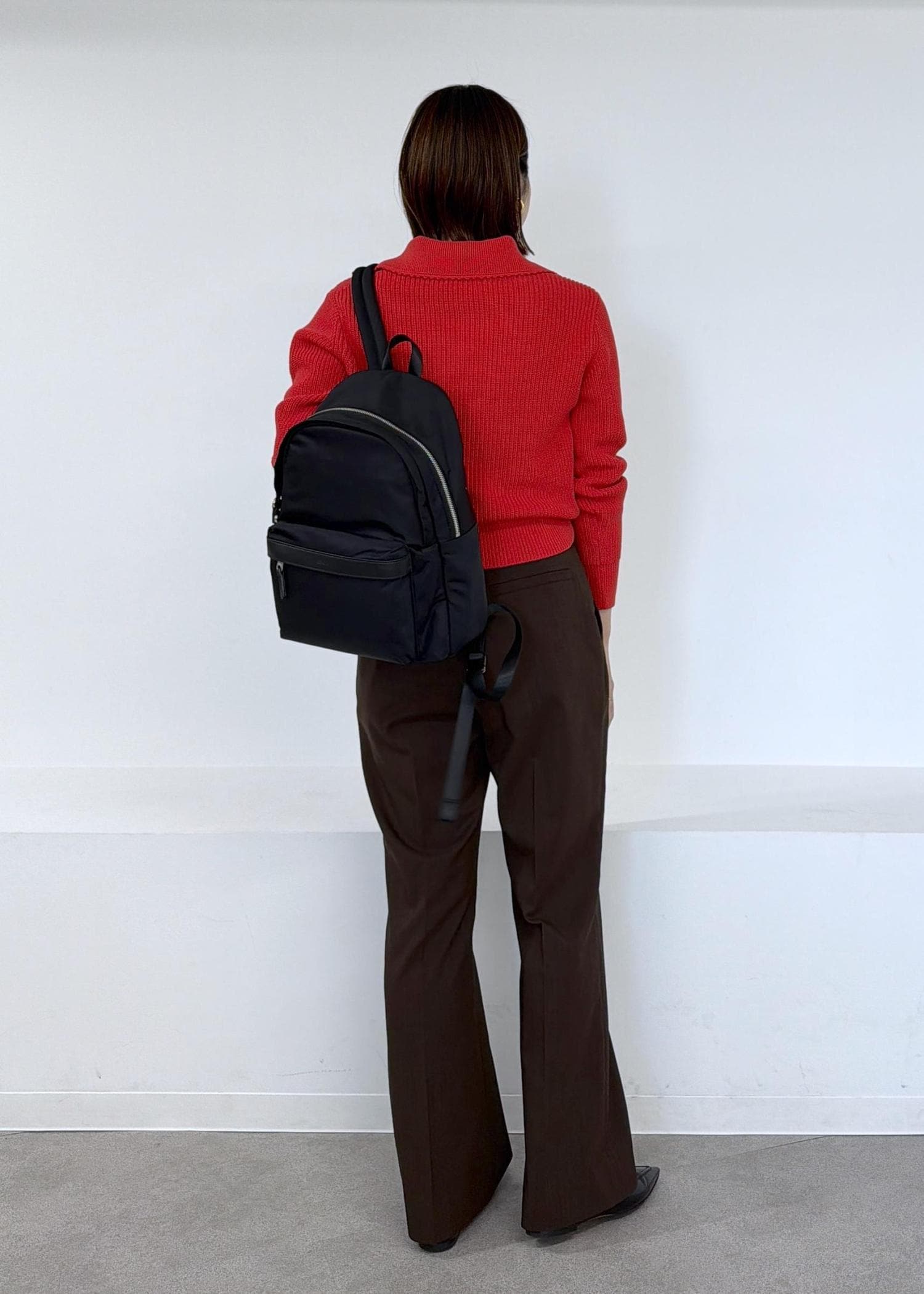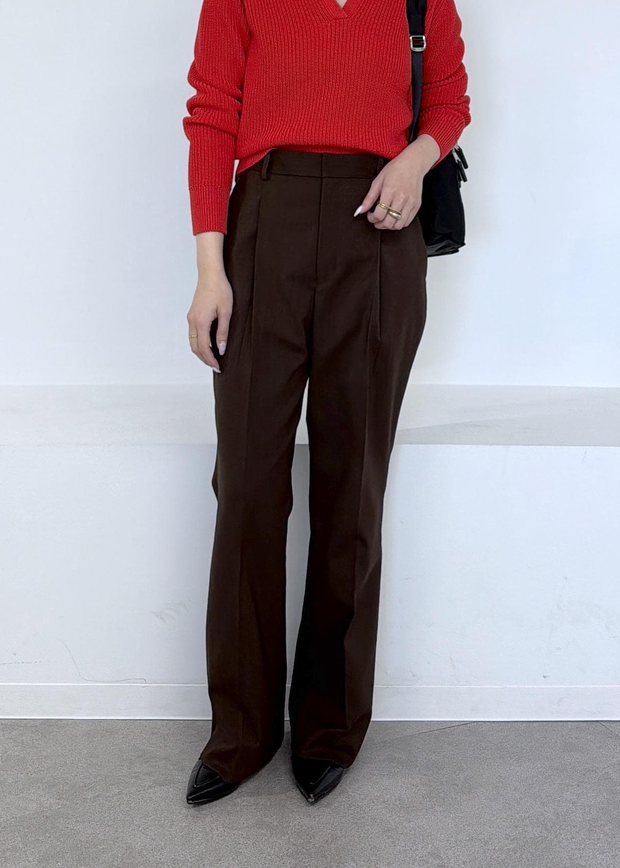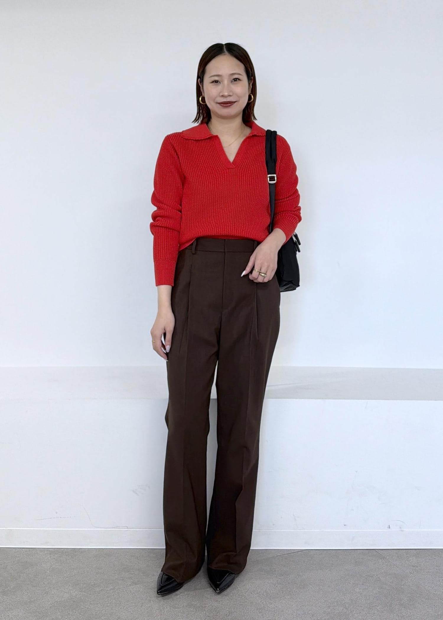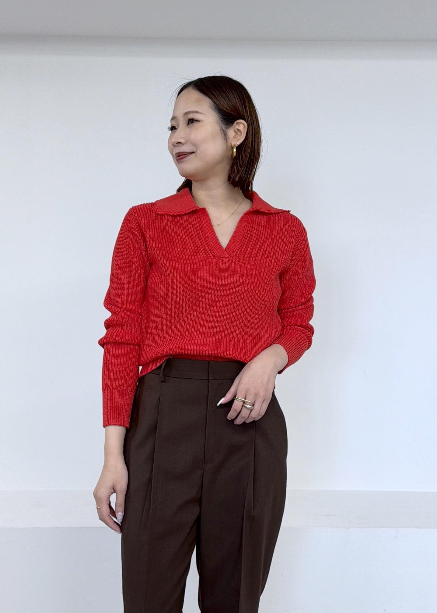 ぱっと目を引く赤のニットにブラウンのパンツを合わせました。