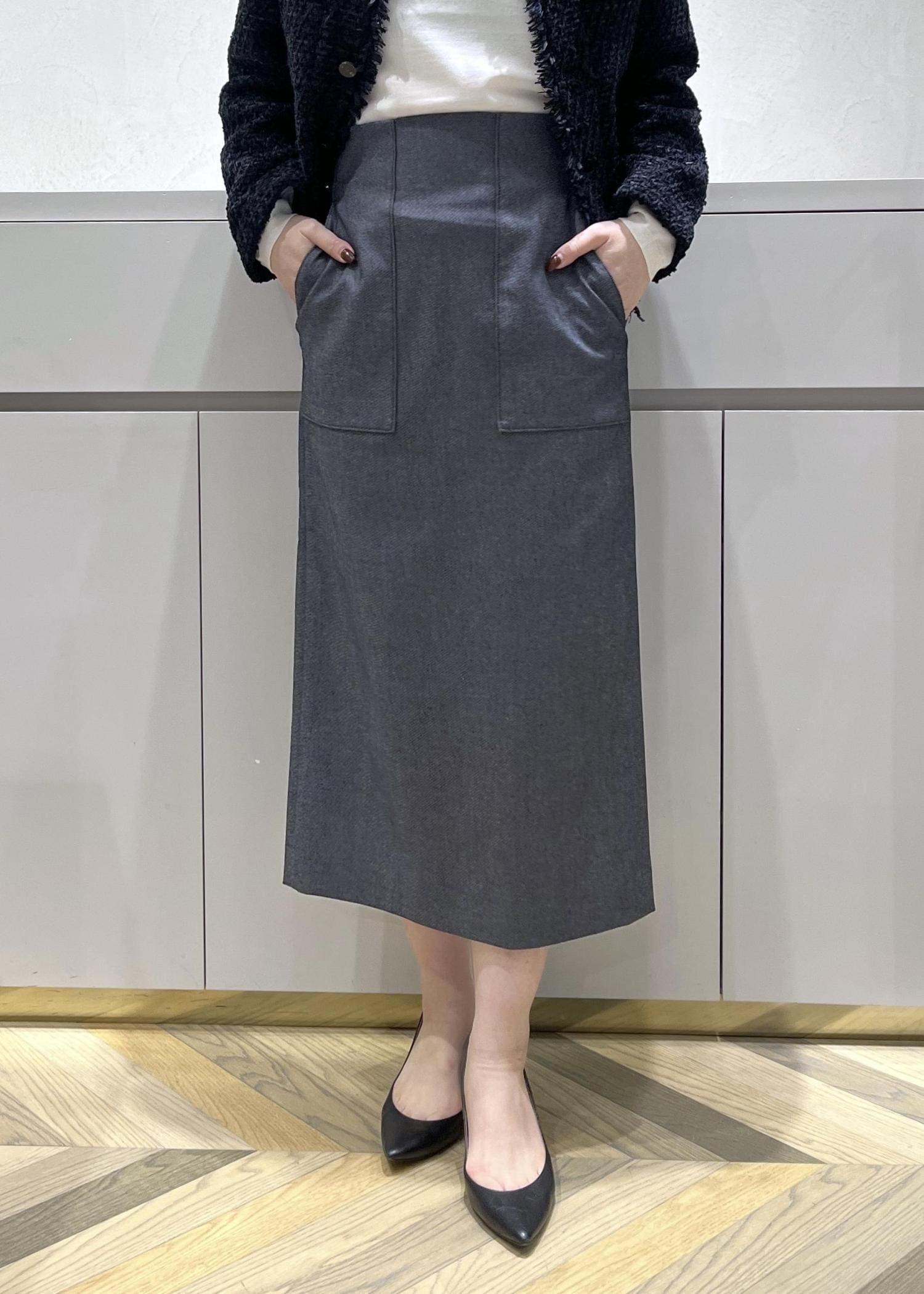 スカートは定番タイトスカートのデニムライク生地。