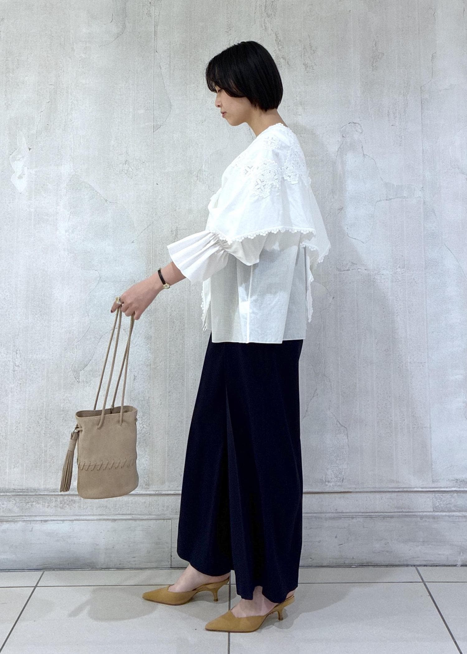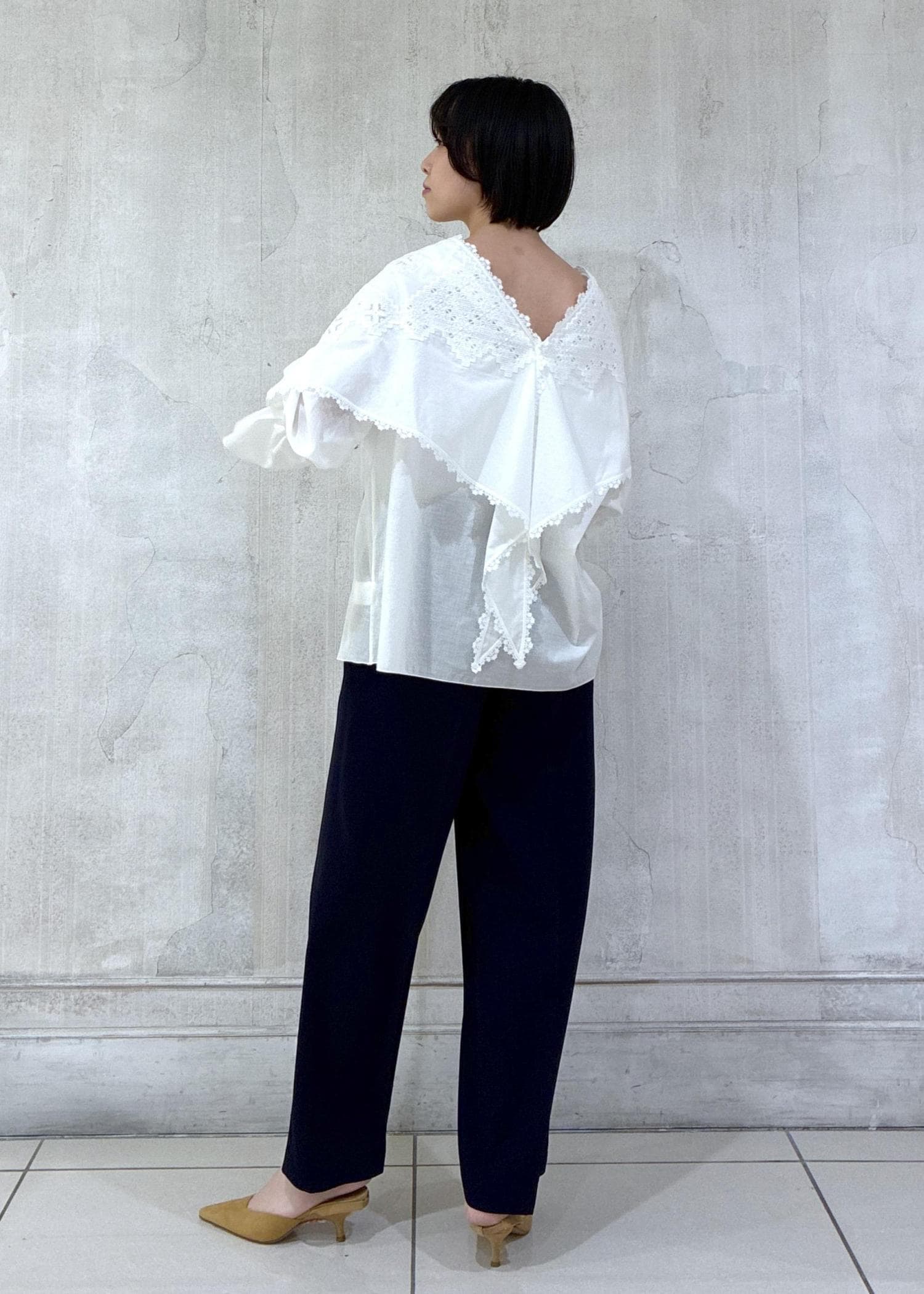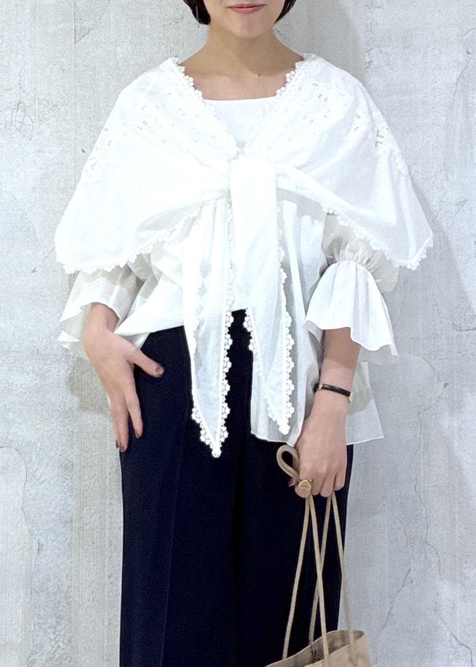 SALON adam et ropéクロスレースケープブラウスオフホワイト / F¥39,600レビュー前後2wayで楽しめるボリュームカラーレースブラウスです。