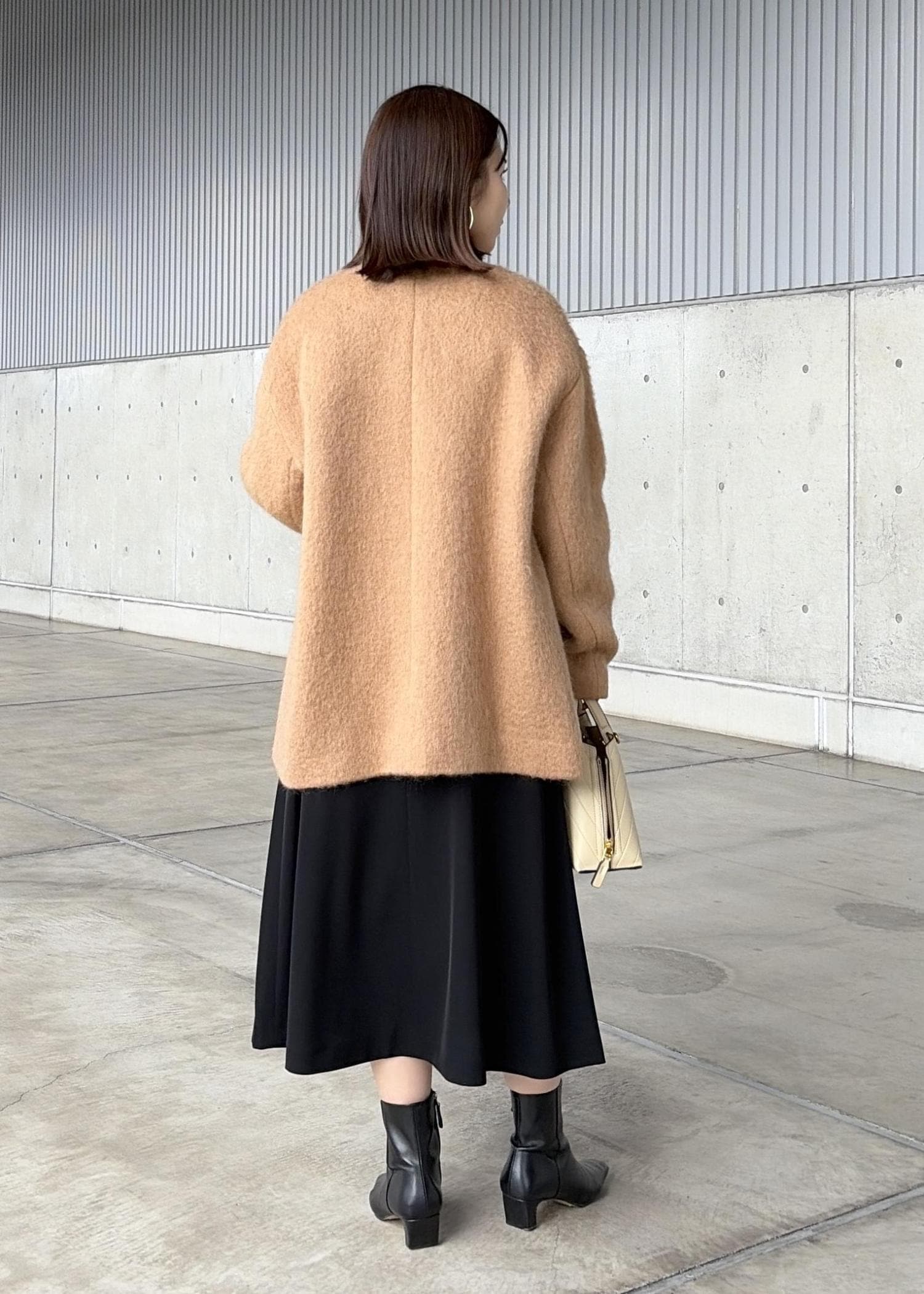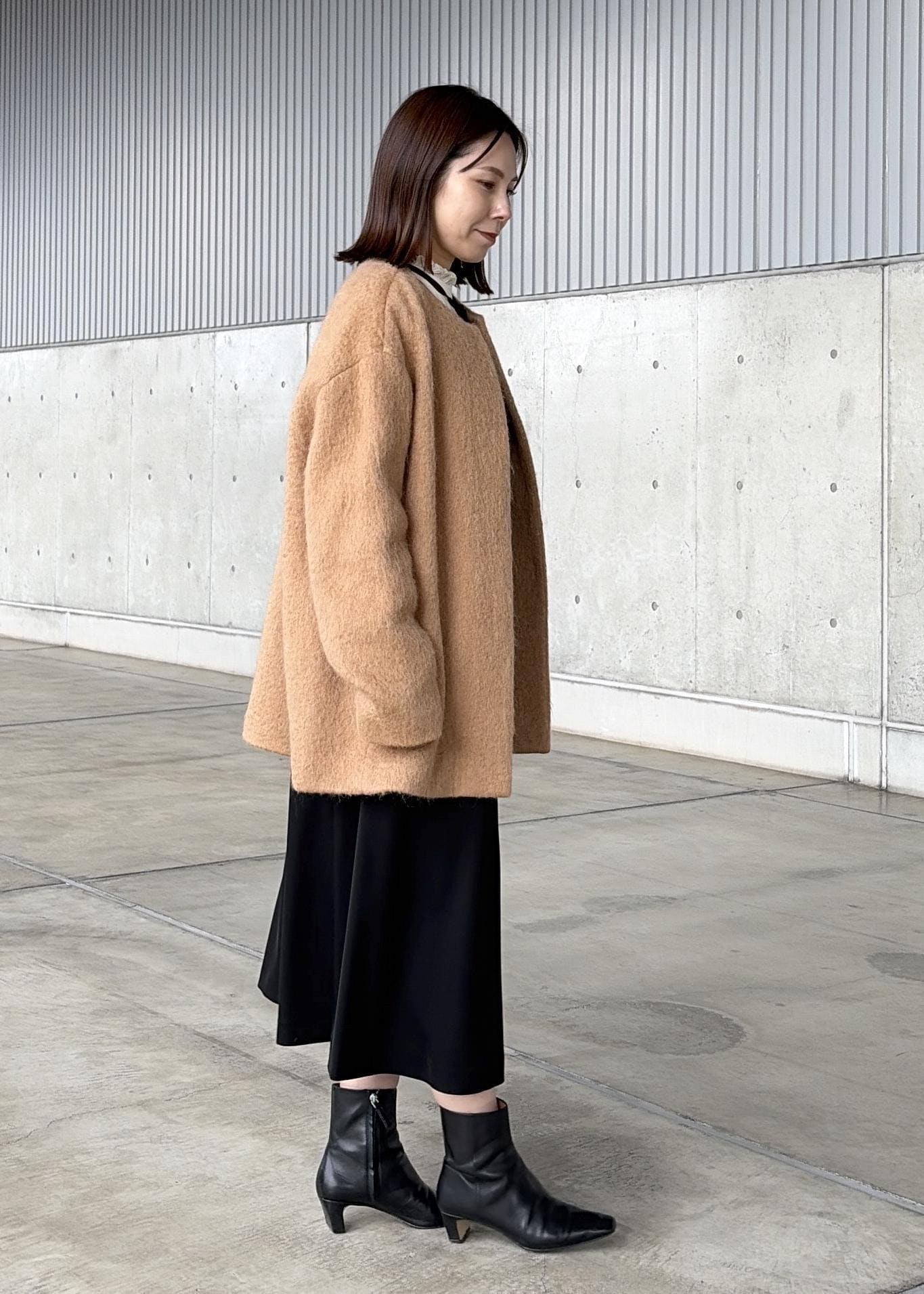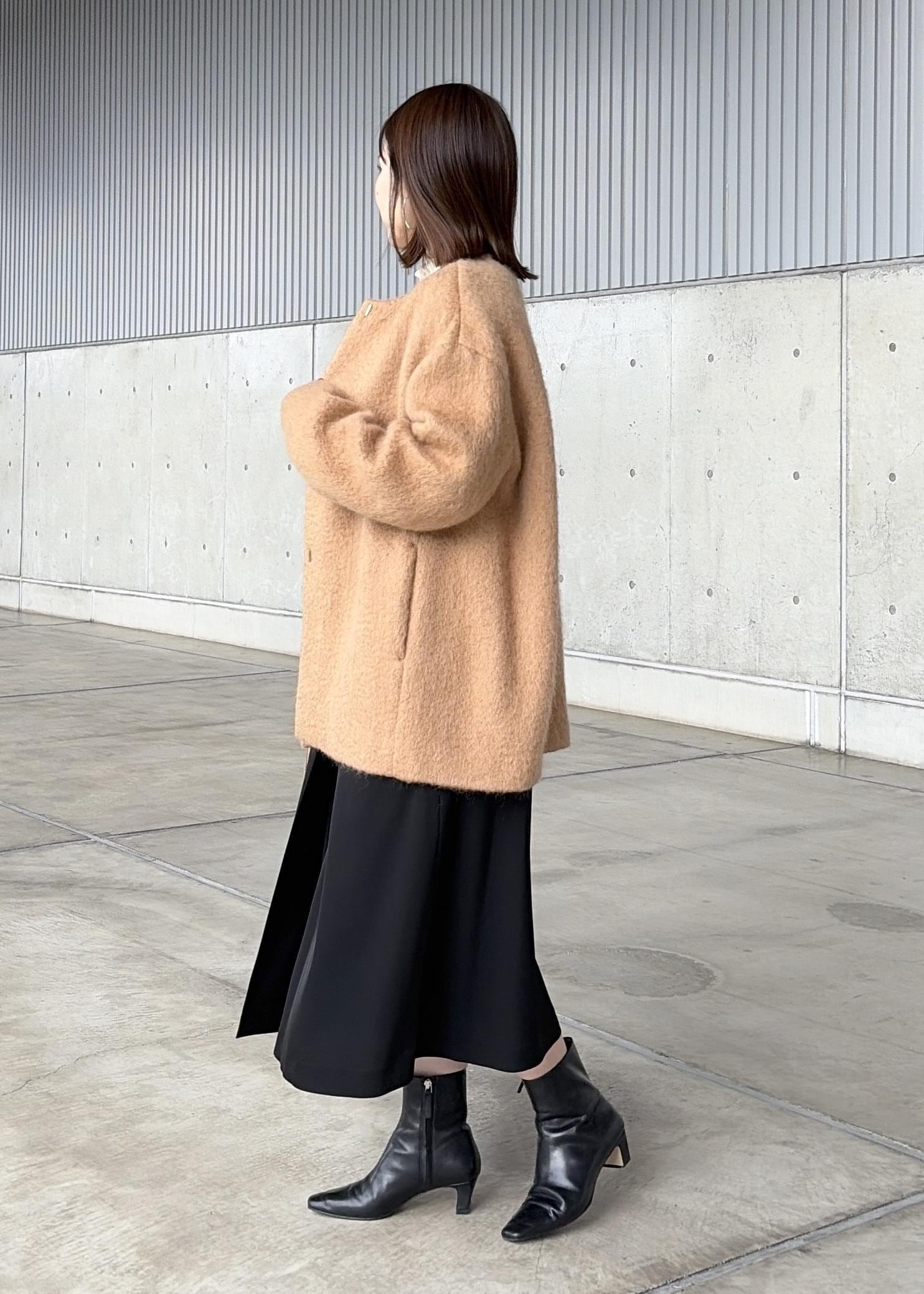 程よいボリューム感が魅力なモヘアは、ノーカラーで顔まわりすっきり。 -
