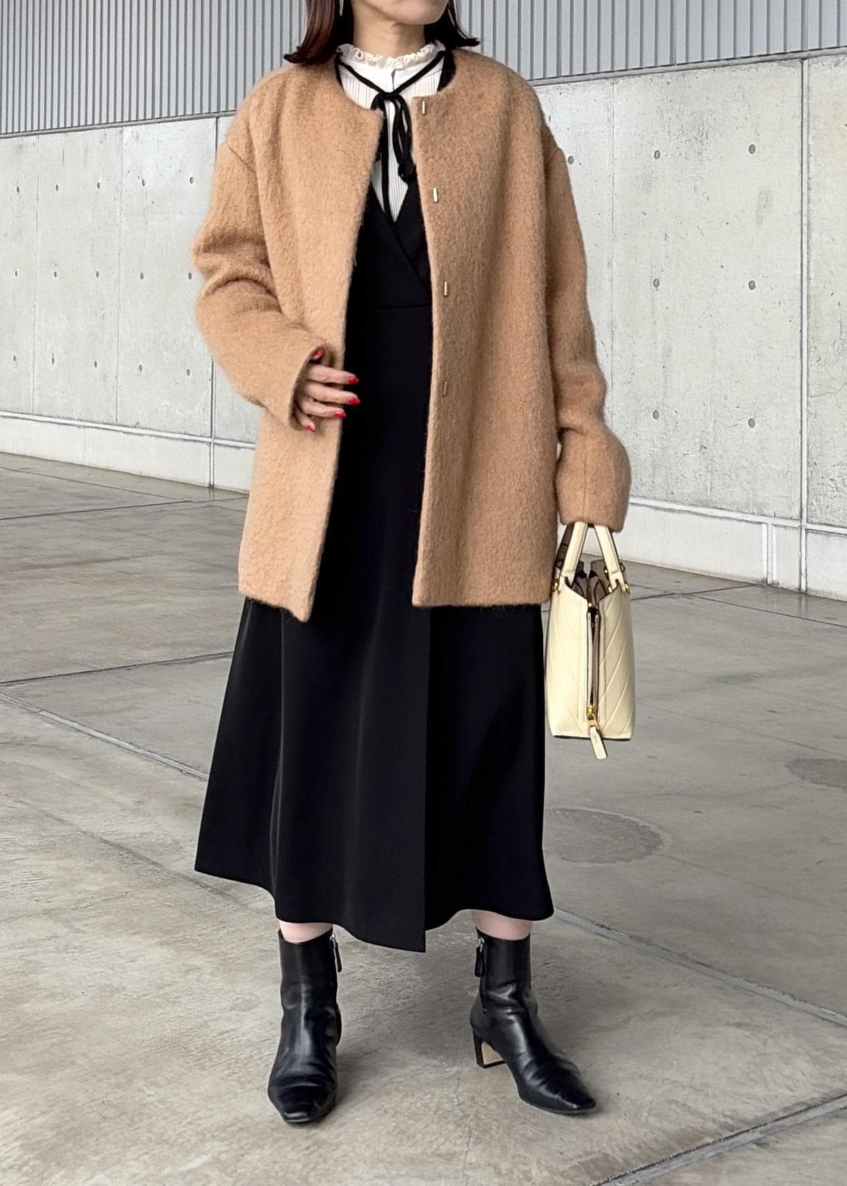 ROPÉウールモヘヤノーカラーミドル丈コートベージュ / F¥34,100レビュー身長156cm、Fサイズ着用。