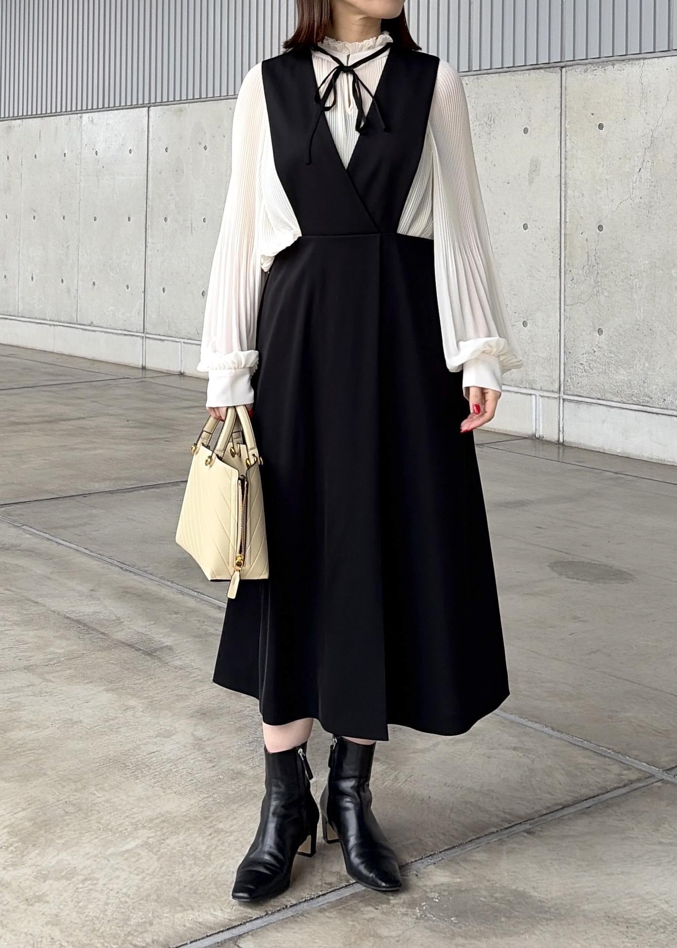 ROPÉトリアセテート ジャンパースカート/イージーケアブラック / 36¥20,900レビュー身長156cm、36サイズ着用。