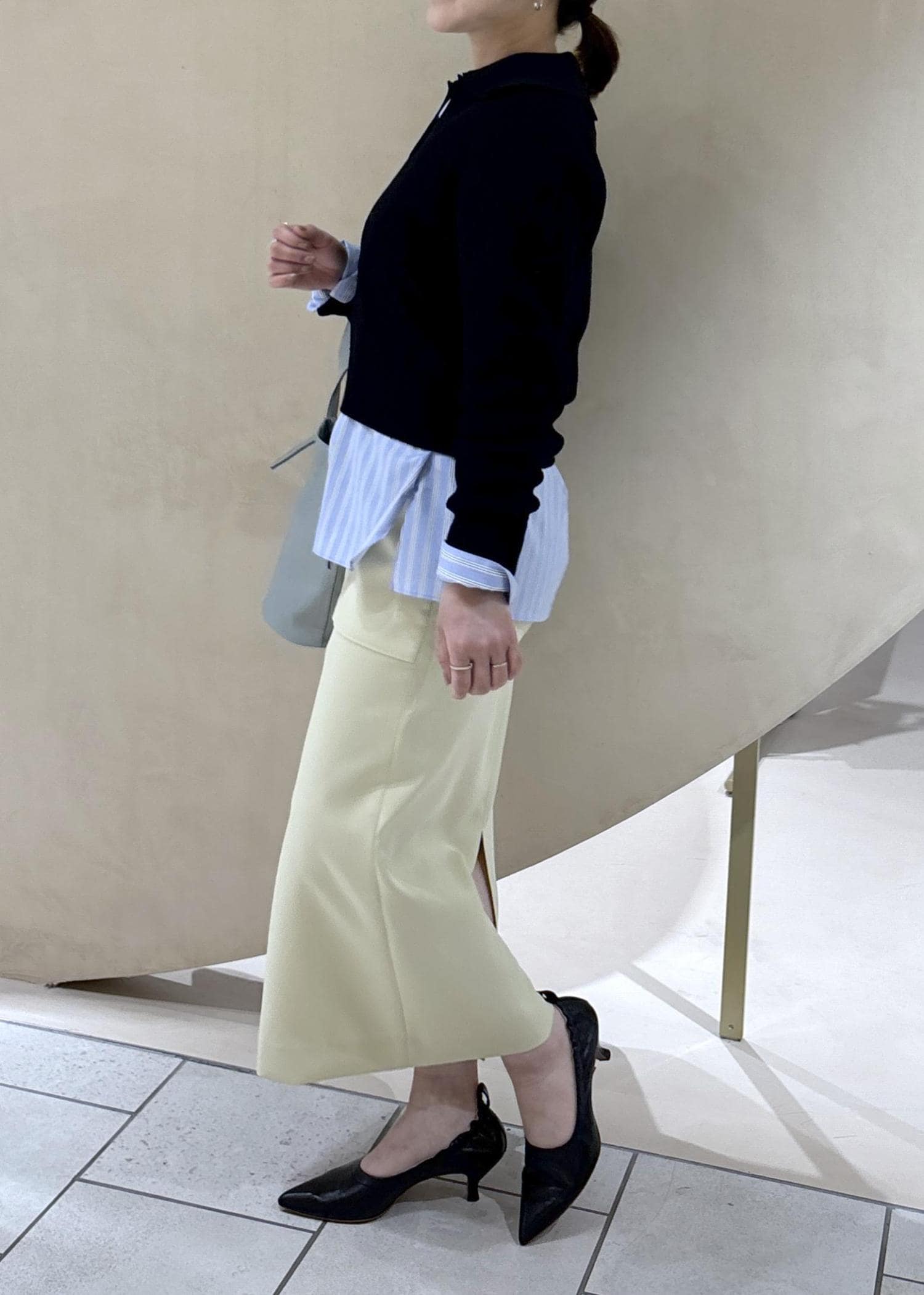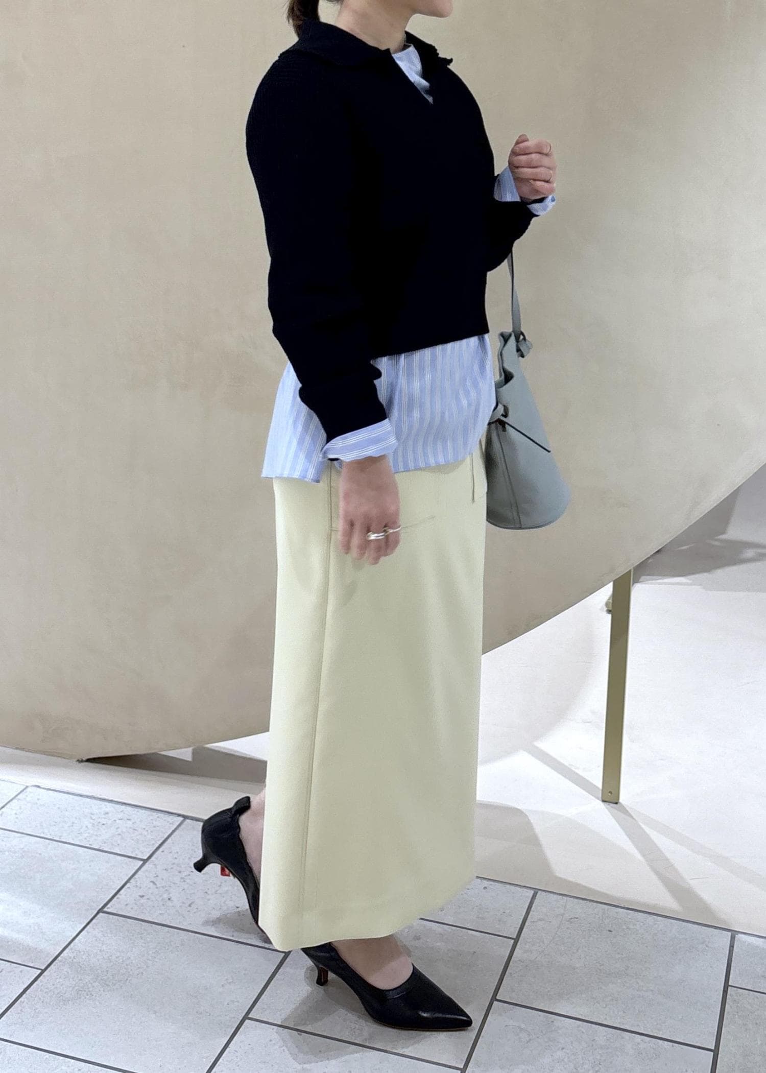 タイトスカートの際は中にブラウスを着て着丈を出すと腰回りカバーしやすいです。