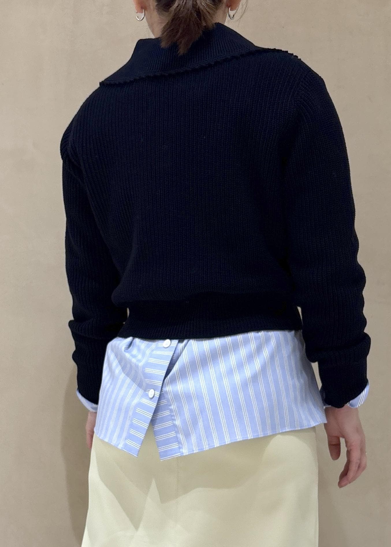 少し肉厚なニットなので、寒い時期から活躍する春アイテムです。襟があるので、ニットでもきちんと感があり、適度なVネックの開きで顔まわりがスッキリ見えます。 -