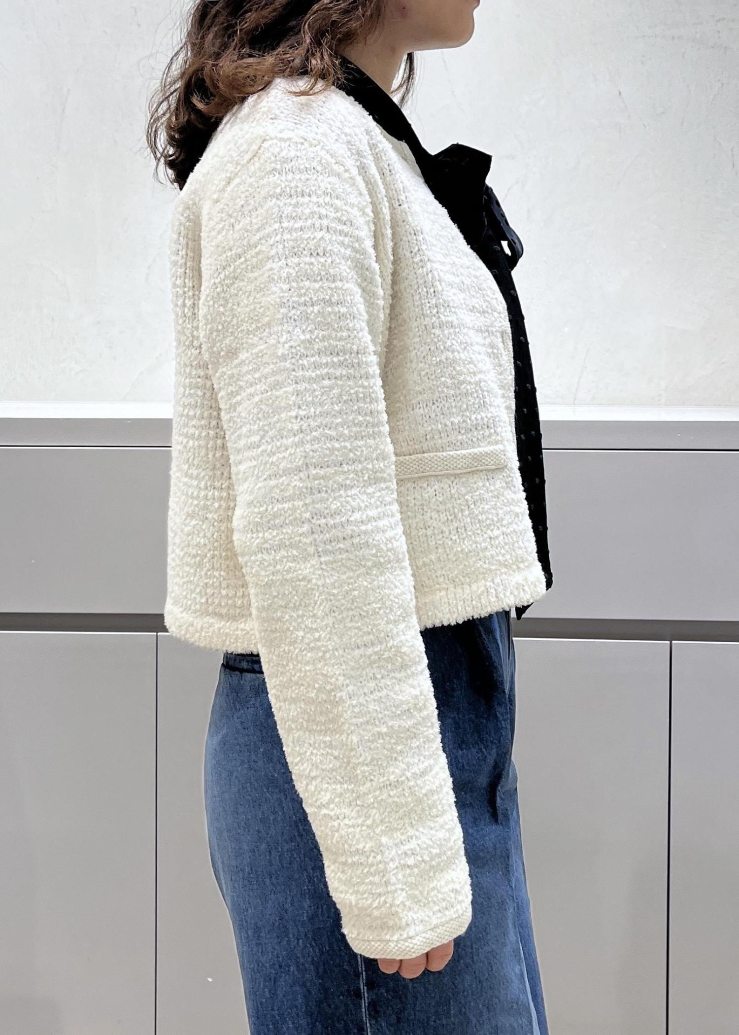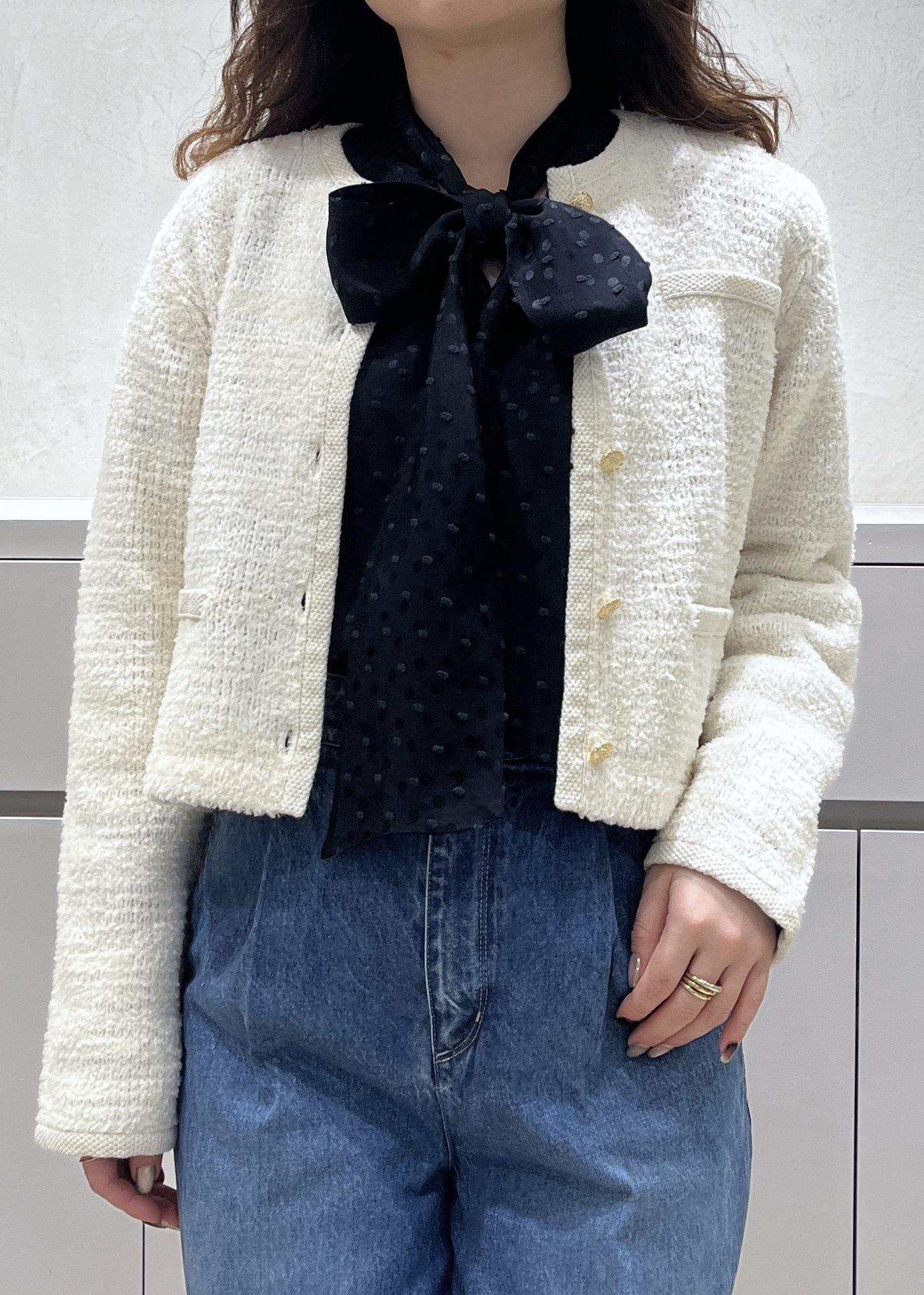 ツイードカーディガンやボウタイブラウスは