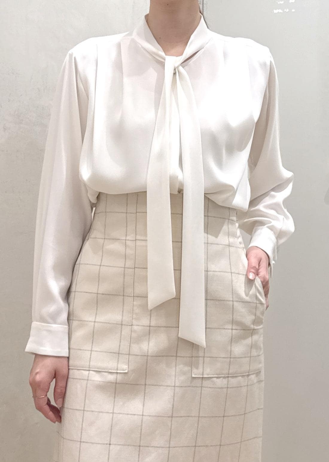 ROPÉボウタイブラウス/イージーケア・26SSホワイト / F¥22,000レビューややゆとりがあるサイズ感で、ヒップにかかる長さです。シワになりにくく、ご自宅でのお洗濯可能。