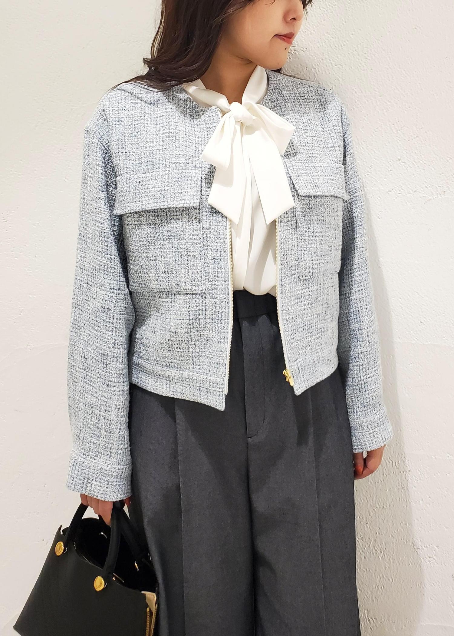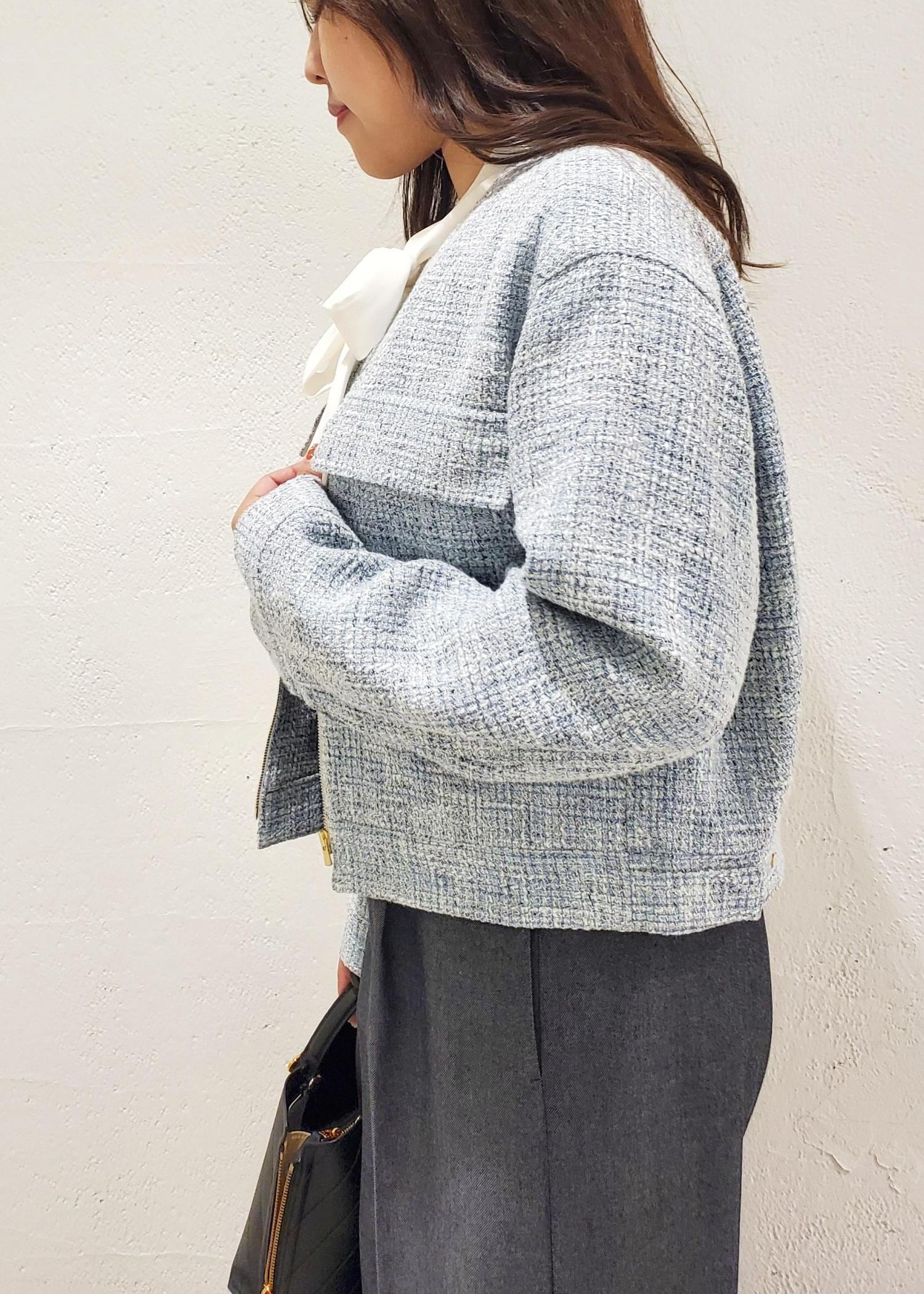 アウトレットROPÉツイードノーカラージャケットサックス / F¥36,960レビュー肩や腕周りがゆったりしているので厚手のニットの上からでも重ねやすいです。