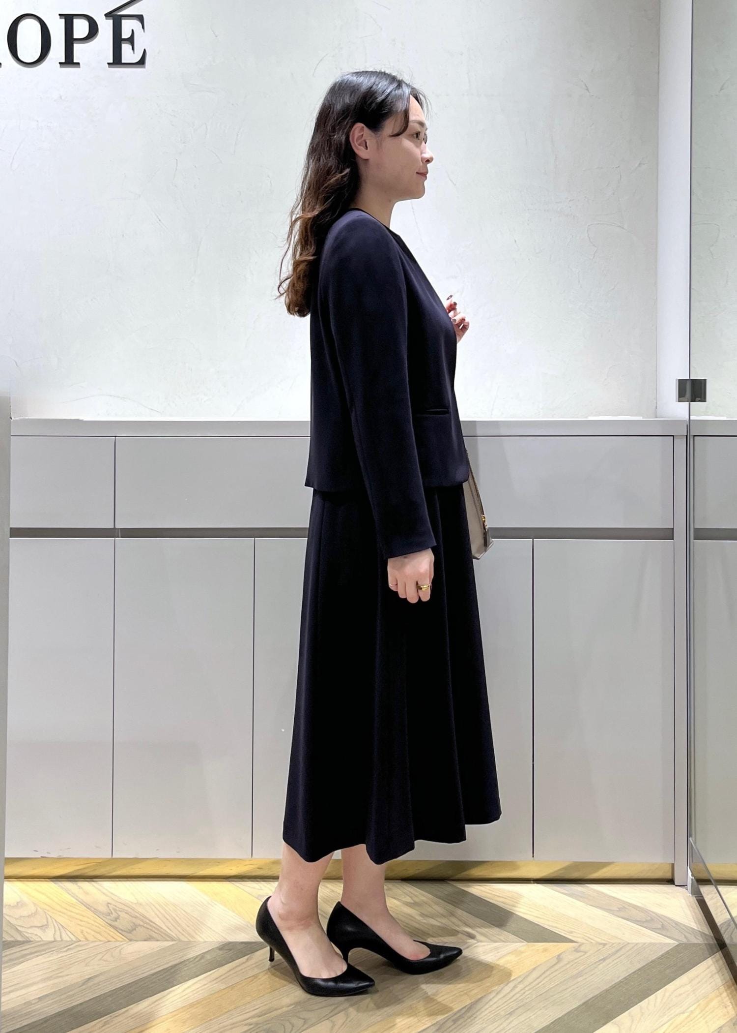ROPÉトリアセダブルクロス セミフレアーワンピース/イージーケア・セットアップ対応・26SSネイビー / 36¥33,000レビュー36サイズを着用しています。
