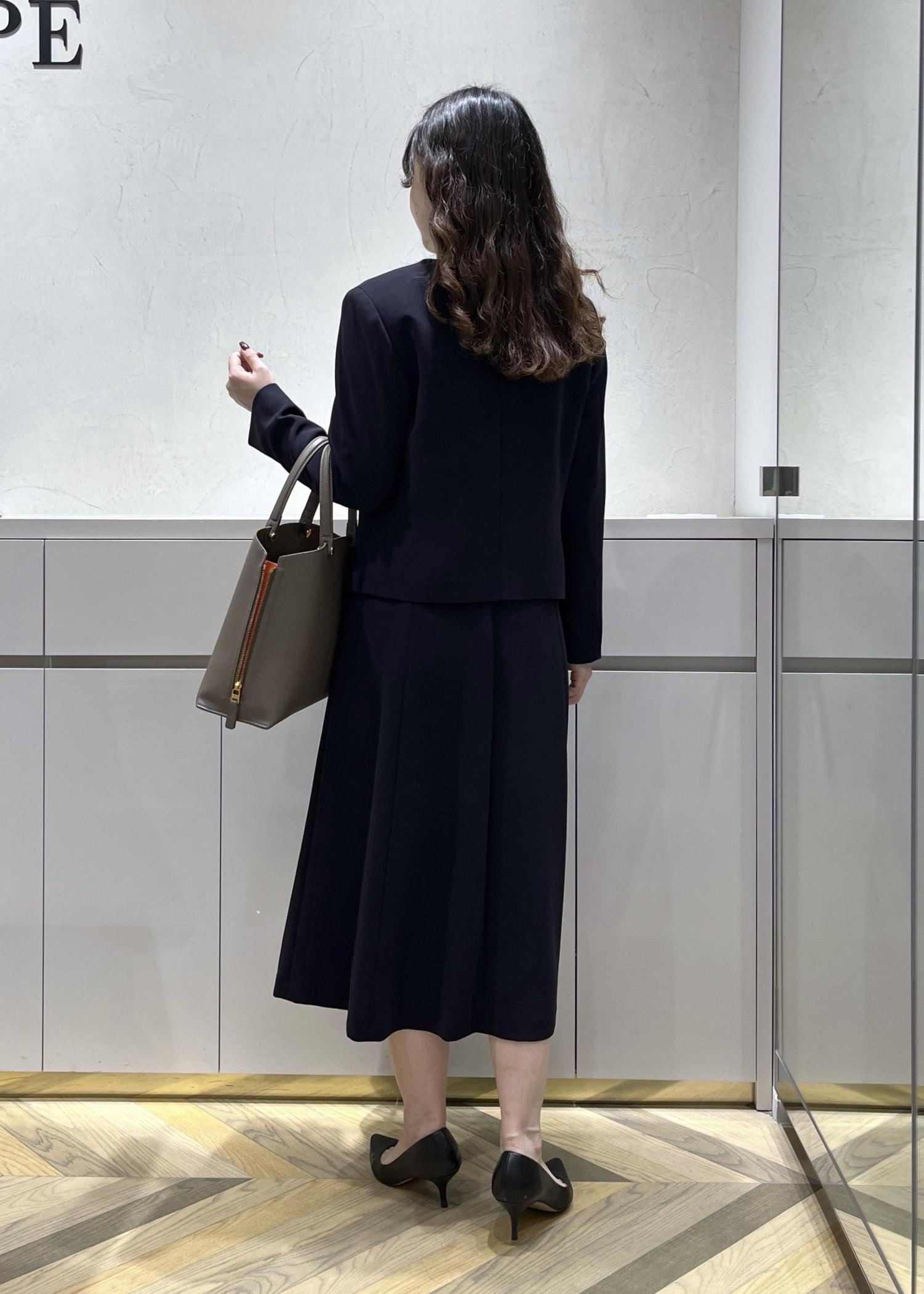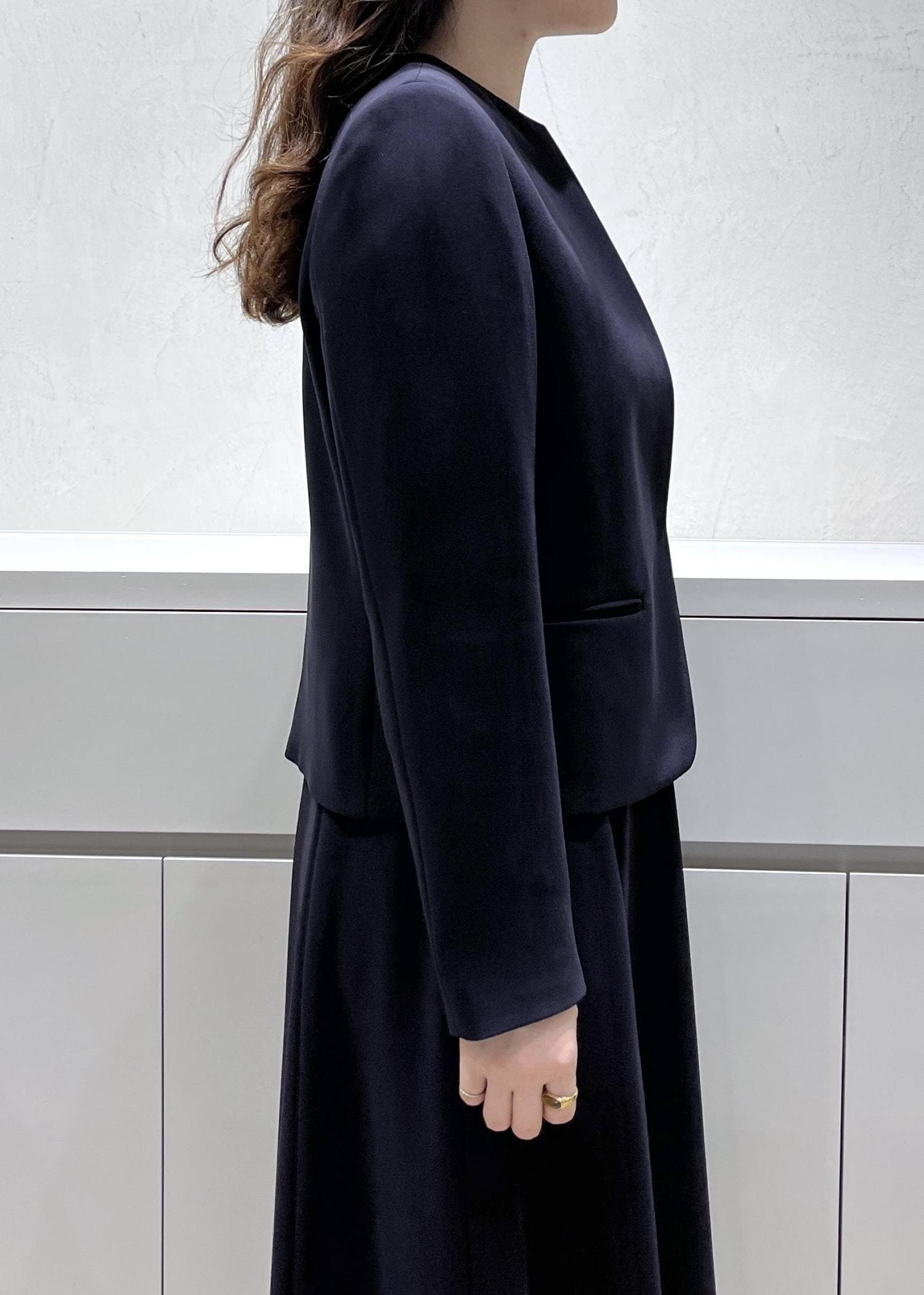 肩幅はジャストサイズ、着丈はふくらはぎ真ん中あたり。袖丈は手首より3cmほど上の短めで、ジャケットを着た際に出ないようなつくりです。