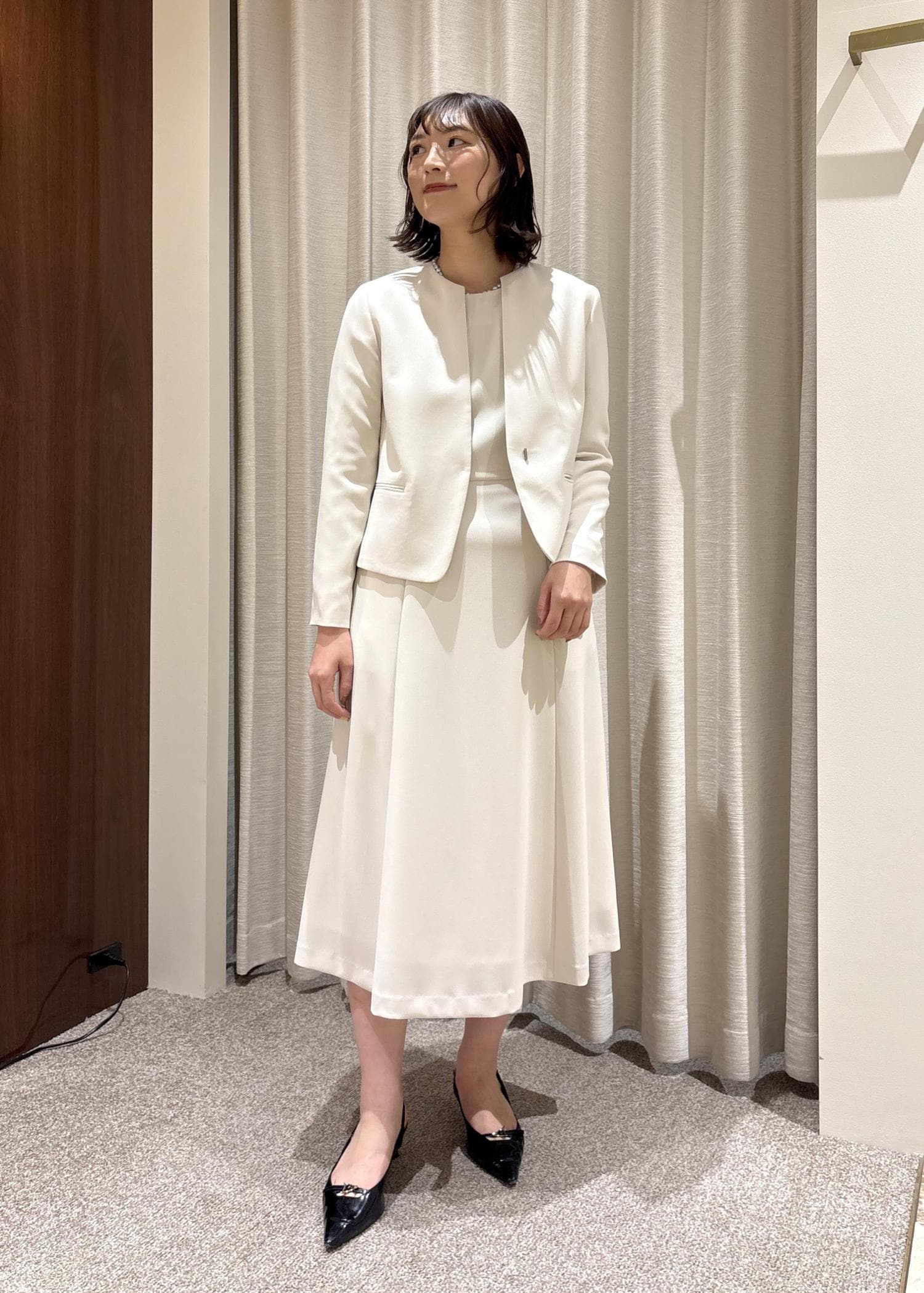 ラインが綺麗なワンピースと同素材のジャケットを合わせ、