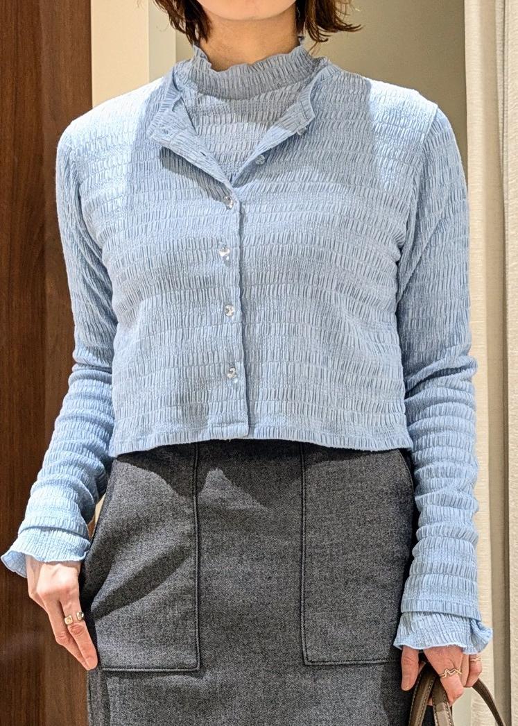 ROPÉボタニカルダイコンパクトカーディガン/イージーケア・アンサンブル対応サックス / F¥13,475レビュー生地表面が特徴的な、シャーリングカットソーのカーディガン。
