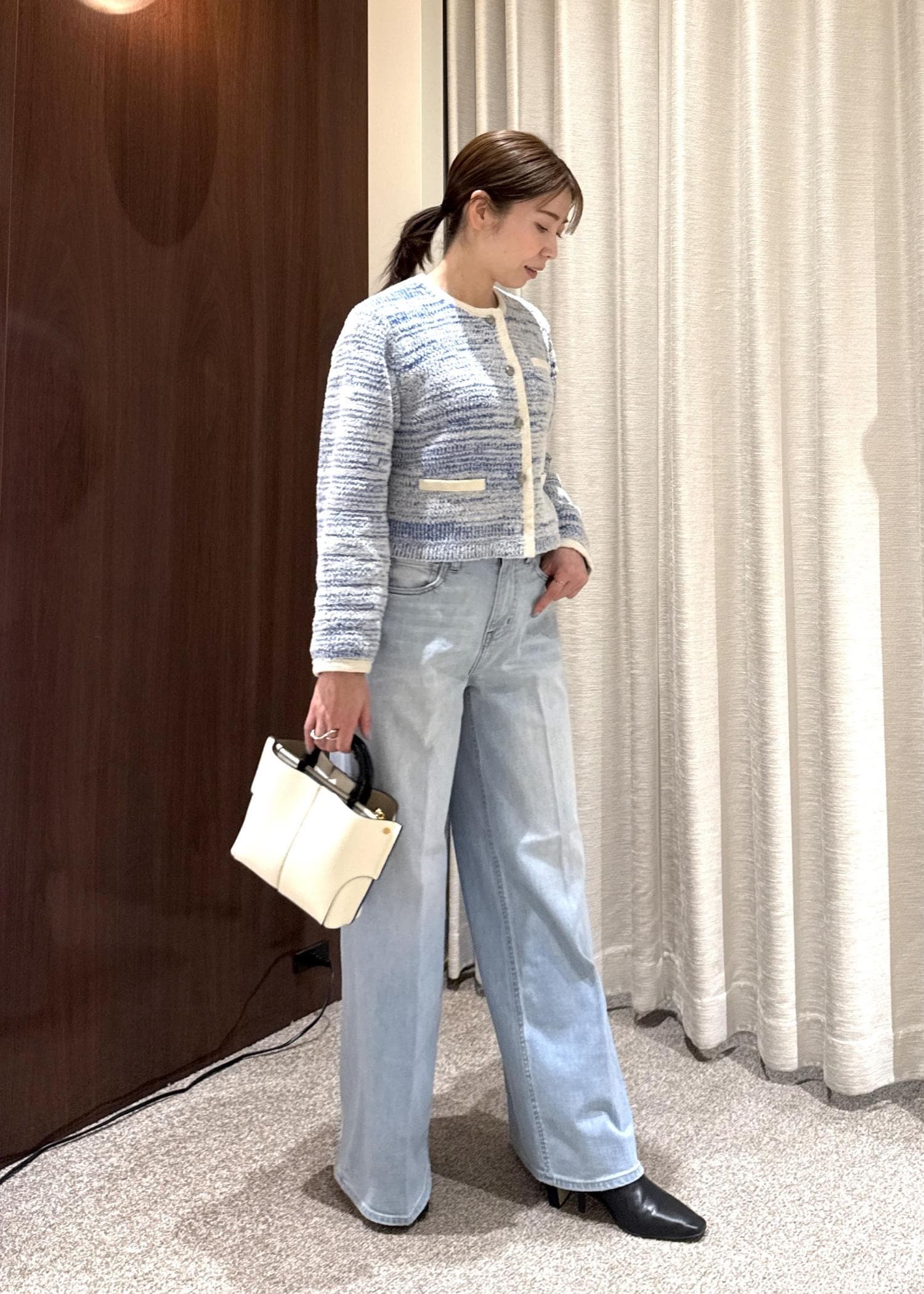 ツイード調カーディガンを主役に、ワイドデニムで程よく抜け感をプラス。