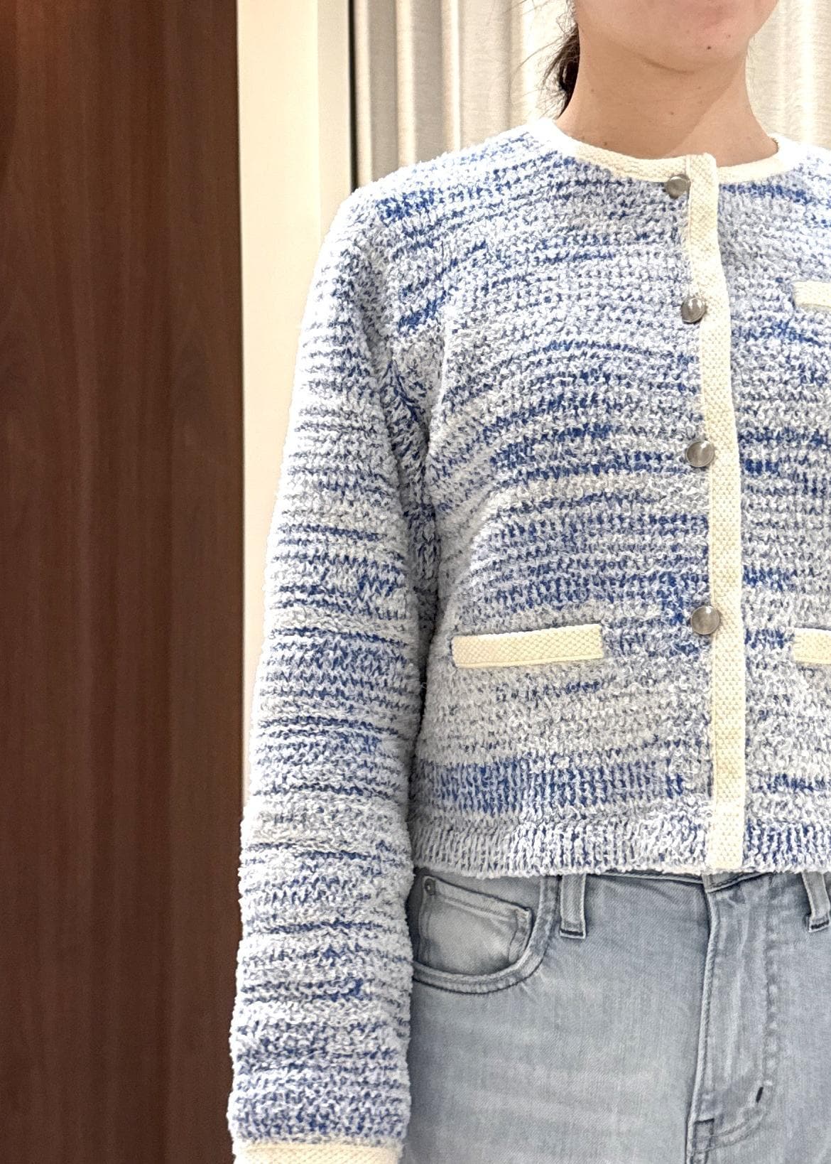 ROPÉツイードニットショート丈カーディガン/イージーケアブルー /¥26,180レビューコンパクトなサイズ感ですが、アーム部分は余裕があるので着心地◎綿ナイロンのお素材なので、春先までお使いいただけます。