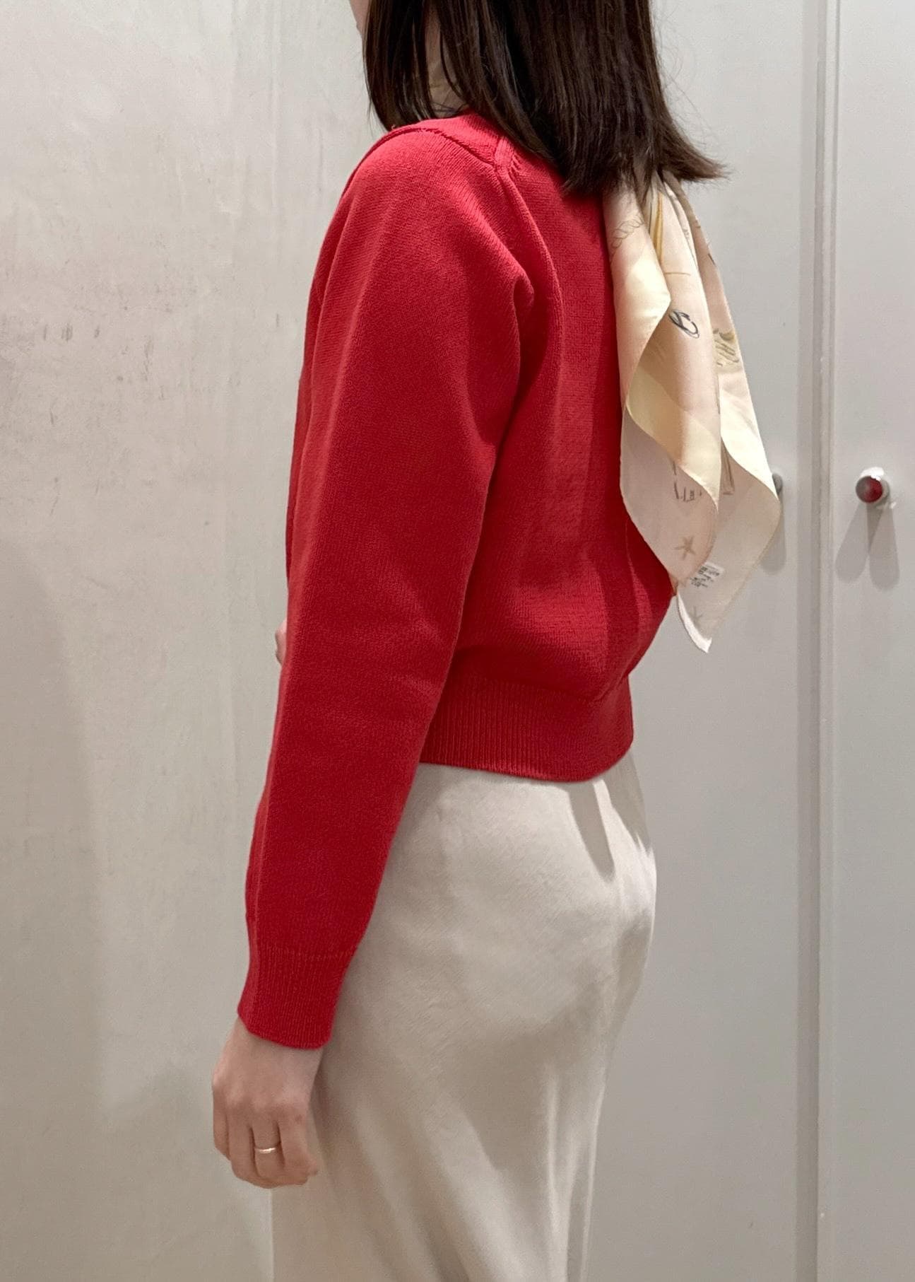 目を惹くレッドのカーディガンに