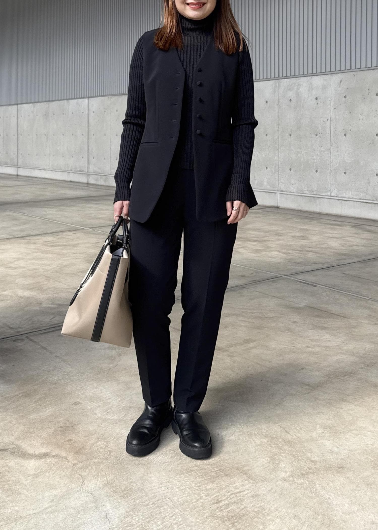 NEW!ROPÉダブルクロスストレッチフレアジレ/接触冷感・イージーケア・セットアップ対応ブラック / F¥27,500レビュー161センチの私が着てもお尻がすっぽり隠れる着丈です。