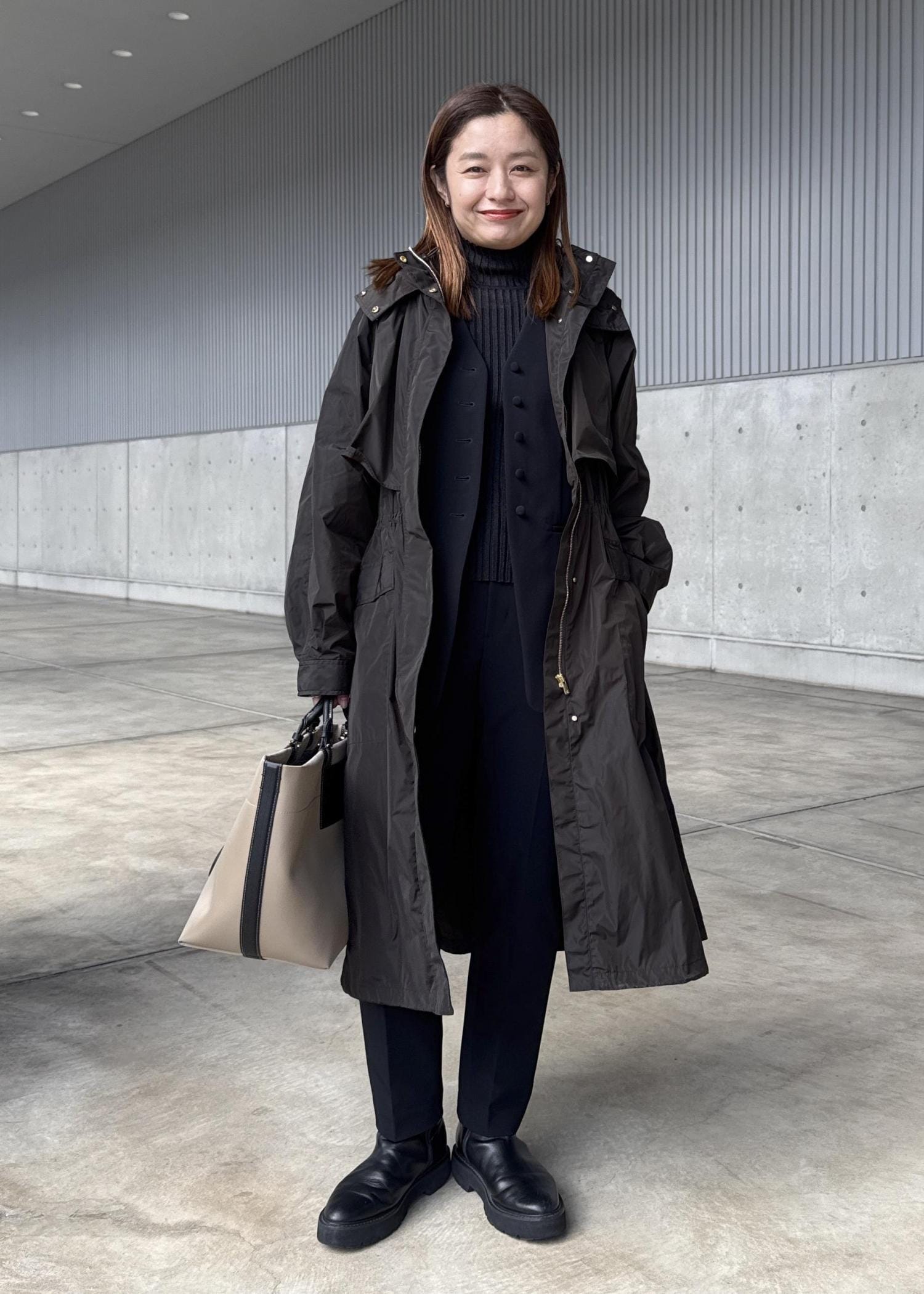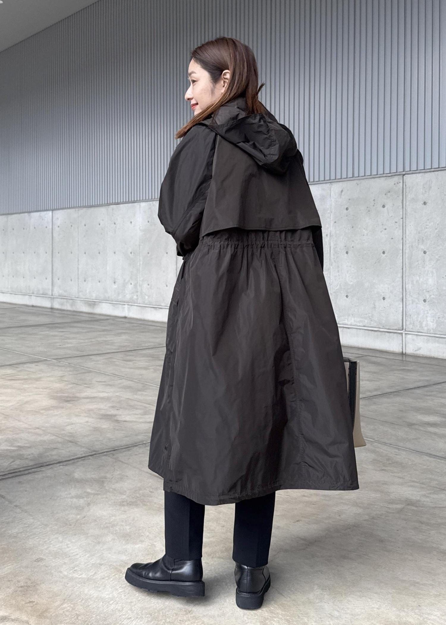 ROPÉ【撥水】タフタフーデッドロング丈マンパライクコートダークブラウン / F¥69,300レビュー上品な光沢とハリ感のある撥水ナイロンで使い勝手のいいロングコートです。