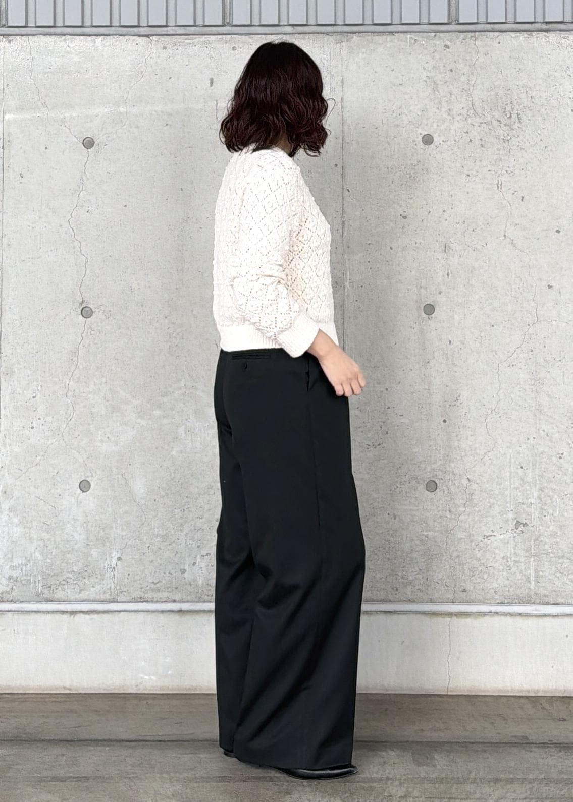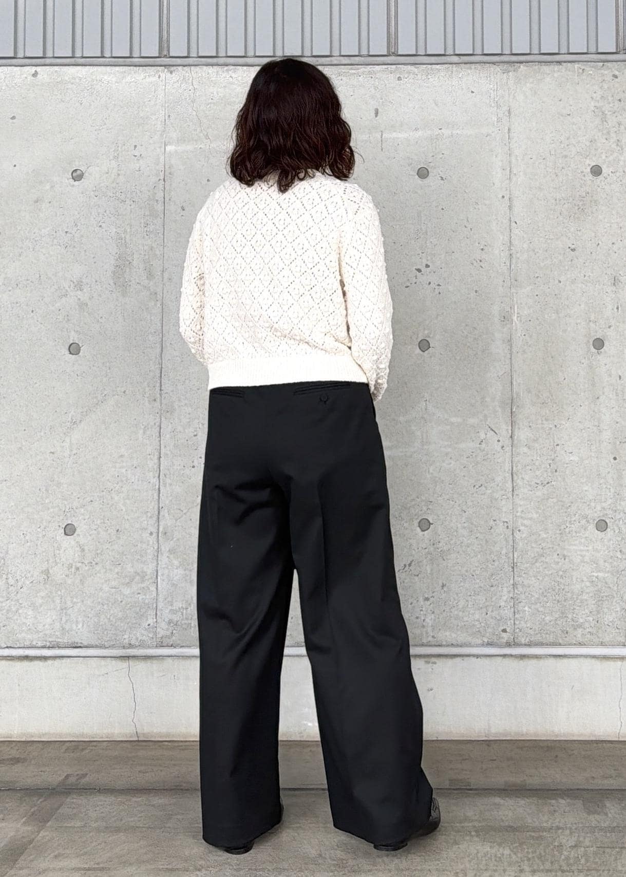 ウエストゴム仕様のイージーワイドパンツです。イージーな仕様ですがラフになり過ぎずきちんと見えするワイドパンツです。同素材でジャケットとスカートがありセットアップでも着用可能です。 -