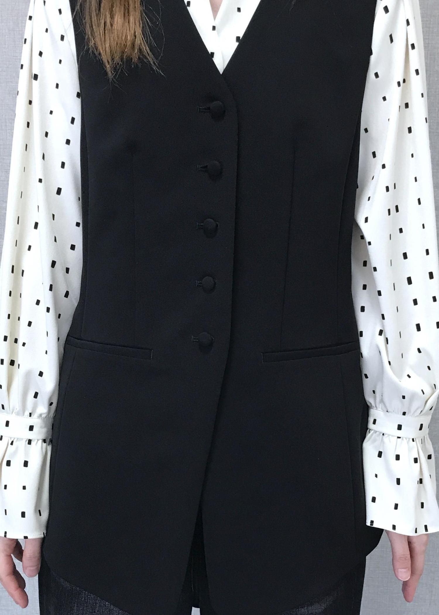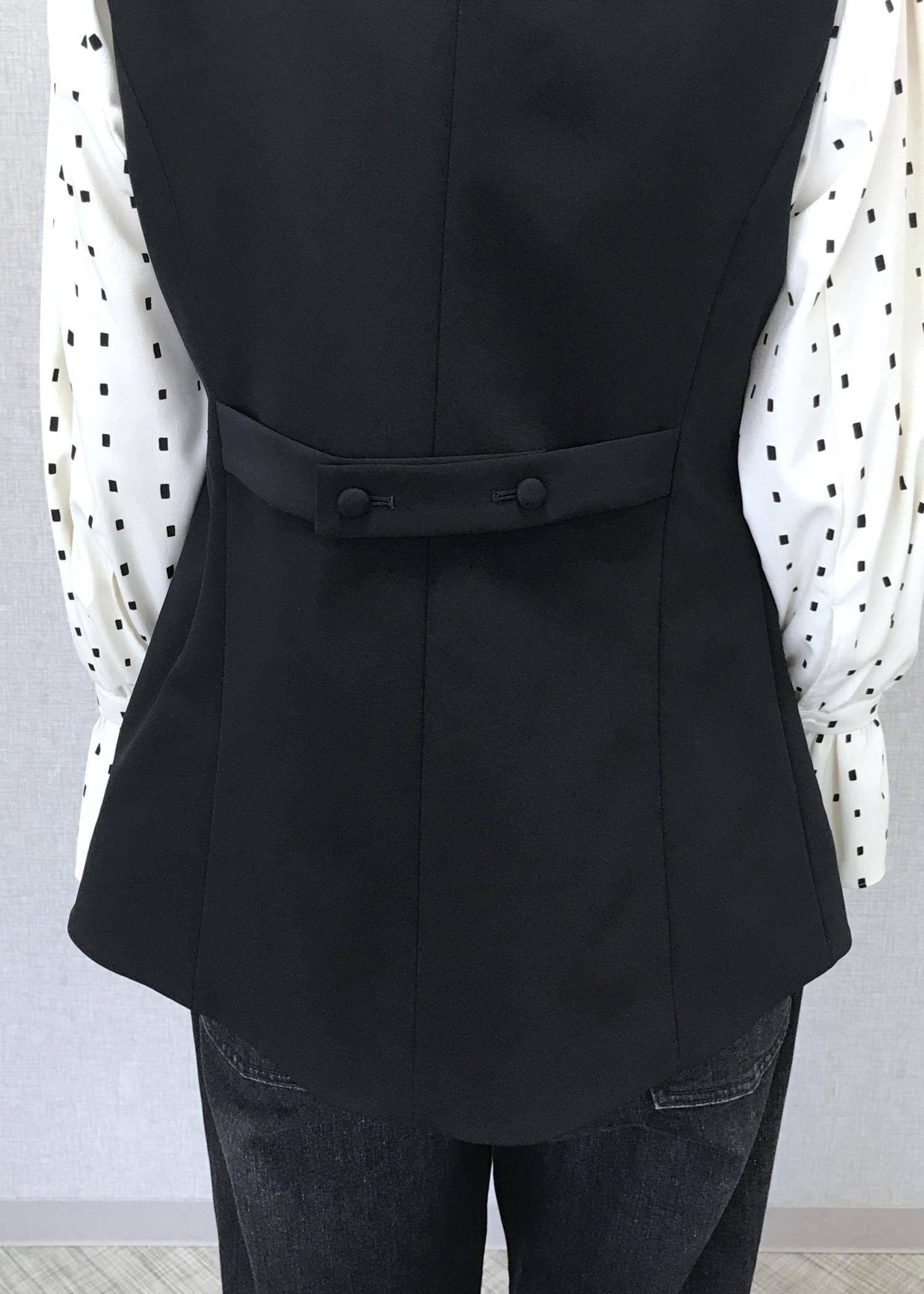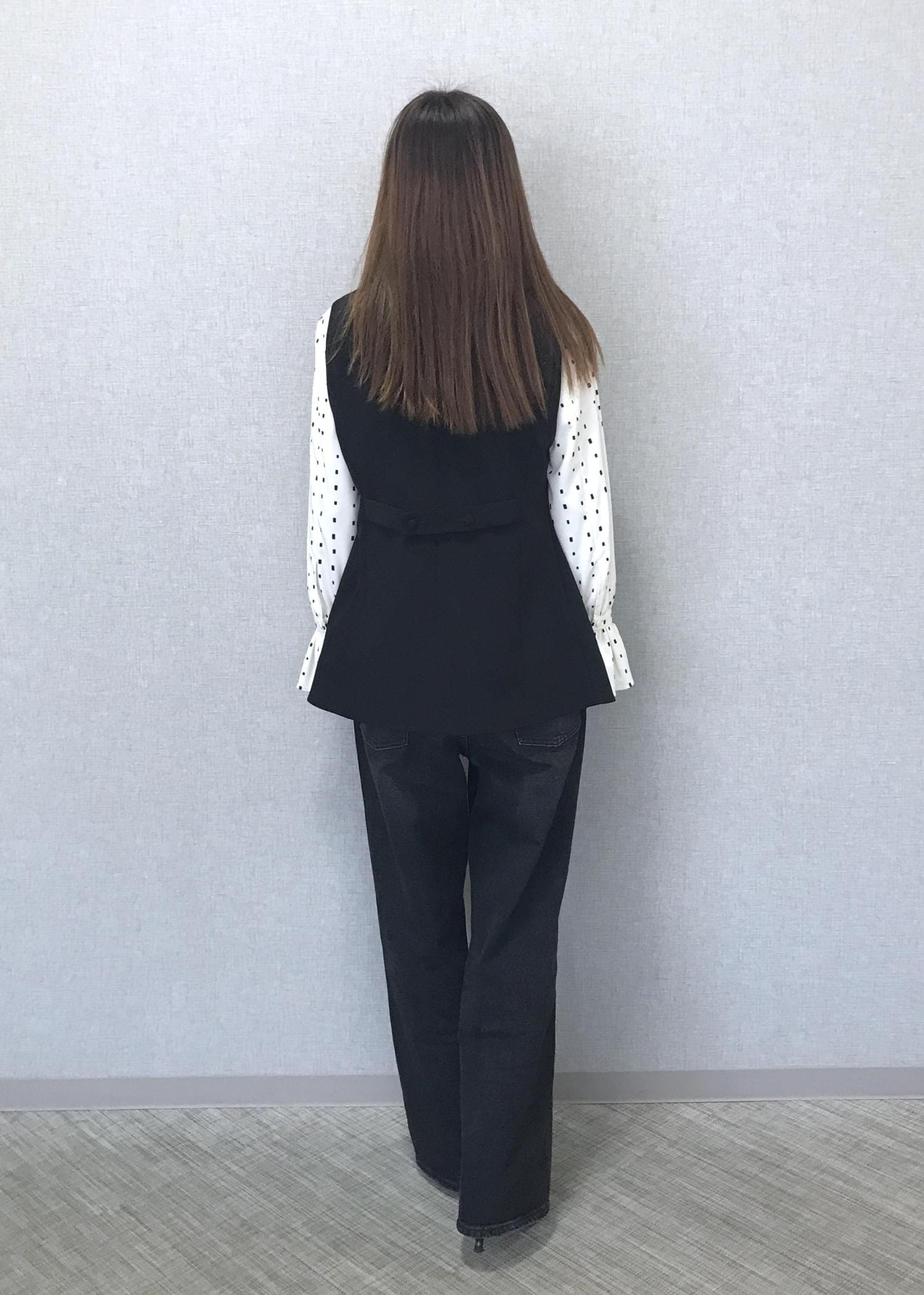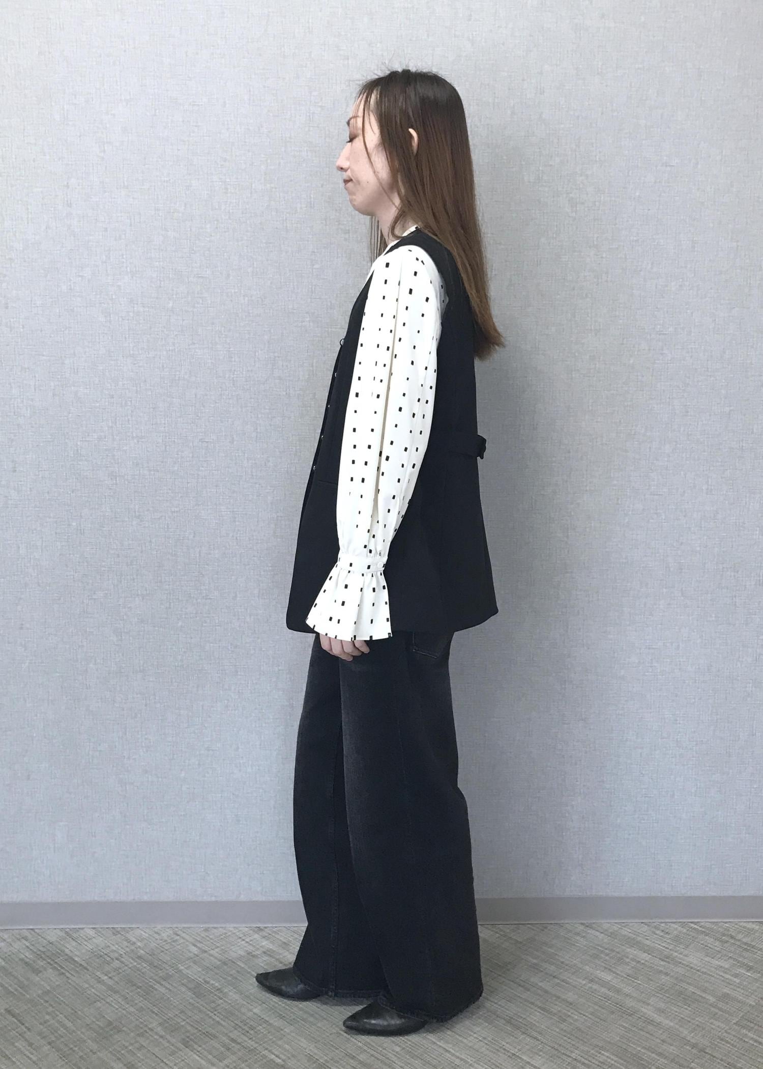 フォーマル感の出るブラックジレをブラックデニムに合わせて垢抜けコーディネートスタイルにしてみました。