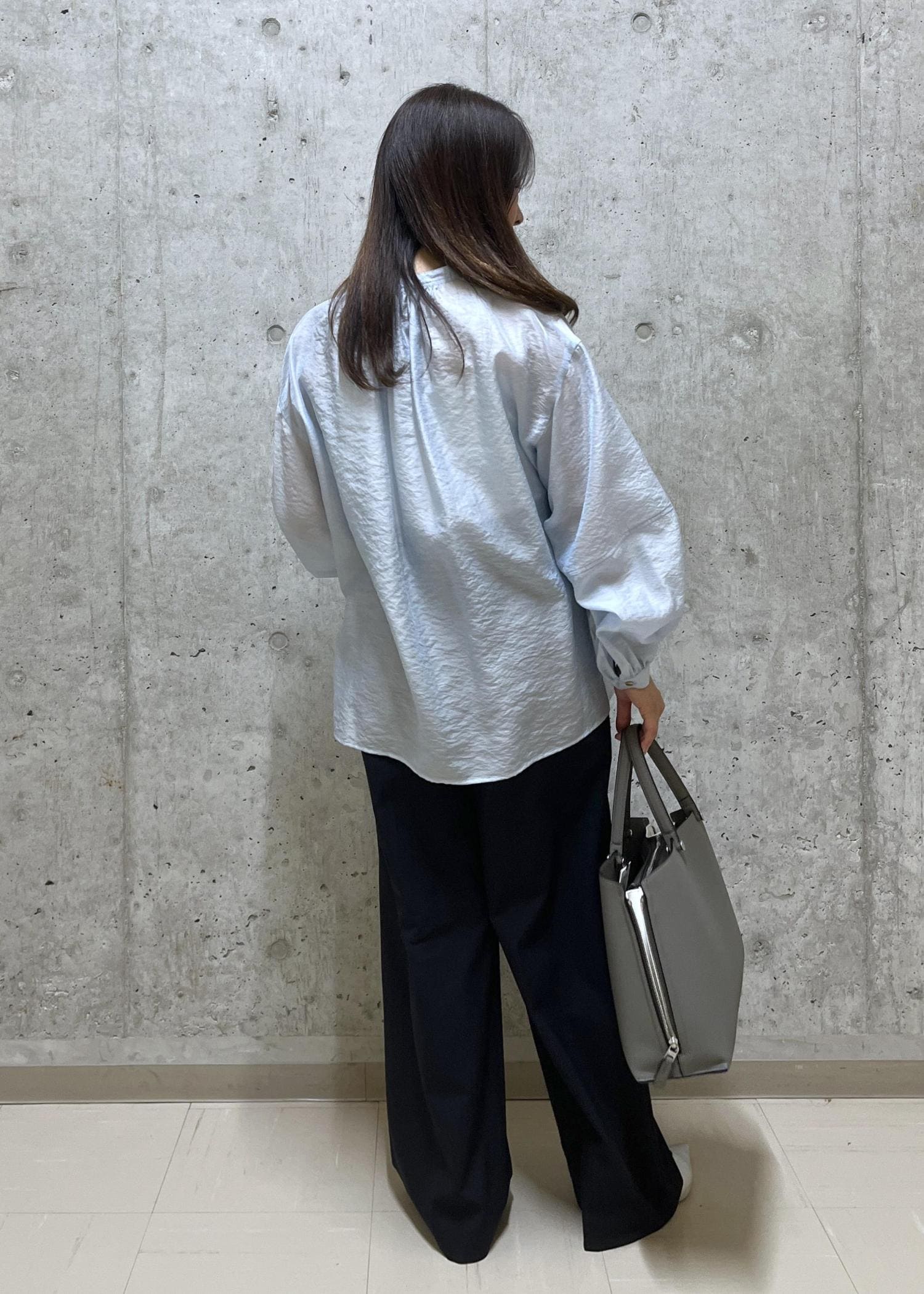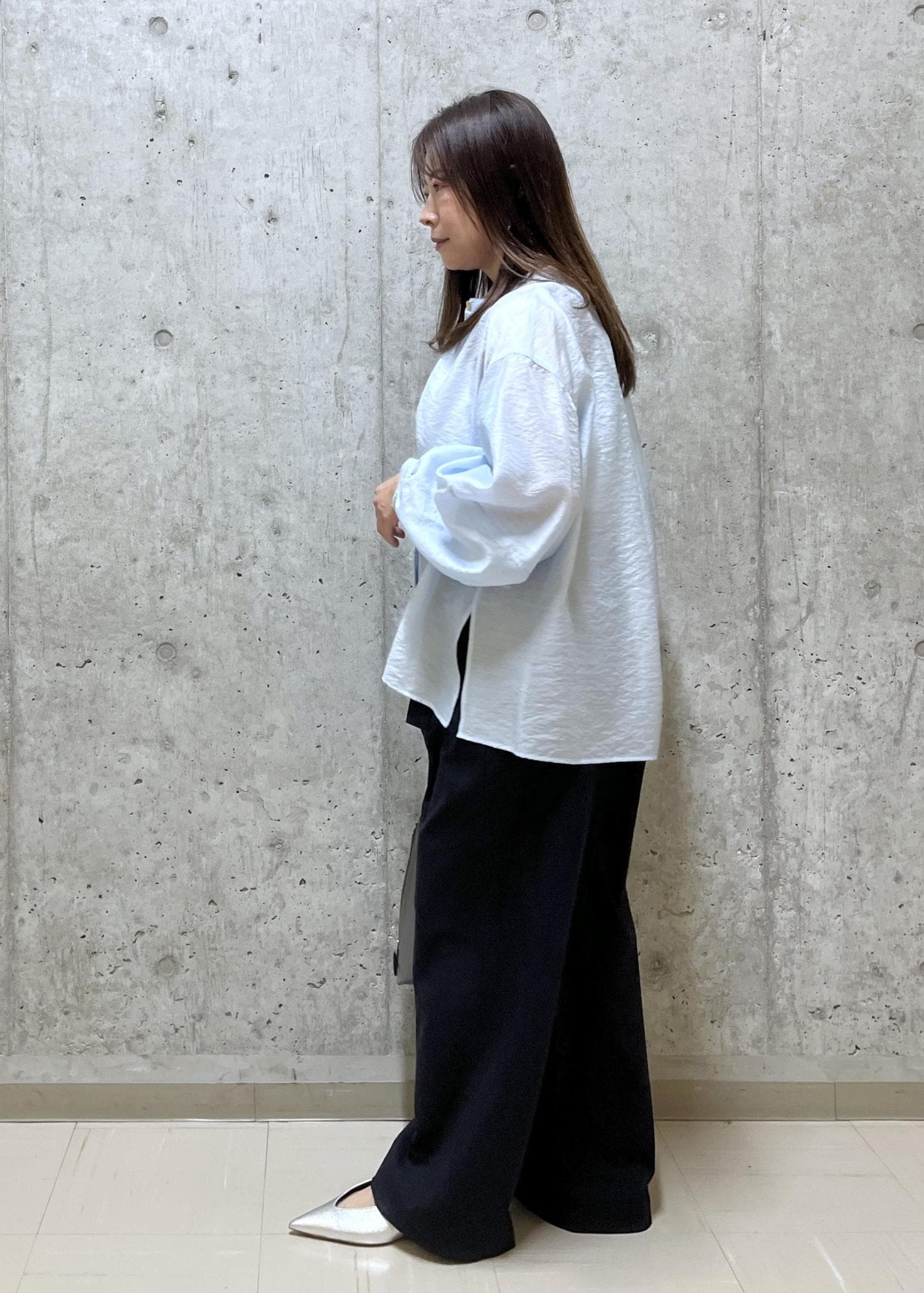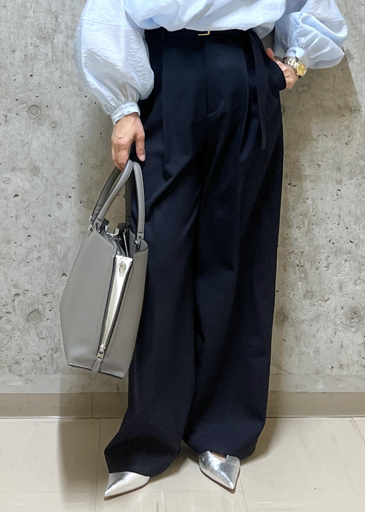 シアー感のあるシャツと太すぎないワイドパンツで、春らしい通勤スタイルです。