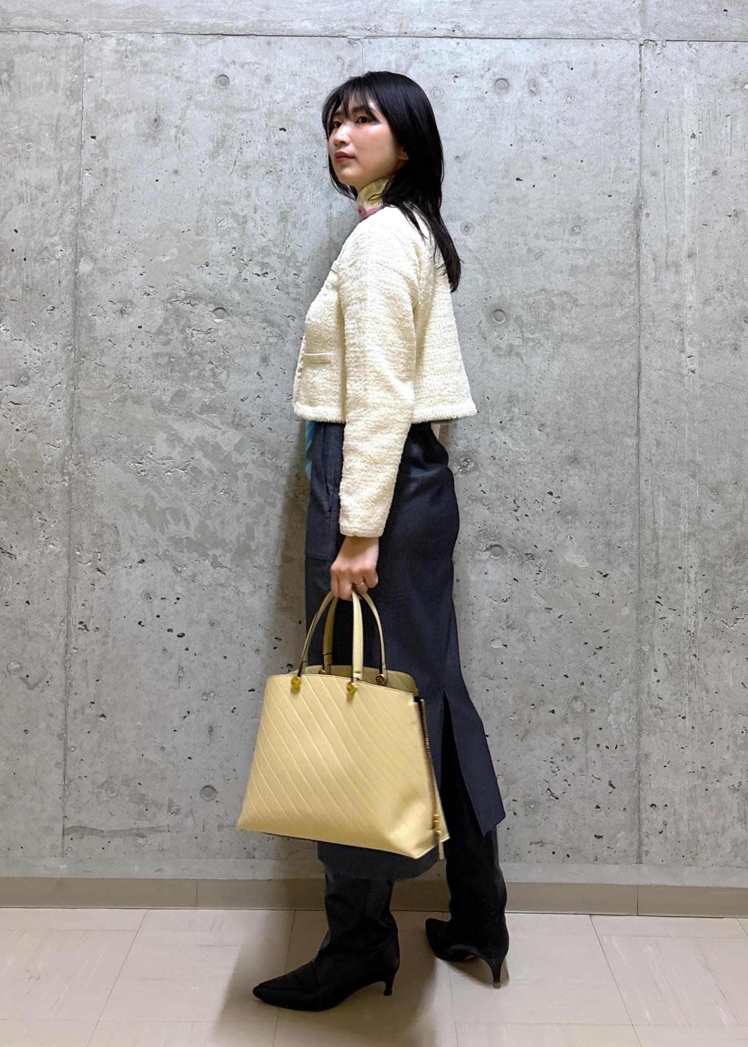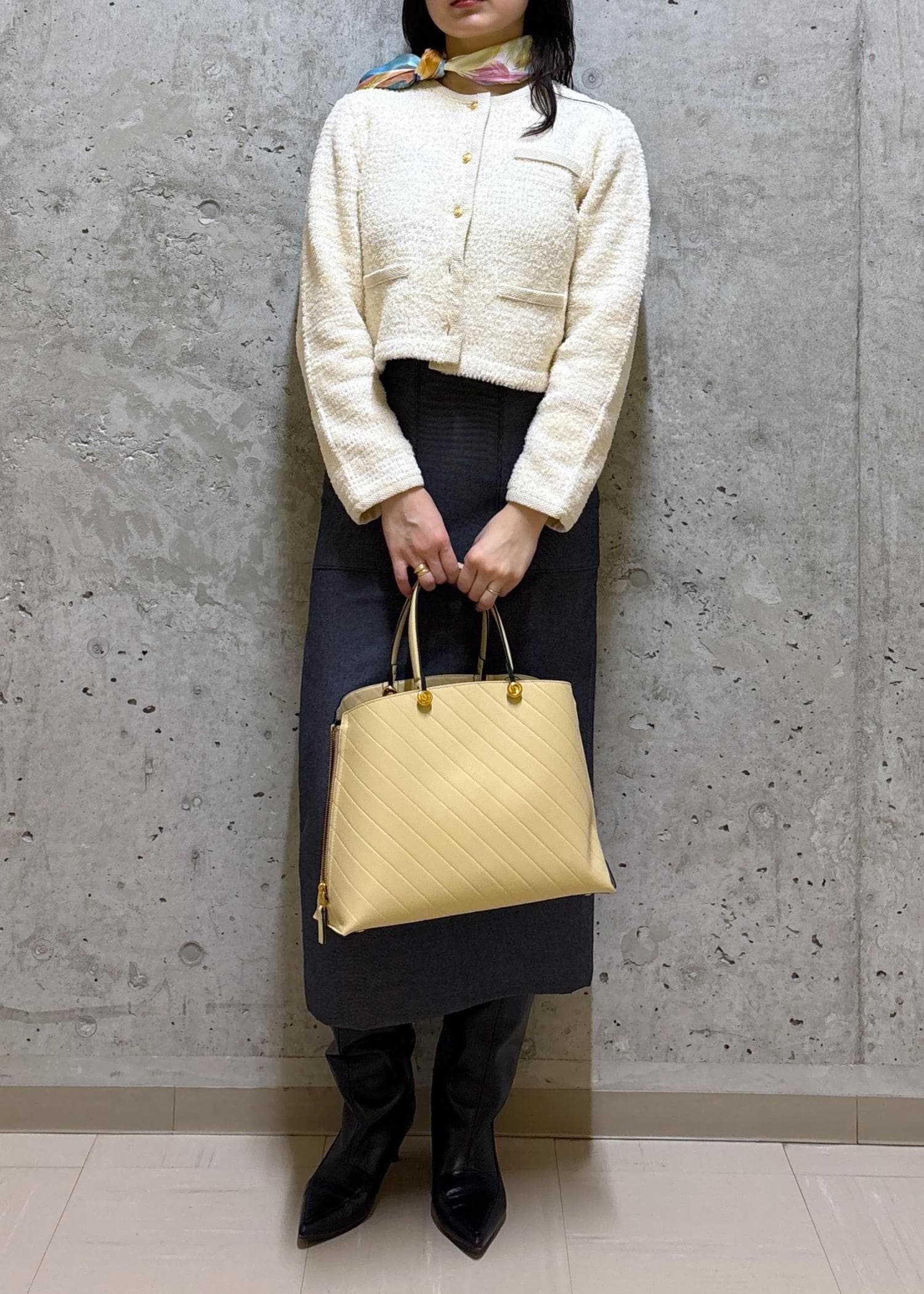 ツイードニットにスカーフで、きちんと感もこなれ感も♪