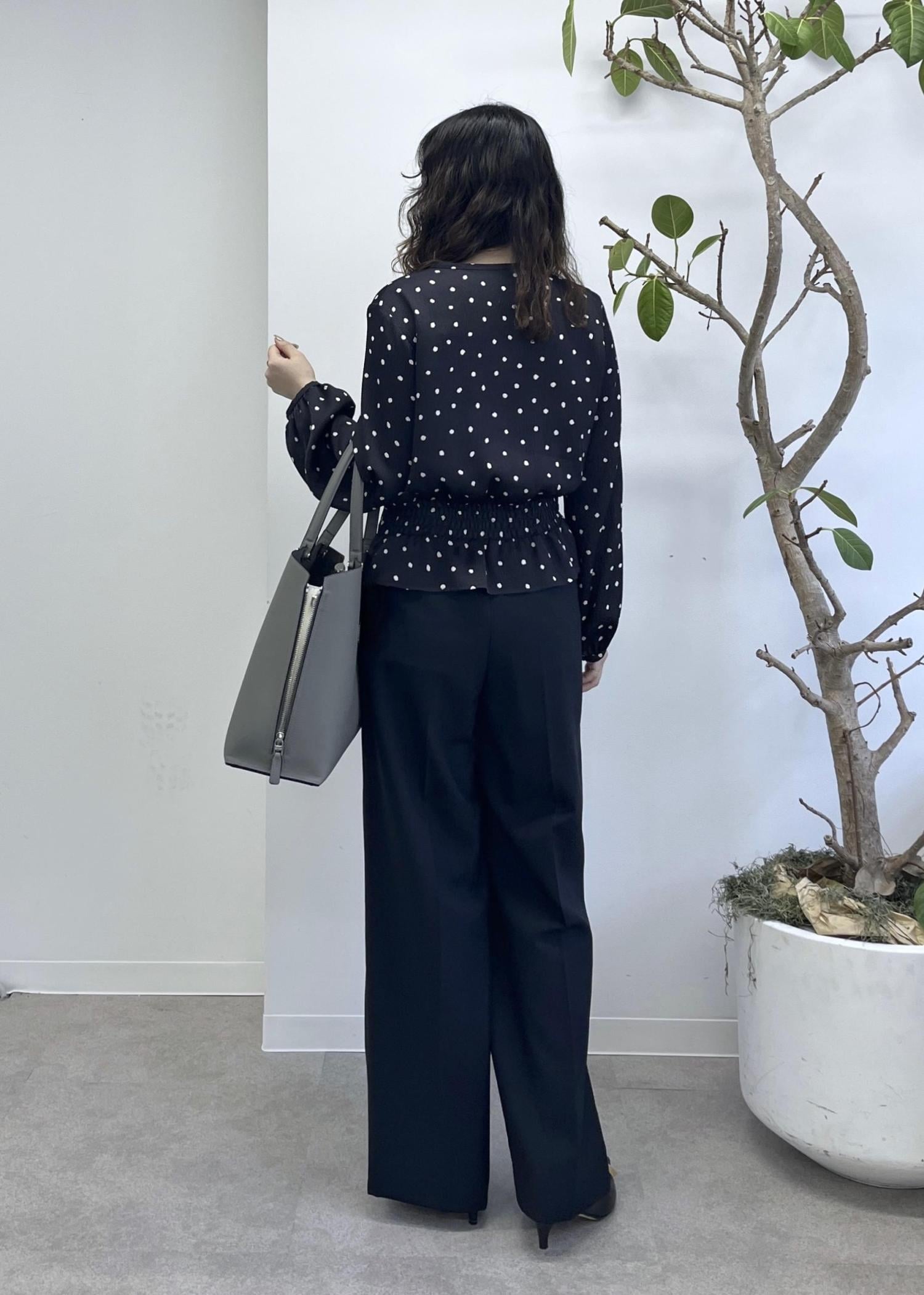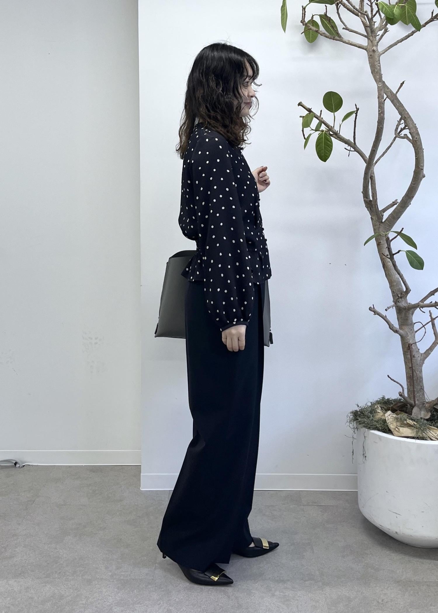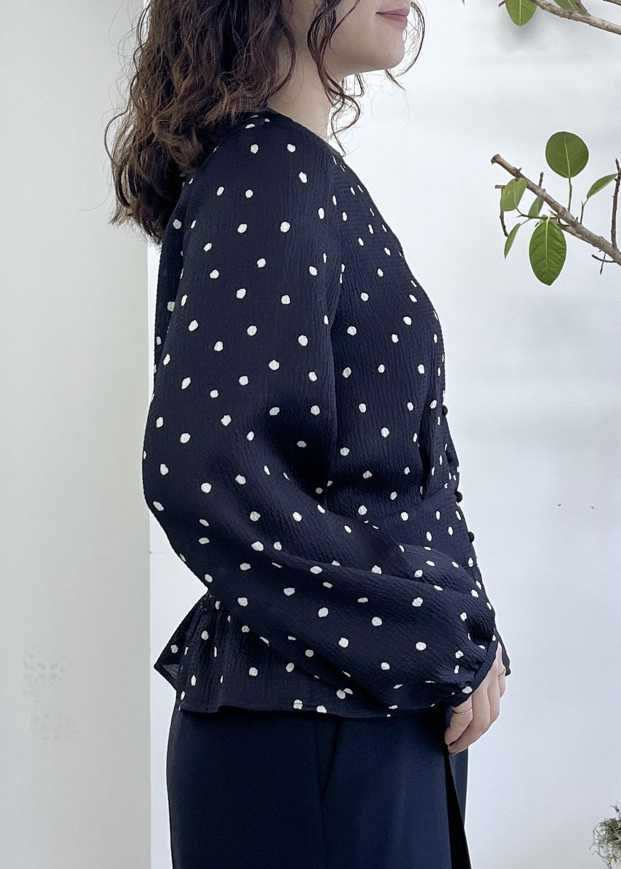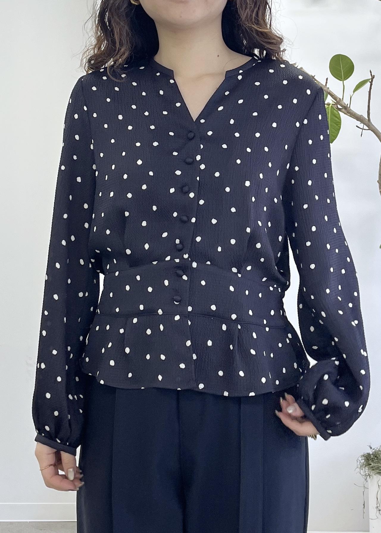 予約ROPÉドットプリントウエストタックペプラムブラウス/イージーケアネイビー / 38¥26,400レビューサンプルの38サイズを着用しています。