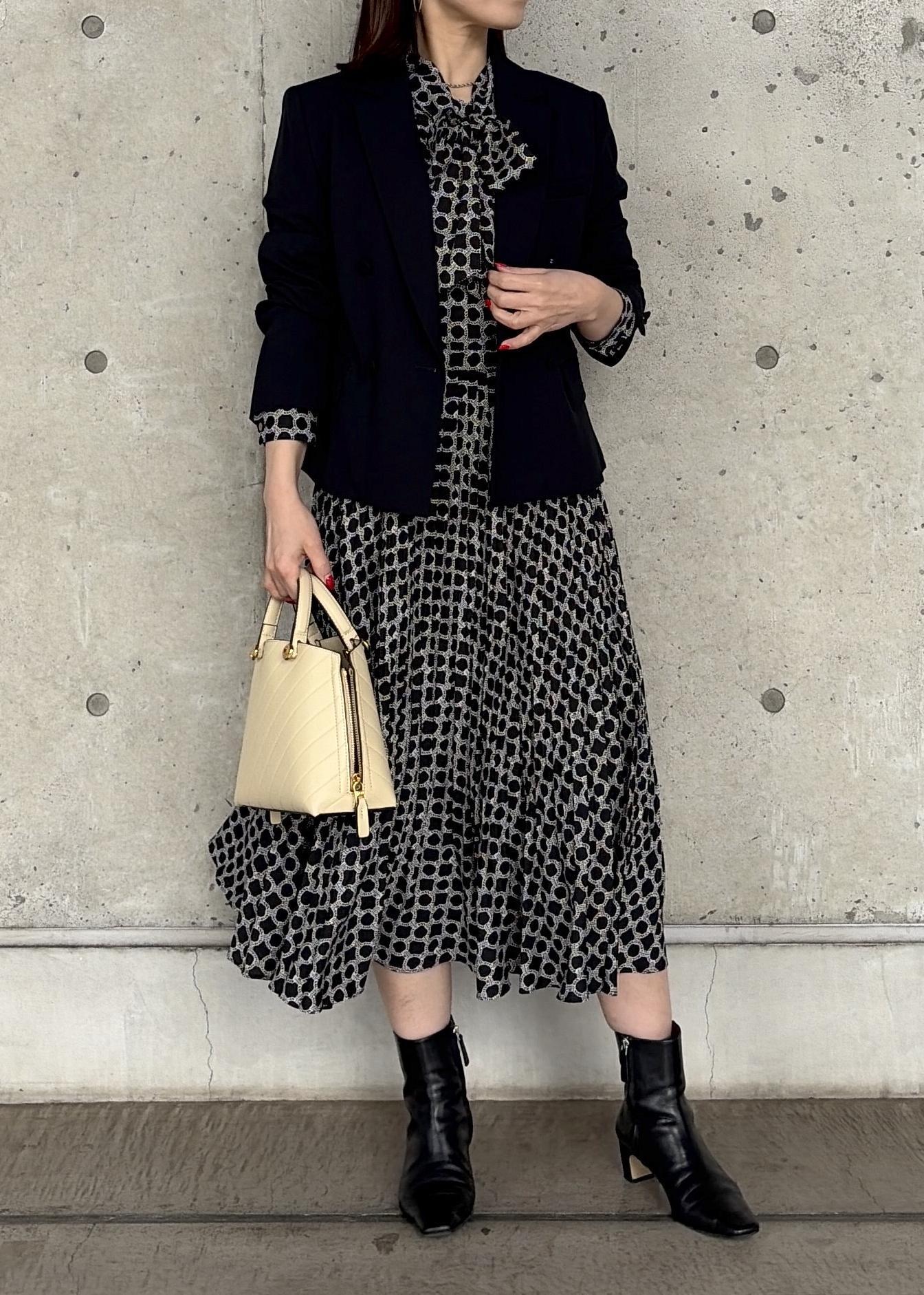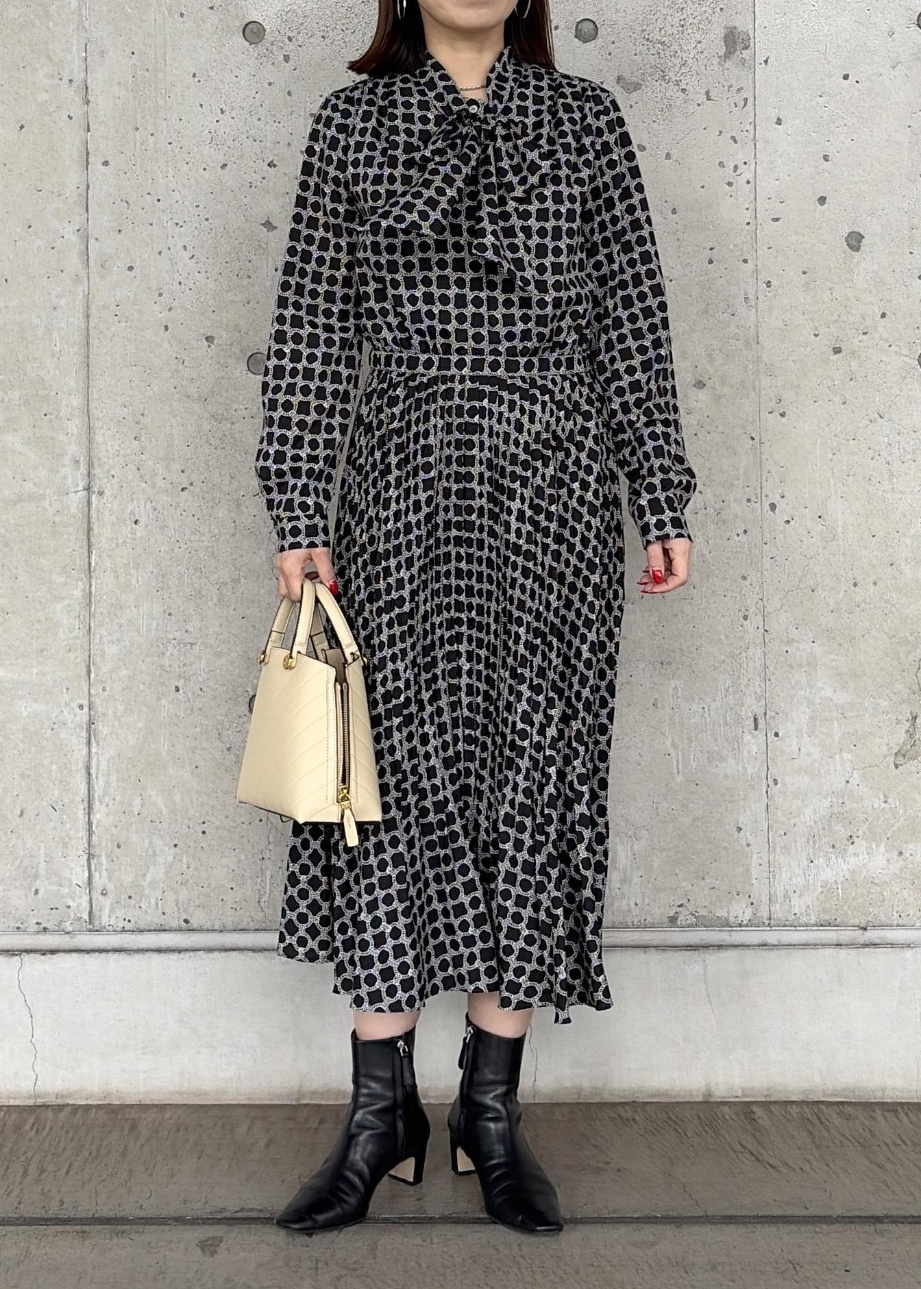 ROPÉship's rope' オリジナルプリントプリーツタイワンピースネイビー / 36¥49,500レビュー身長156cm、36サイズ着用。
