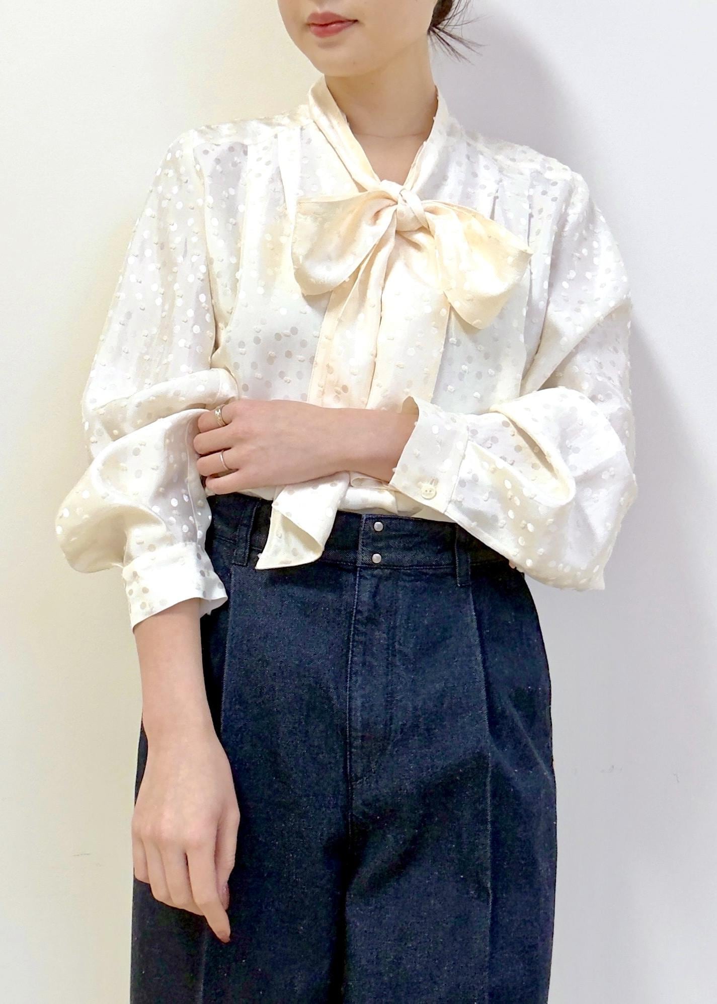 華やか見え抜群のボウタイブラウスをデニムで合わせ