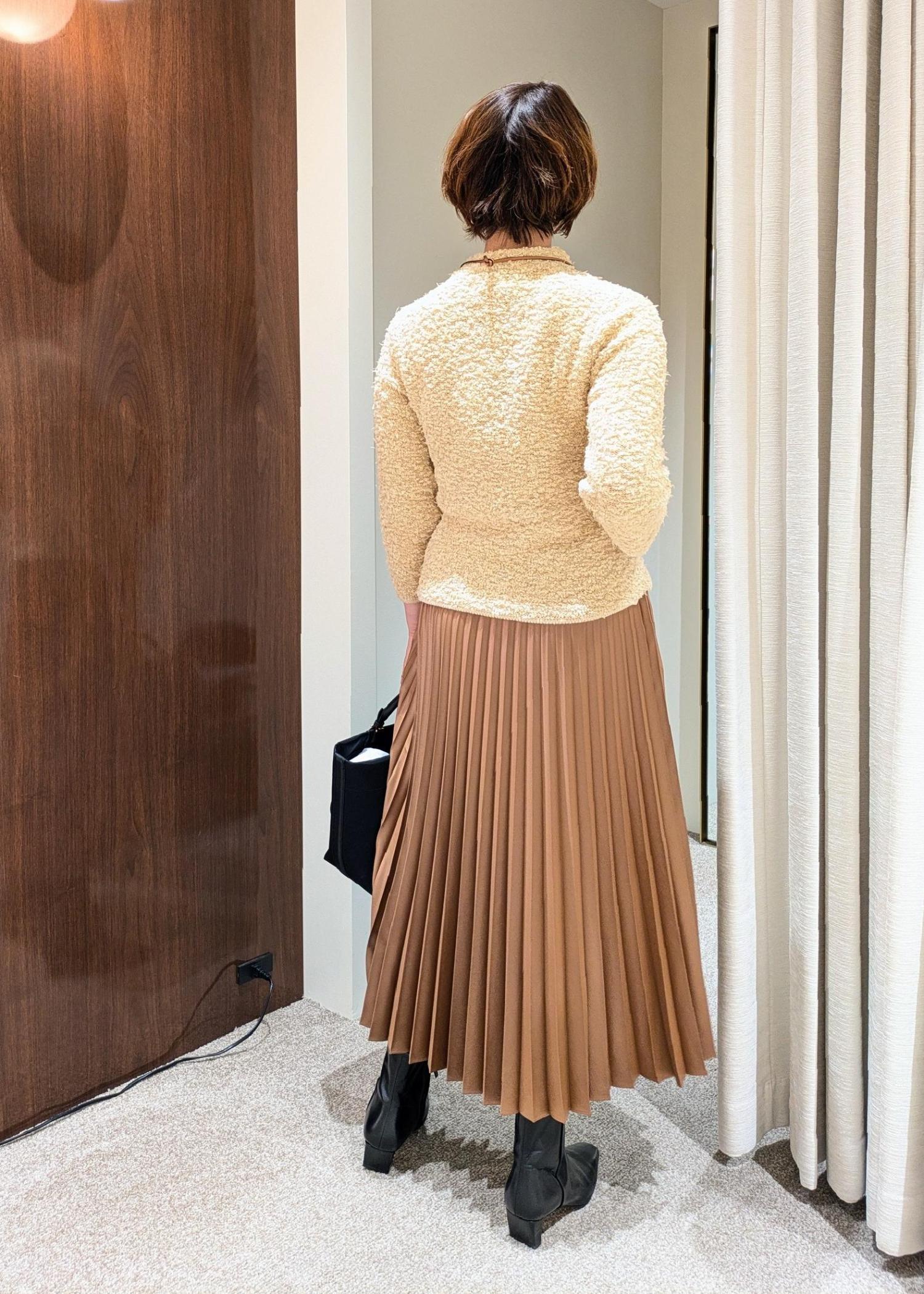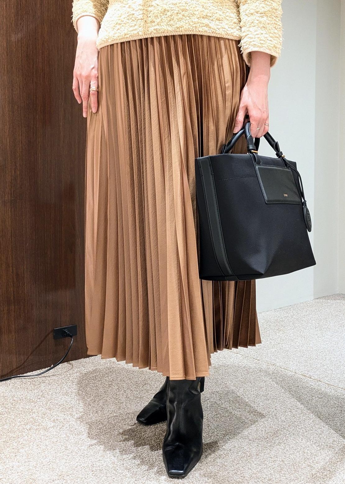 ROPÉシャイニープリーツスカート/イージーケアキャメル / F¥26,400レビューとても靭やかなポリエステル素材で、長めな丈感と太めのプリーツがクラシカルな雰囲気で素敵です。