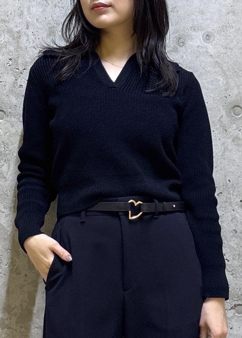 スキッパーデザインで首元すっきりと、裾も短めのウエスト丈でキュッと細くなっていて、スタイルアップして見えるニットです。