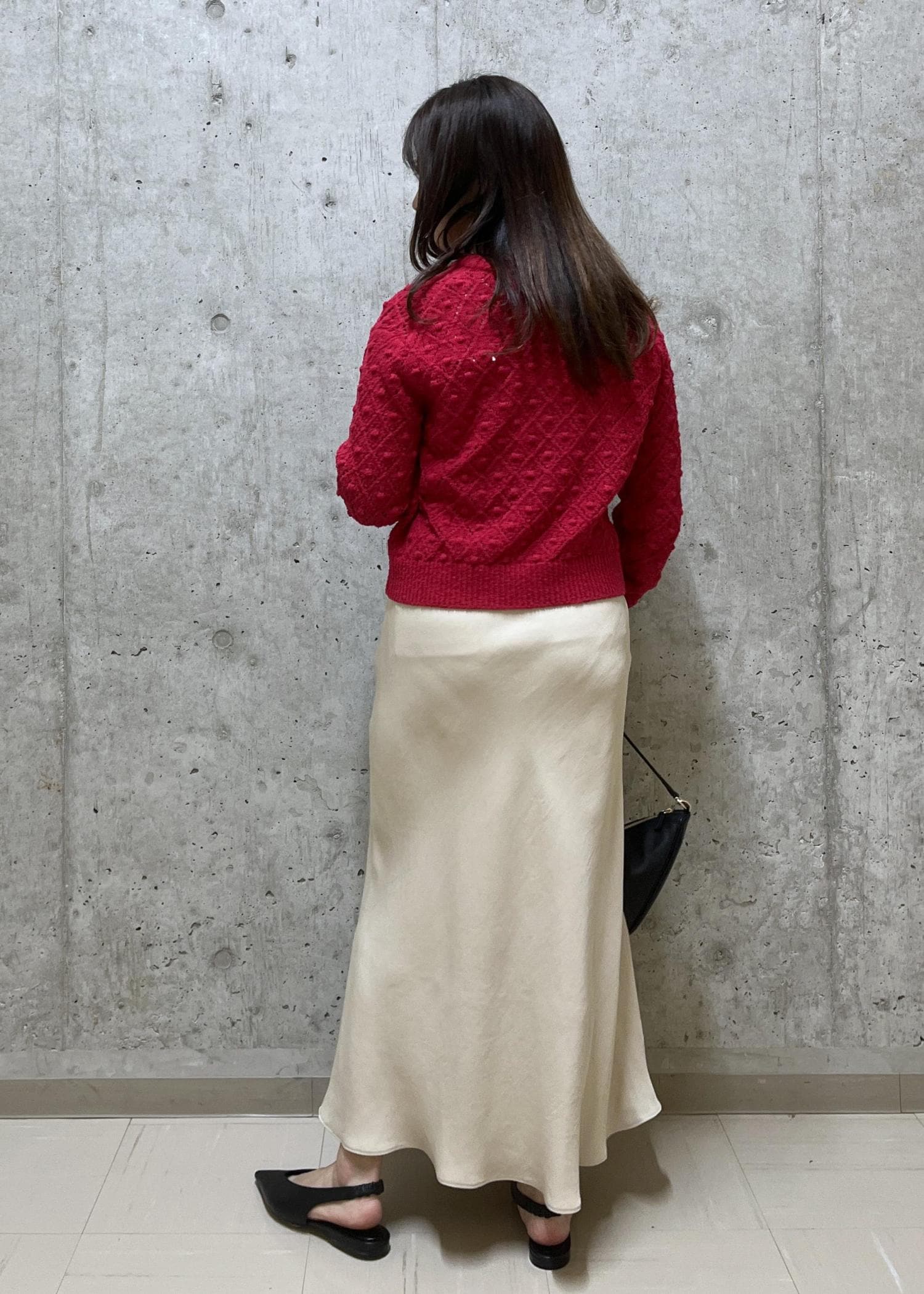 立体感のあるニットは、マーメイドのスカートと合わせて大きく見えないシルエットにしました。