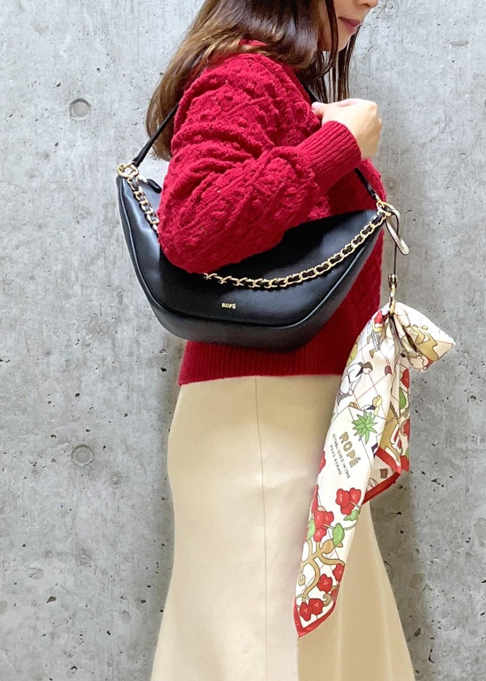 ニットの赤に合わせて、スカーフも赤色の入ったものをポイントにバックに付けました。