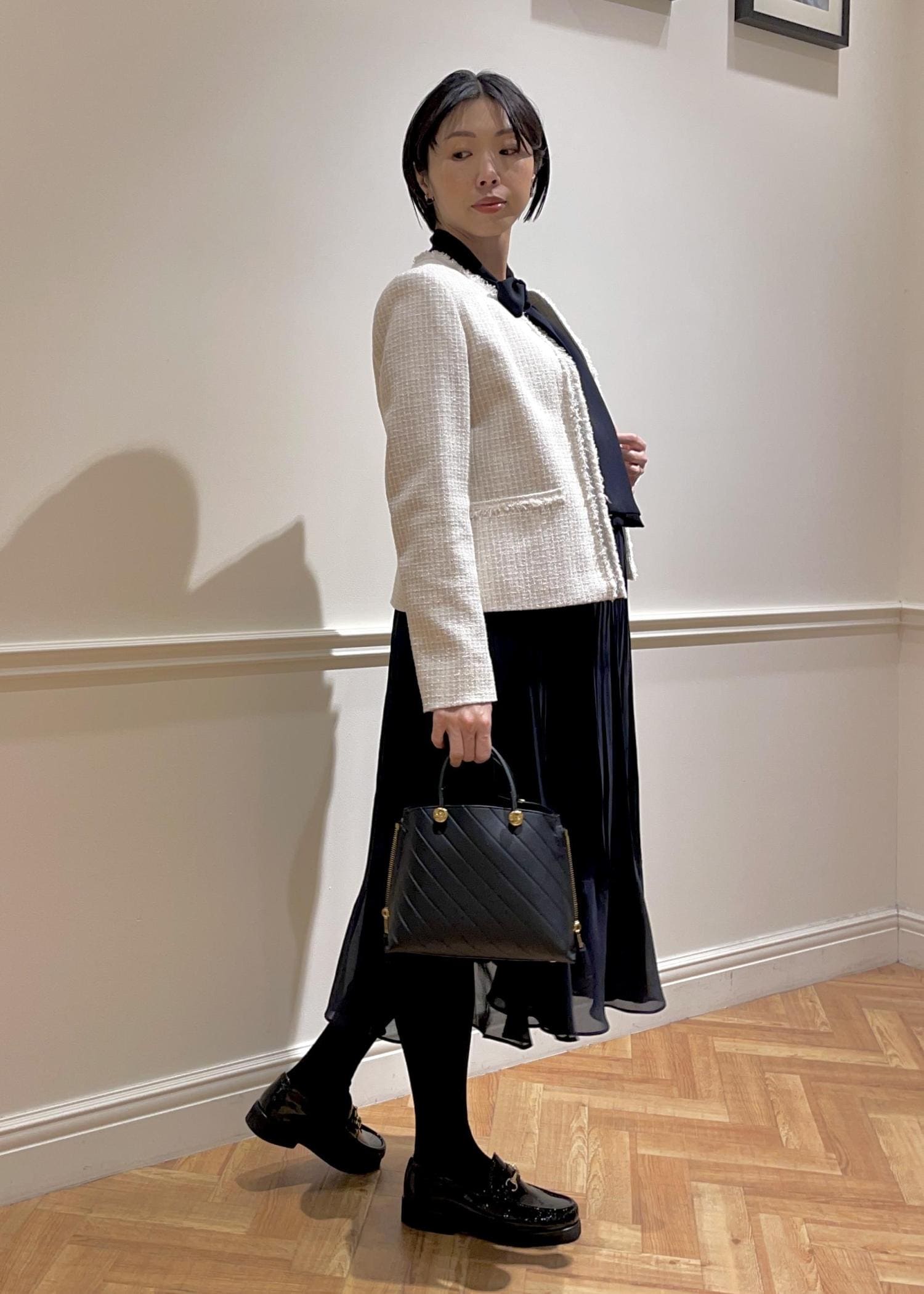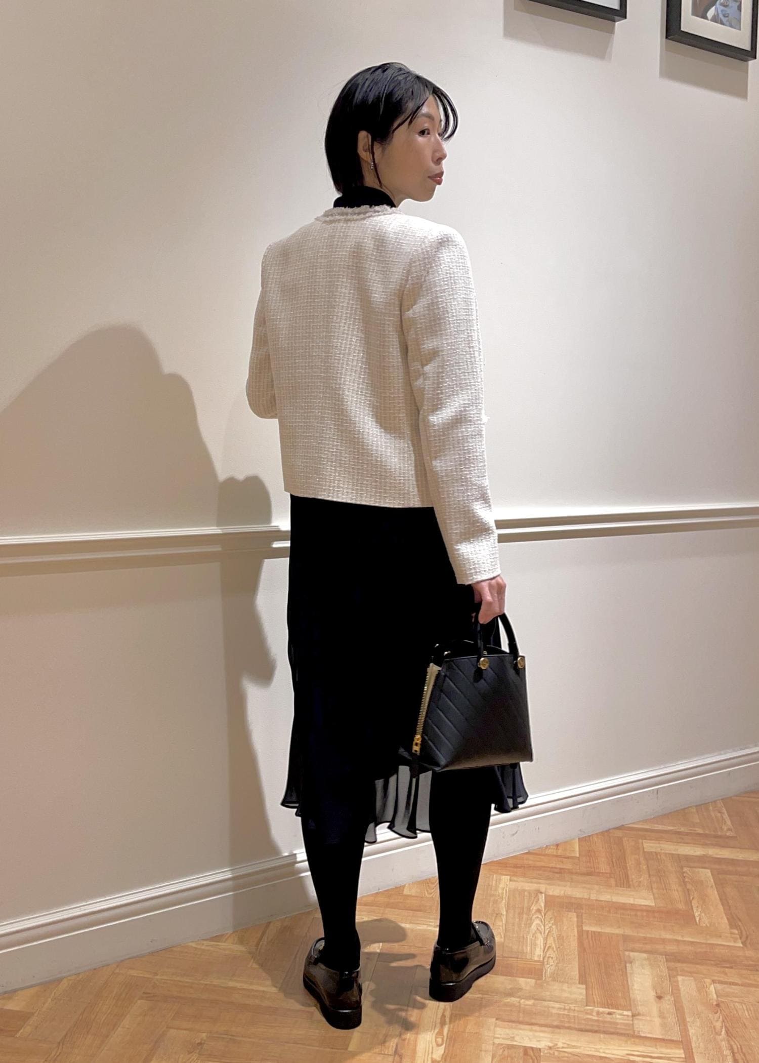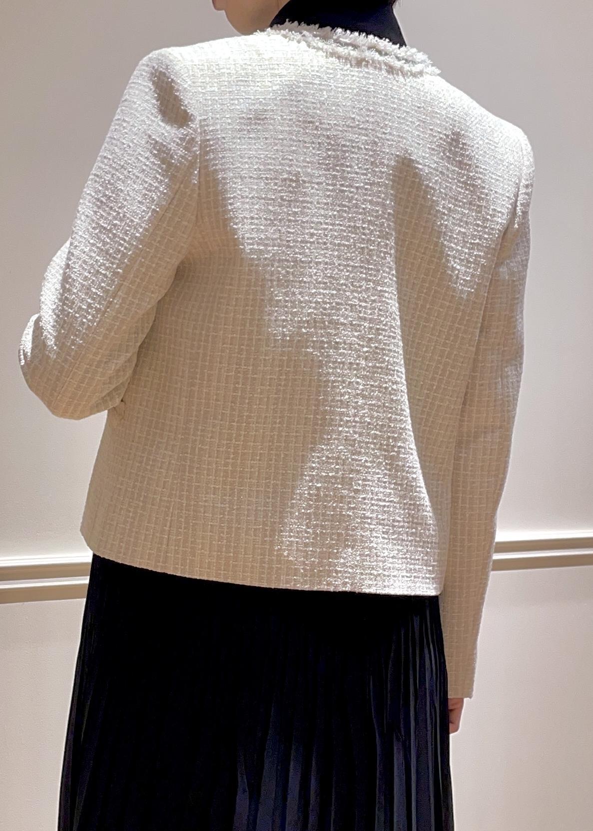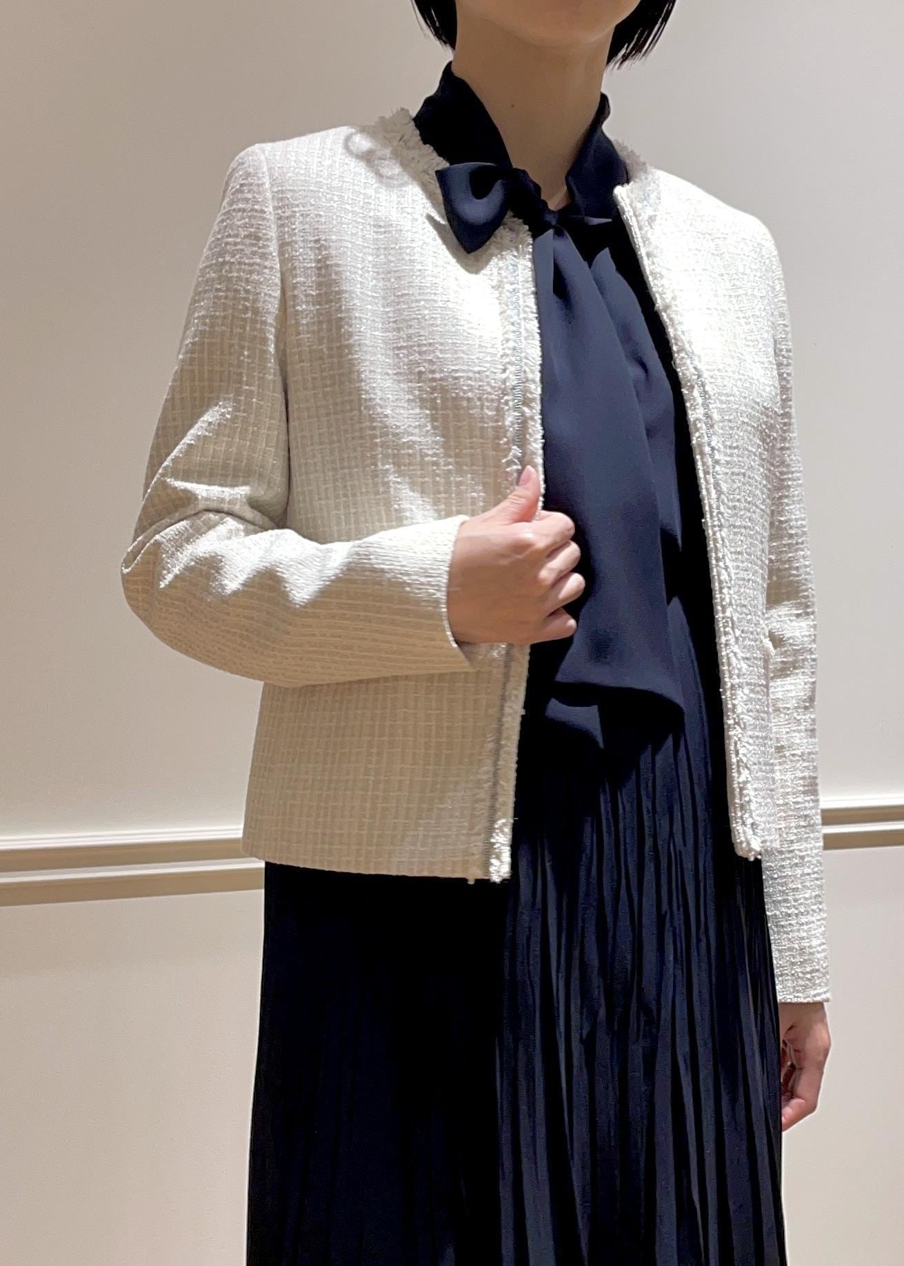 ROPÉミックスツイードノーカラージャケット/26SSオフホワイト / 38¥42,900レビュー華やかなツィード生地ですが、ラメ感がさり気なく高級感のある素材感です。