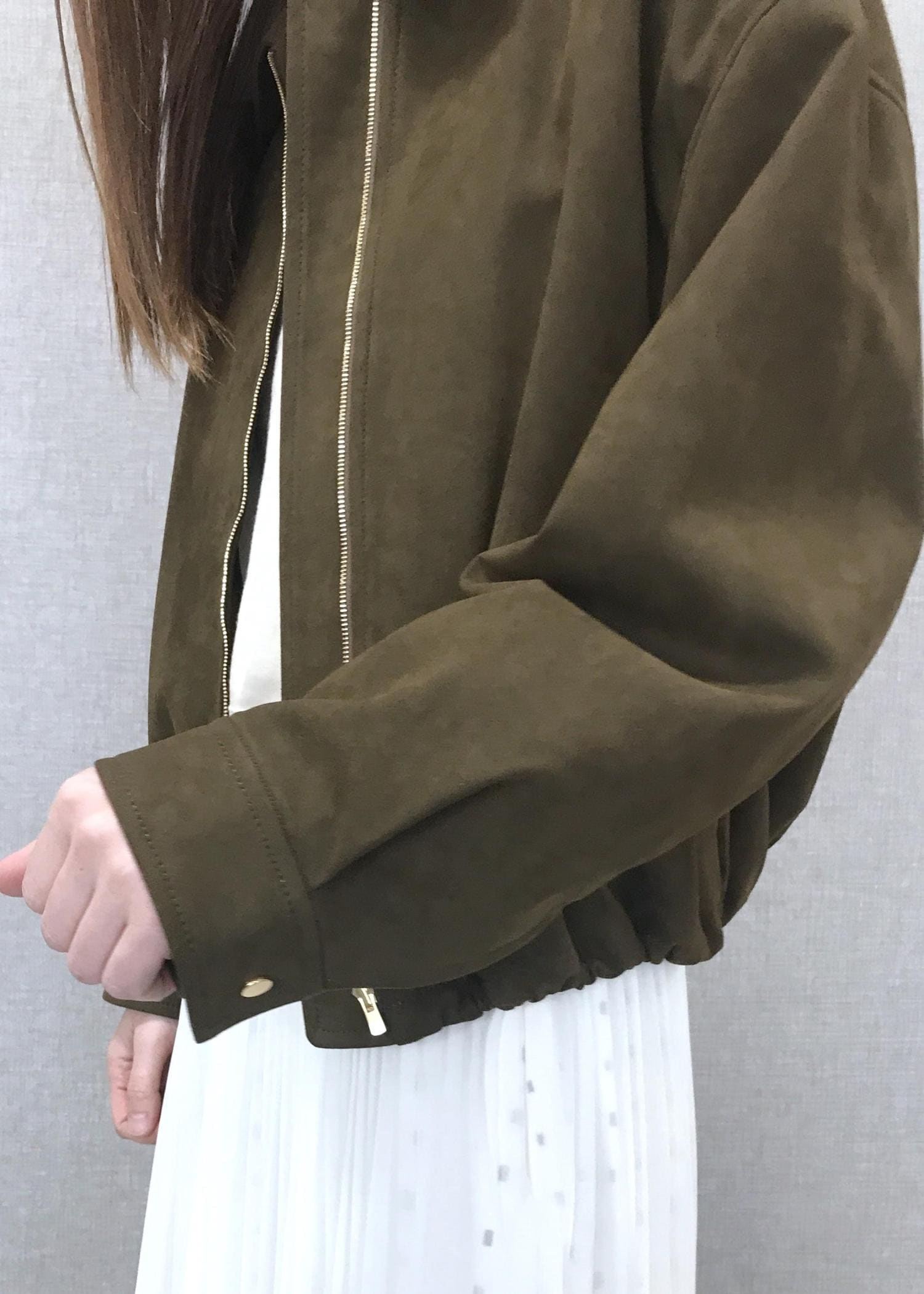 ROPÉスエードライクブルゾンダークブラウン / F¥64,900レビュー丈は裾を絞ってよりコンパクトにもできます。身頃、袖周りはゆったりめでインナー使いを気にせず羽織れます。