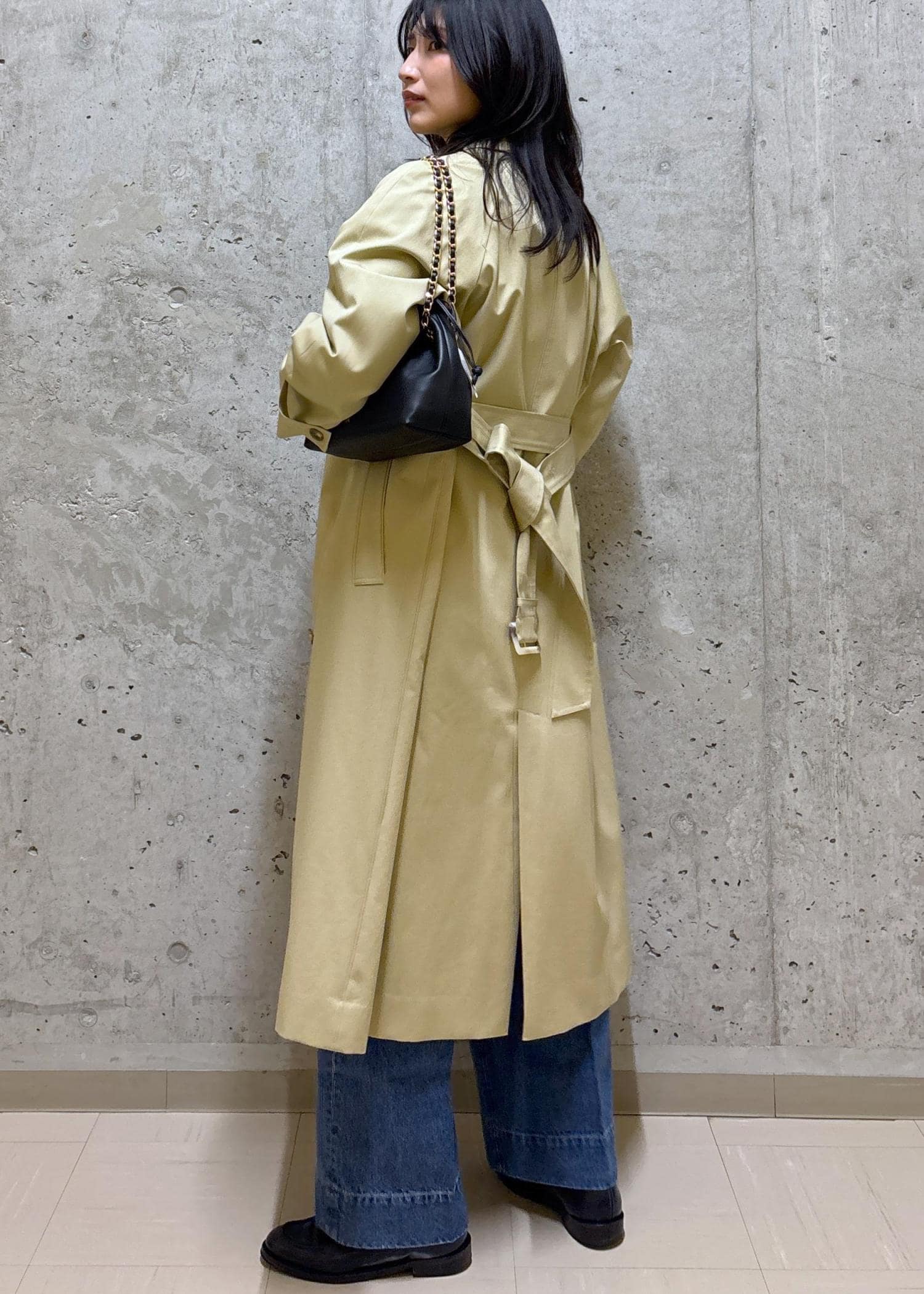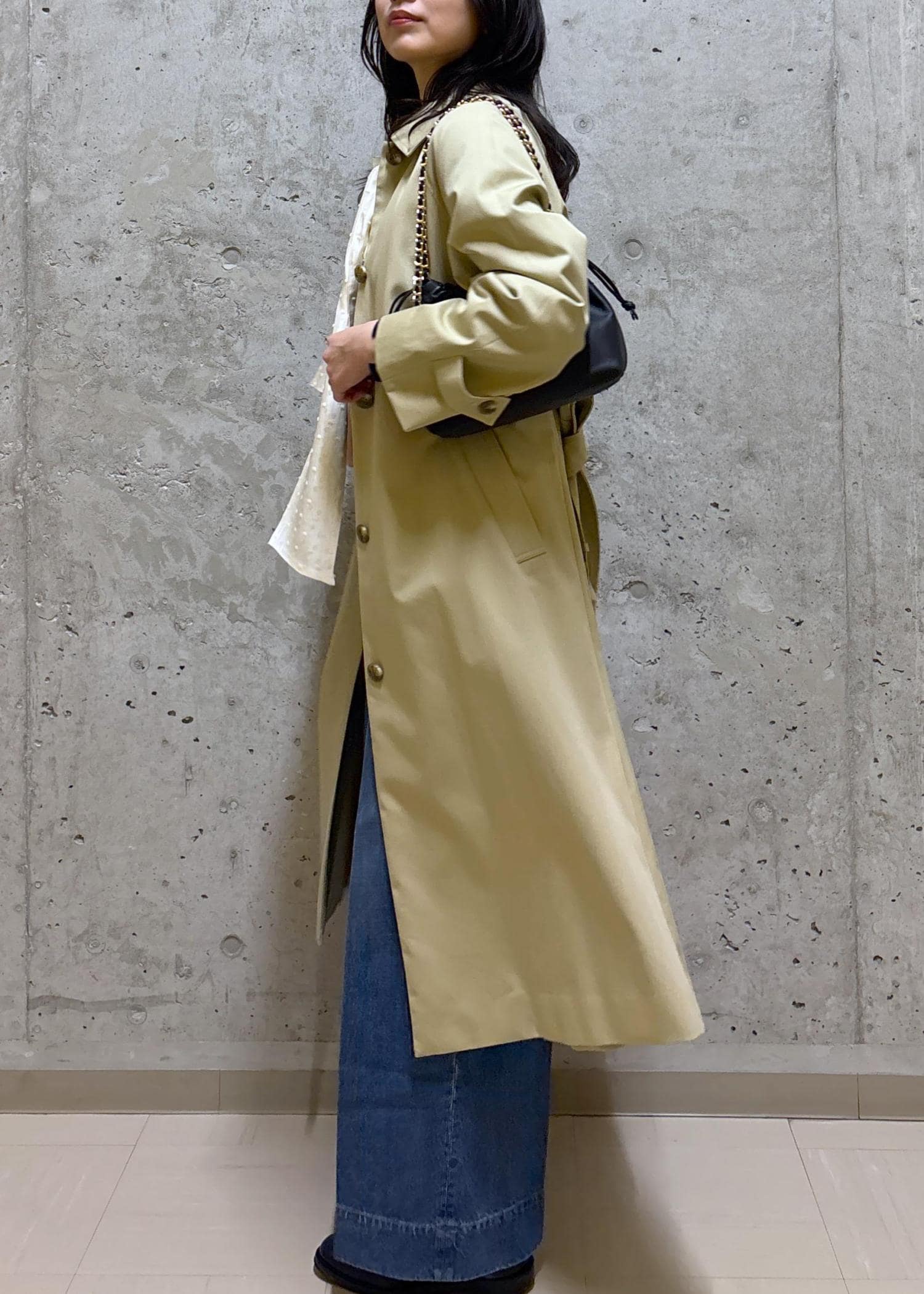 ステンカラーコート×ボウタイで上はきれいめ、