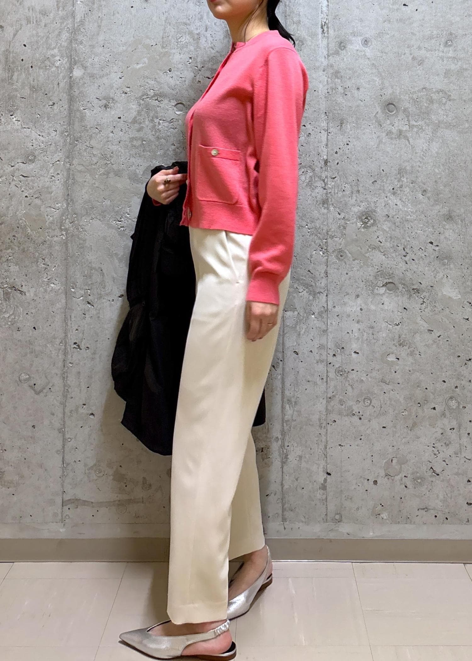 中はウールカシミヤカーディガンで防寒は残しつつ、