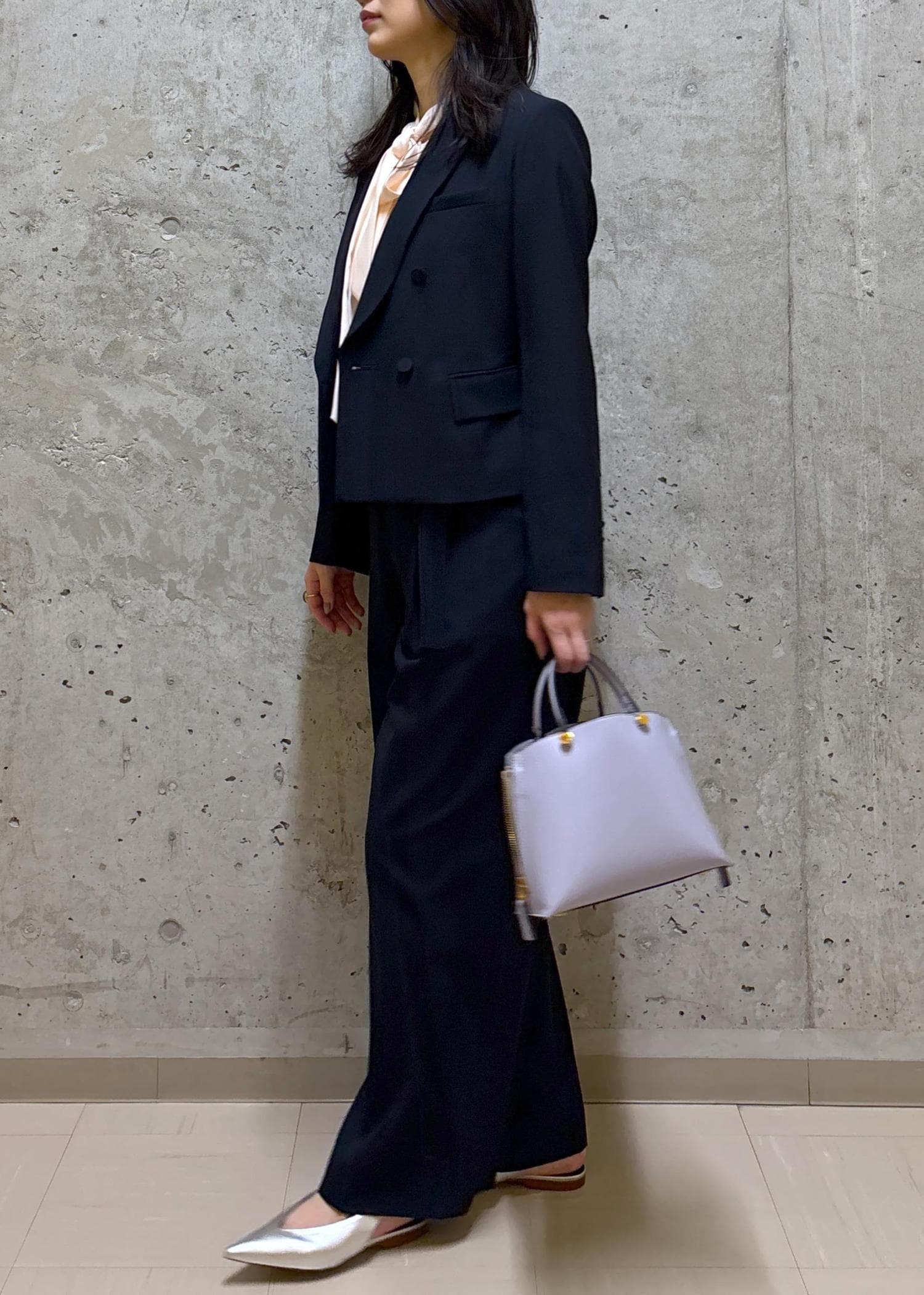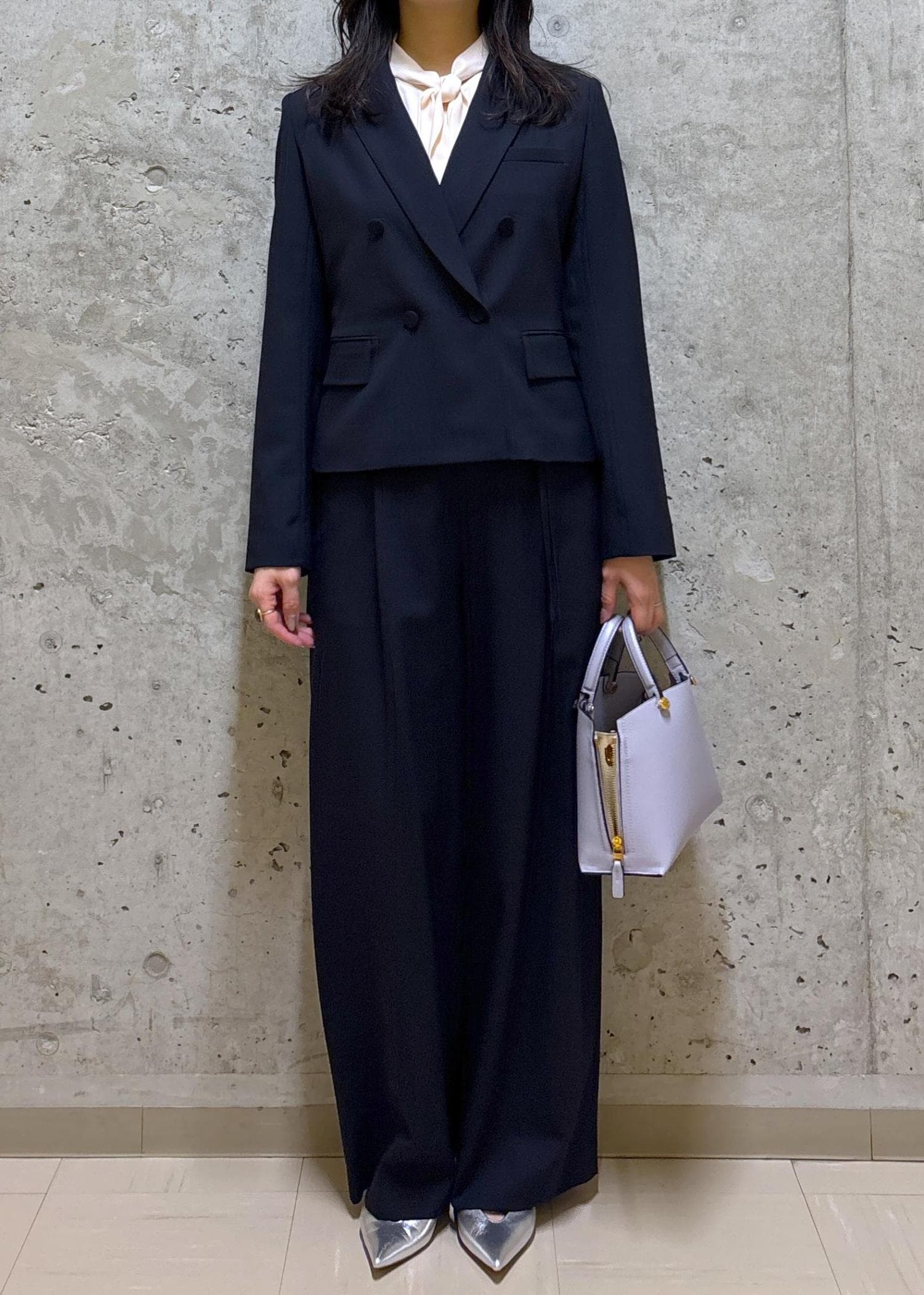 ダブル仕様ですが、身幅が大きすぎないのでシャープな印象にまとまります。