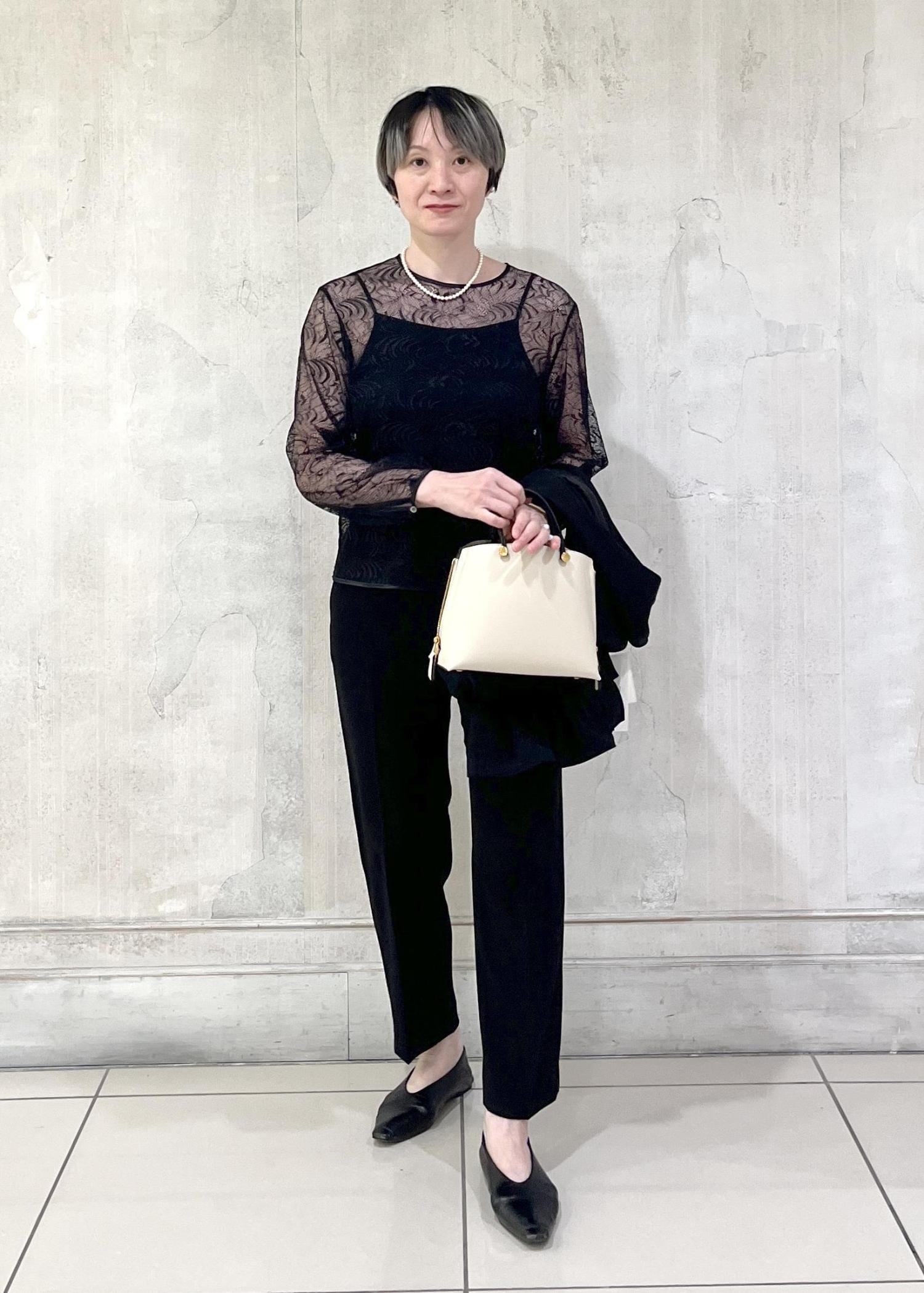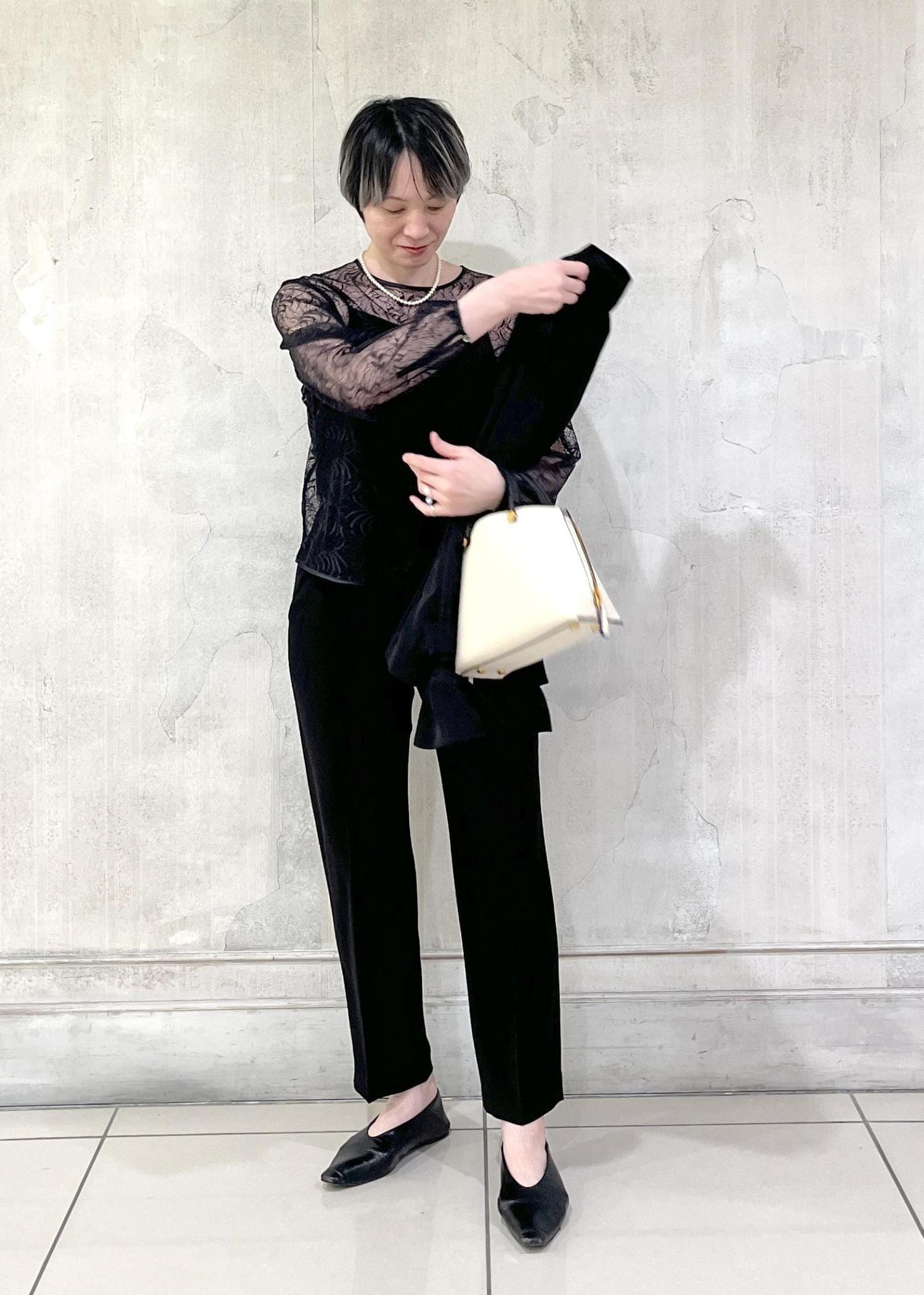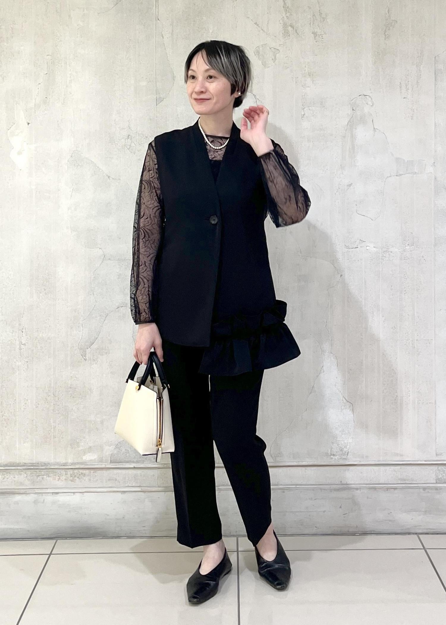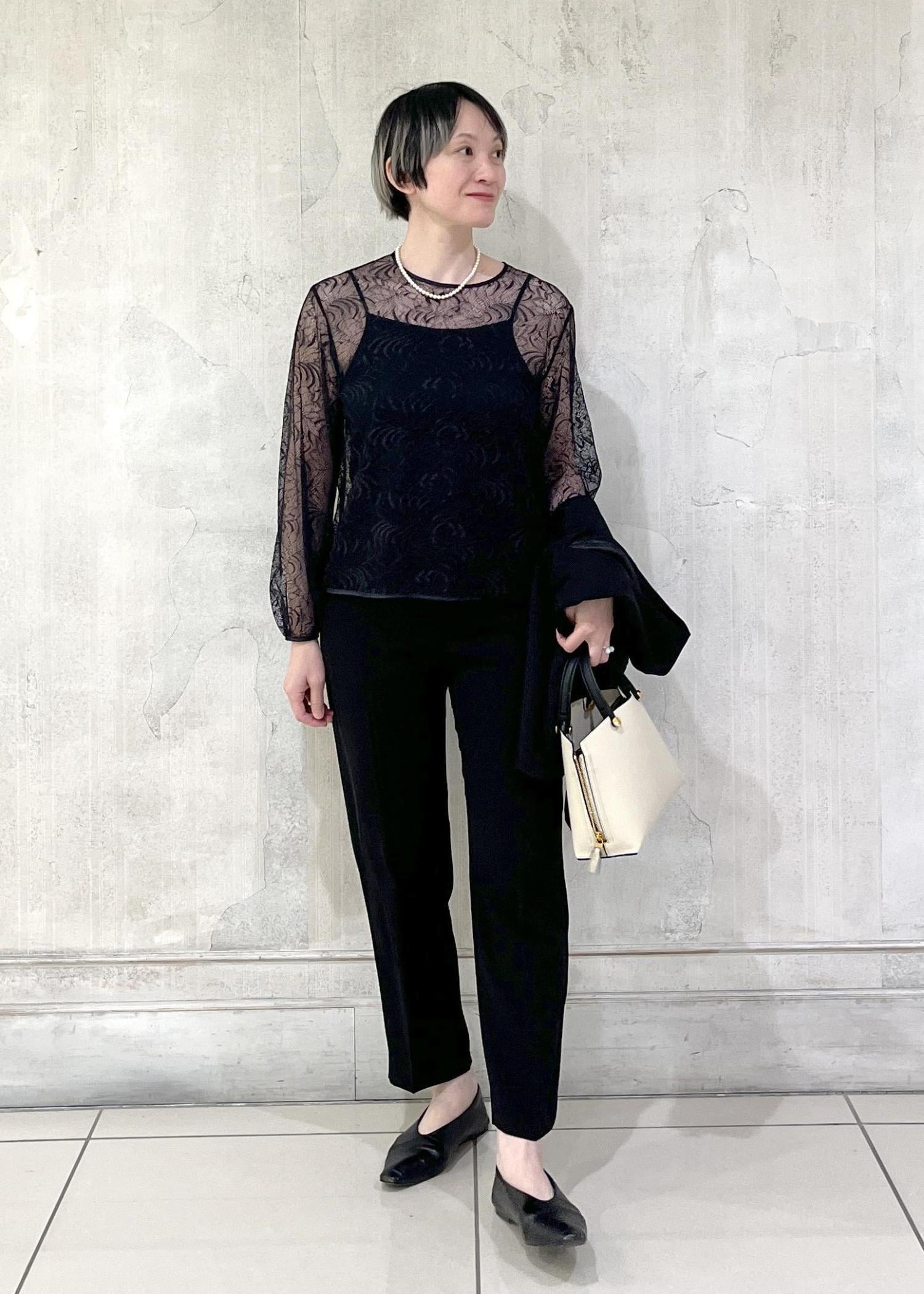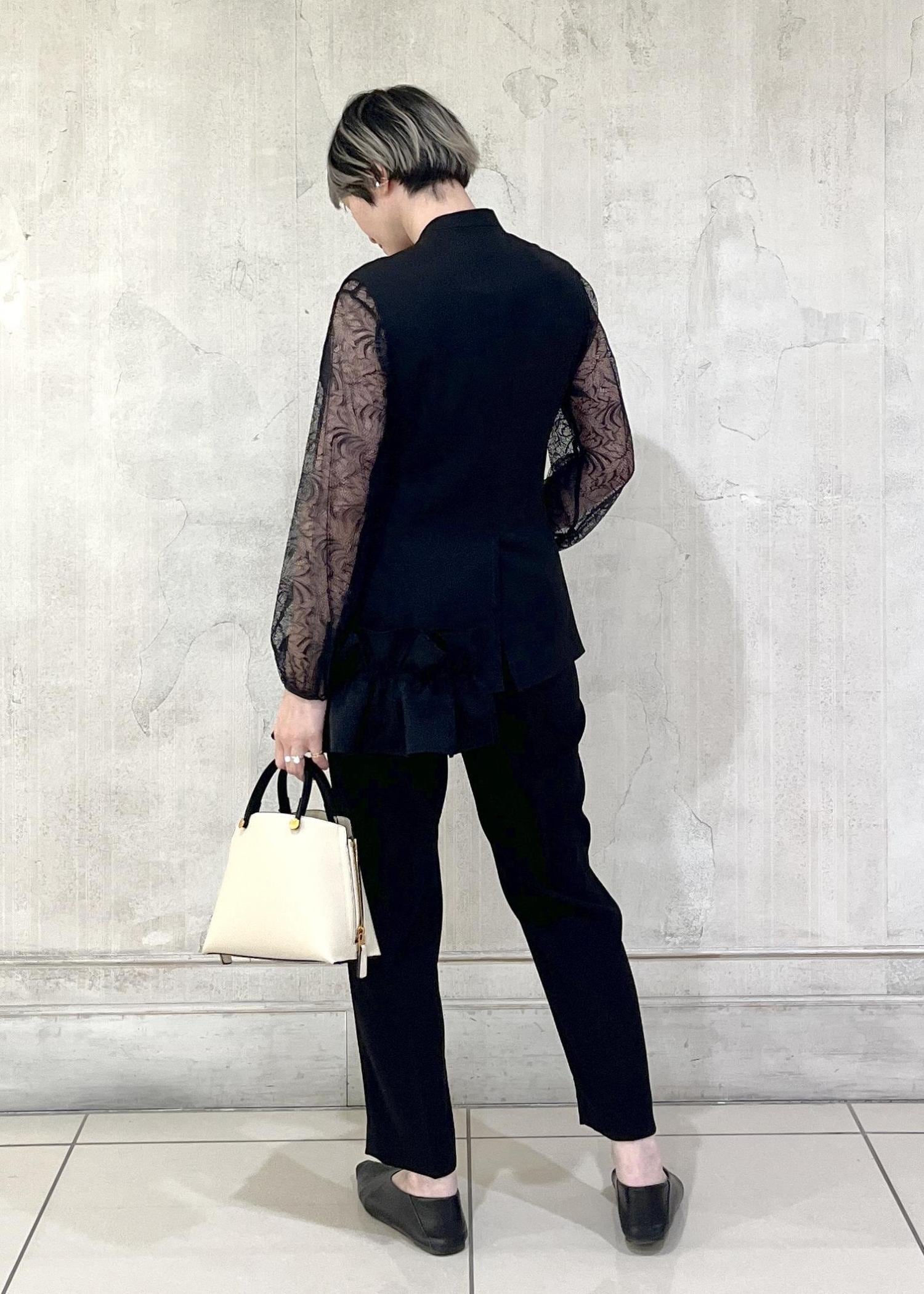 細身のラインのパンツでも、ゆったりしたワイドパンツでも、エレガントな雰囲気を演出してくれます。