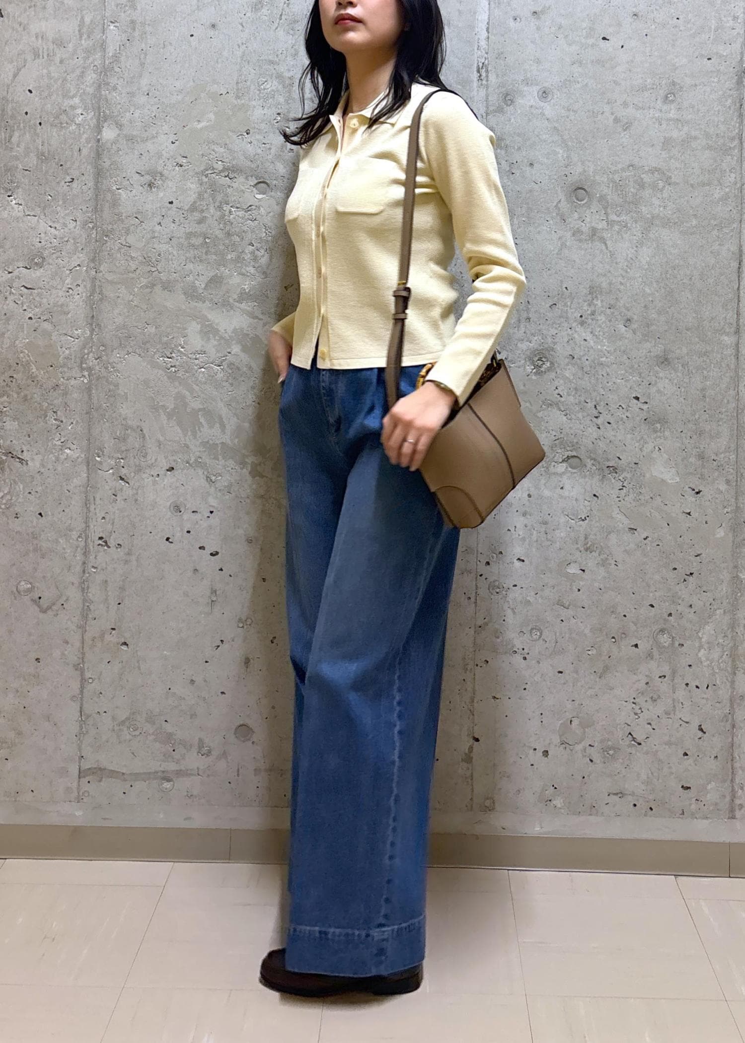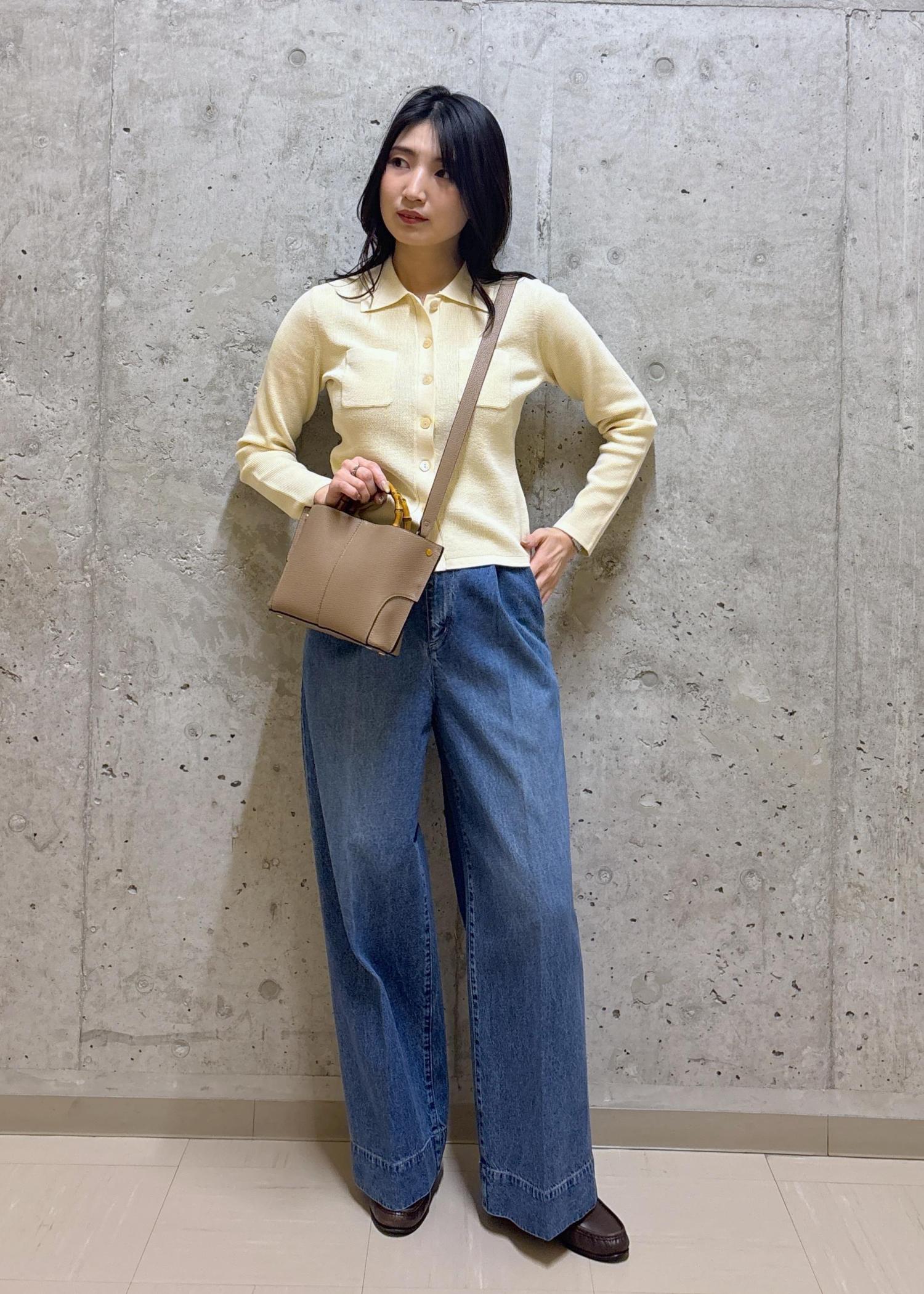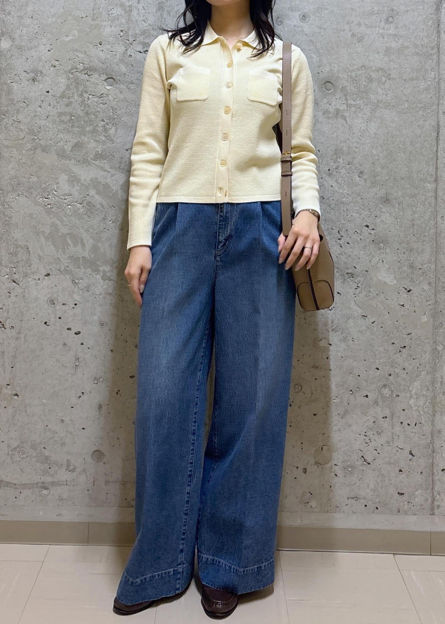 襟付きできちんと感のあるニットは柔らかいベージュで春っぽく