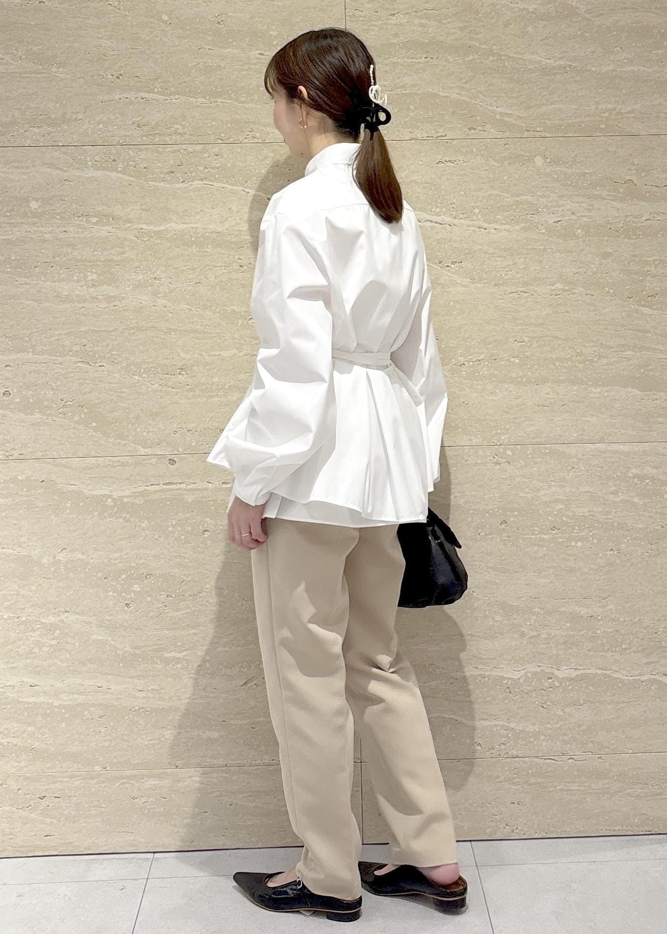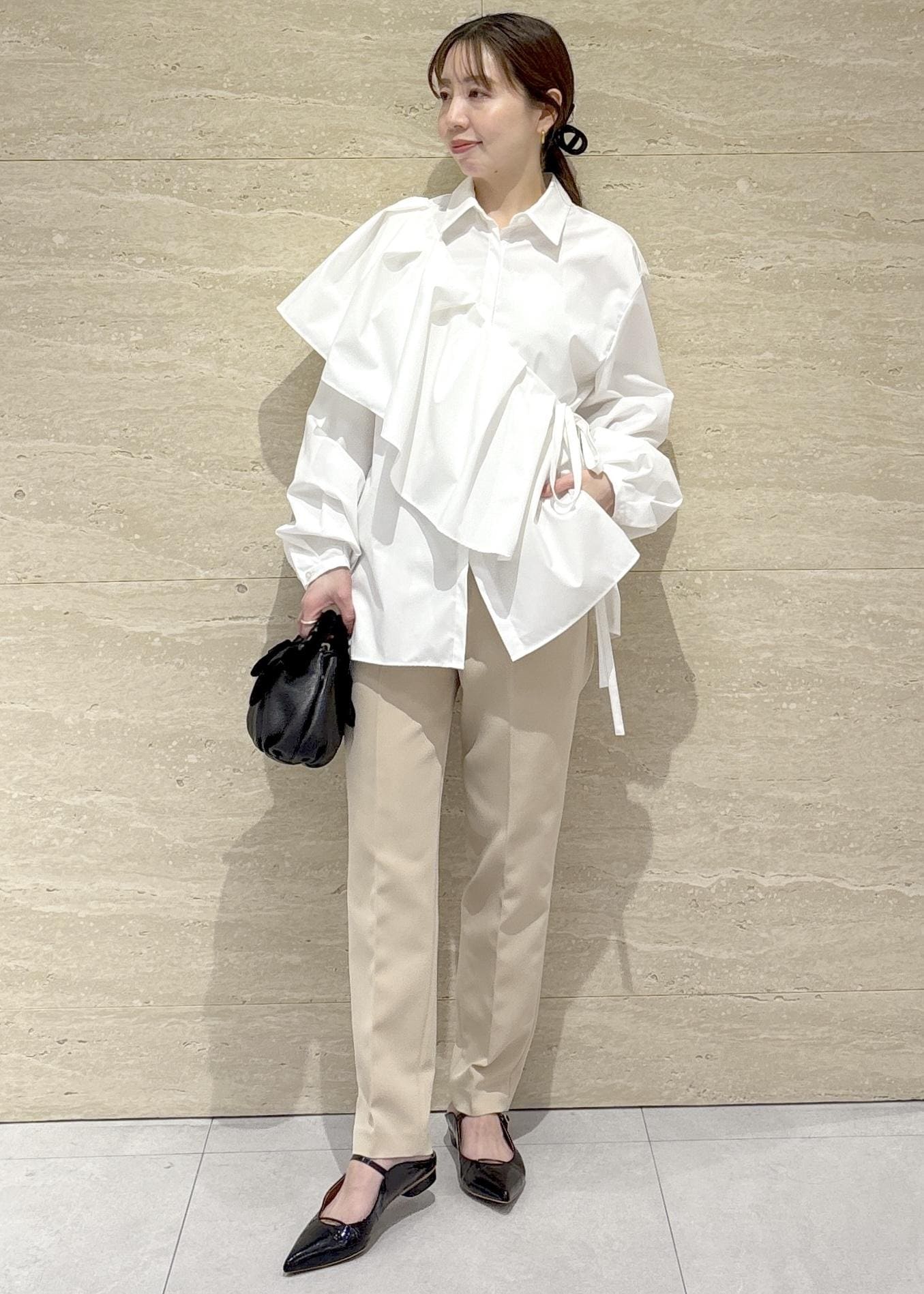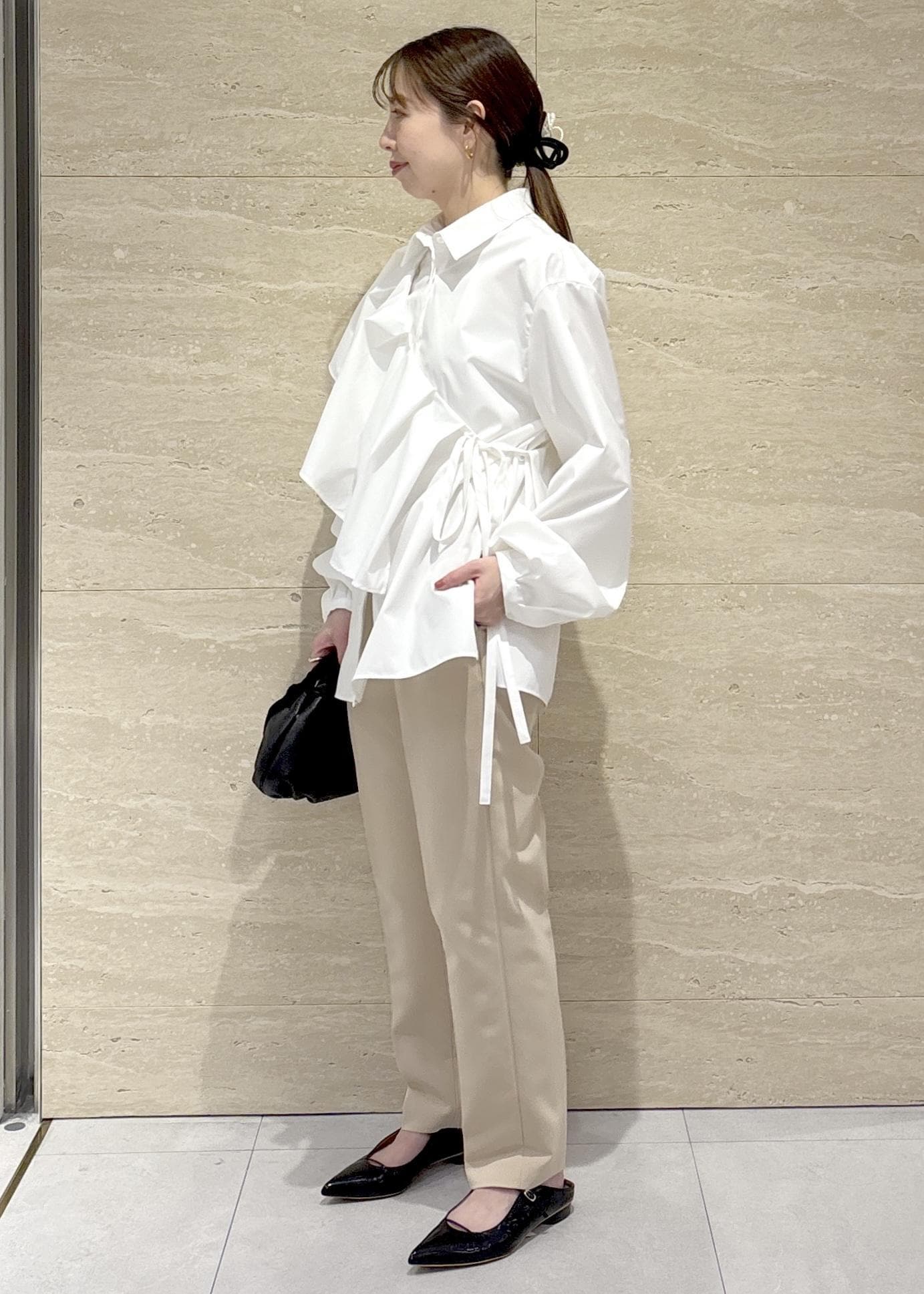 ベージュパンツ合わせで柔らかい印象になるよう意識して、小物は黒で全体を引き締めました。
