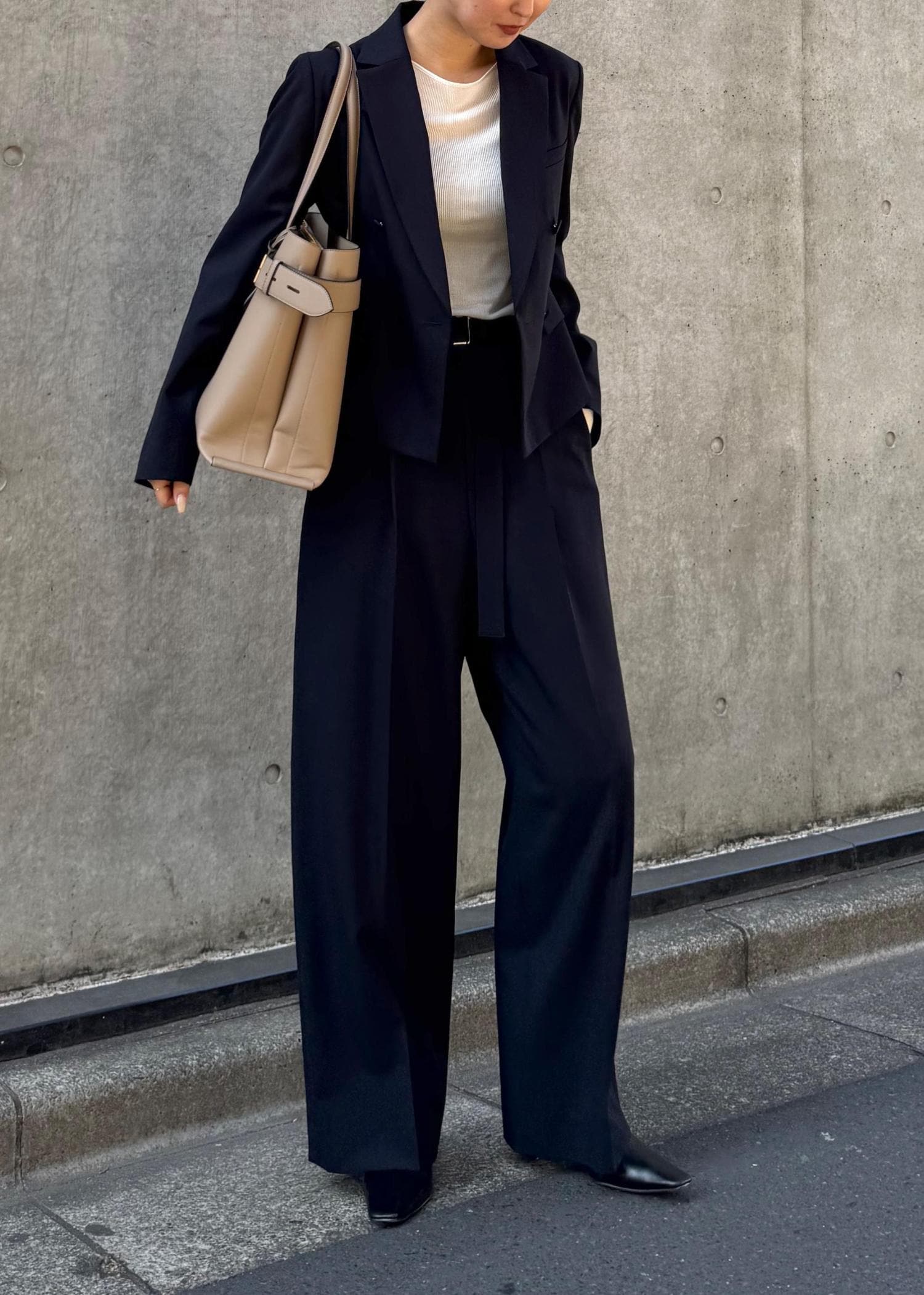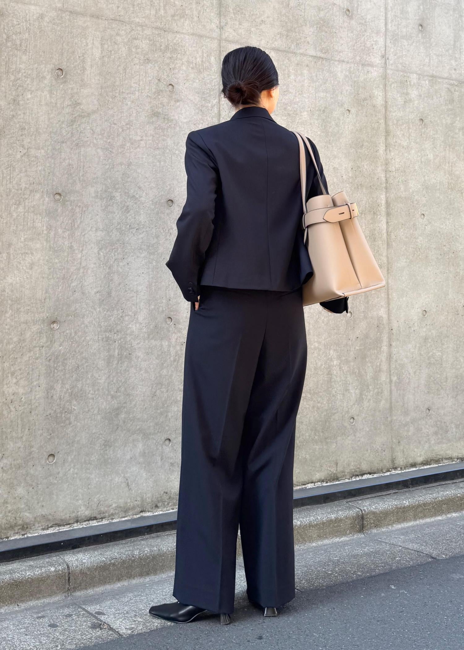 やや短め丈のジャケットにハイウエストパンツでスタイルアップ効果も。